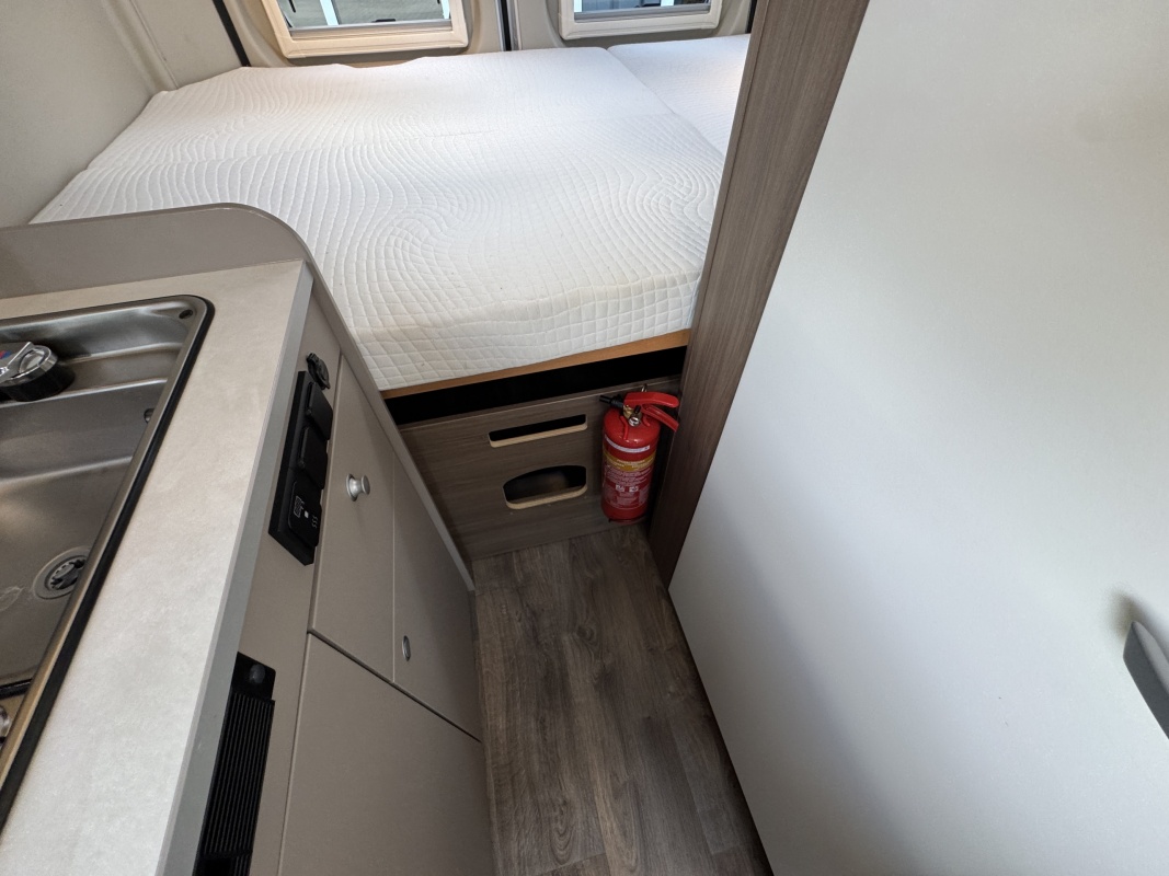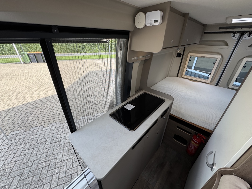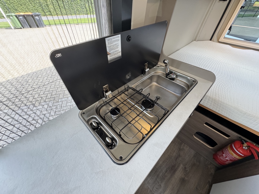 De keuken is erg ruim voor de grootte van het voertuig. Hij biedt veel ruimte om te koken en is uitgerust met een 2-pits kookplaat, waardoor het bereiden van maaltijden onderweg een plezier wordt.