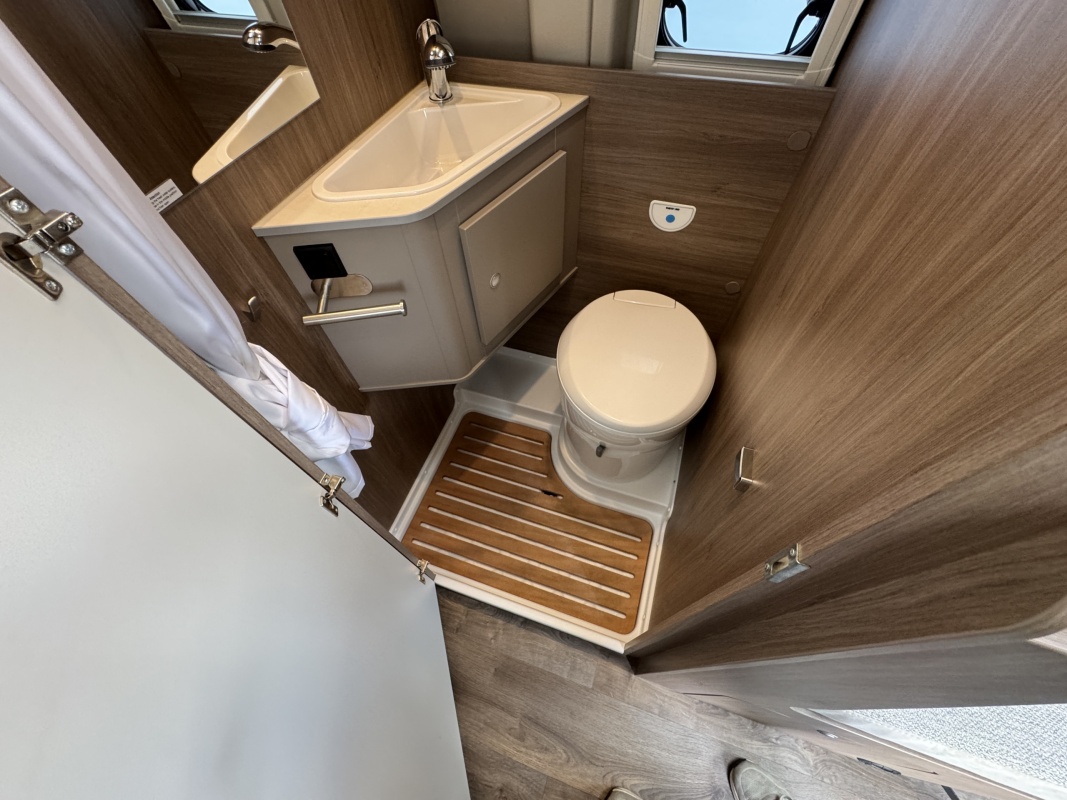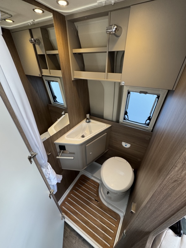 Ondanks de compacte afmetingen van het voertuig biedt de CV540 een goed doordachte en functioneel uitgeruste badkamer. Hij is ontworpen om de functionaliteit te maximaliseren met een minimum aan ruimte, zonder afbreuk te doen aan het comfort.
