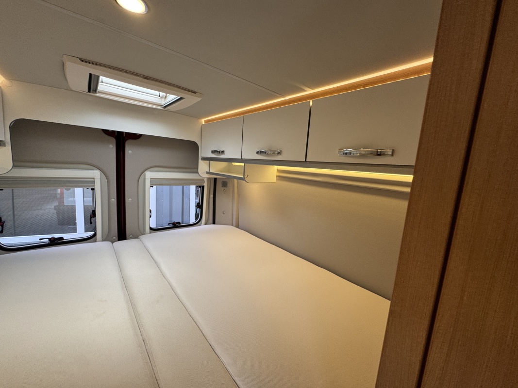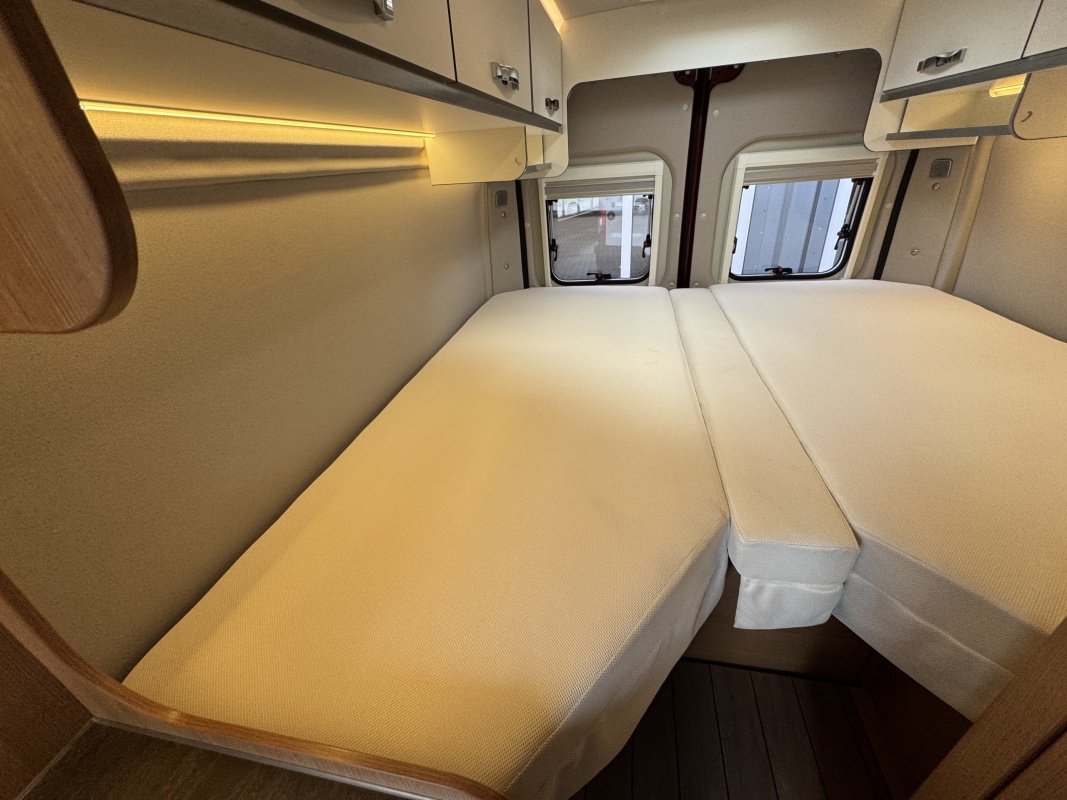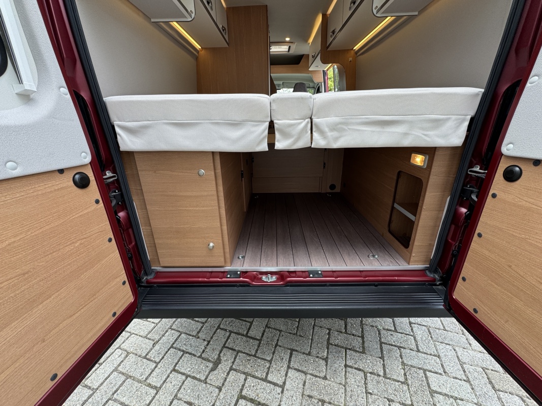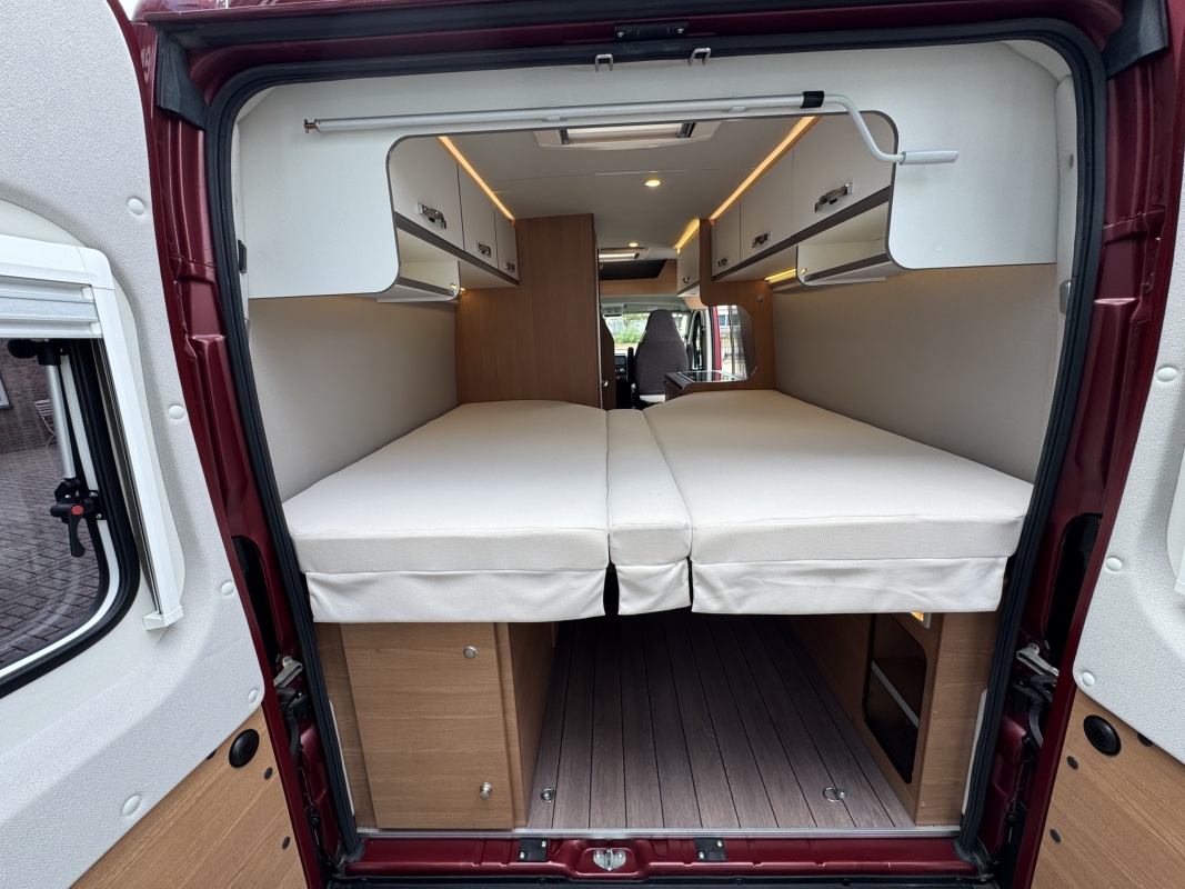 Achter twee royale enkele bedden met een gemakkelijke instap en een enorme opbergruimte eronder. Het bed is ook omhoog te klappen voor meer transportruimte.