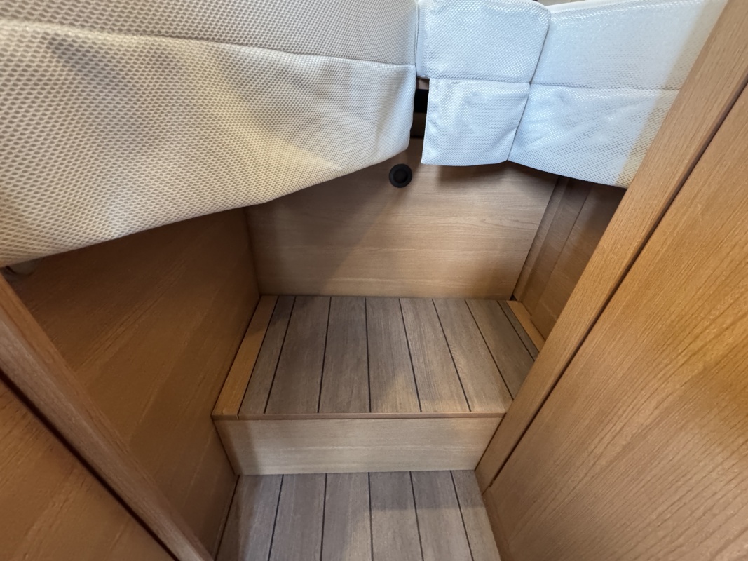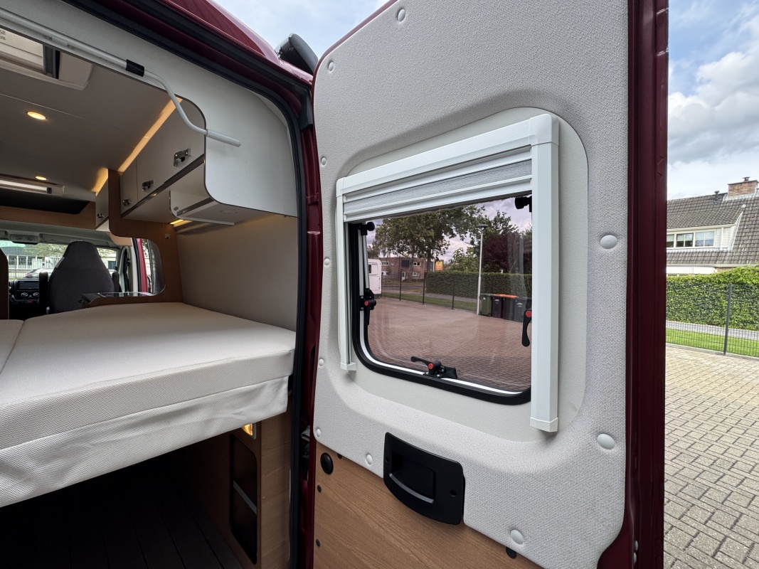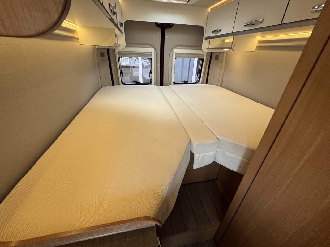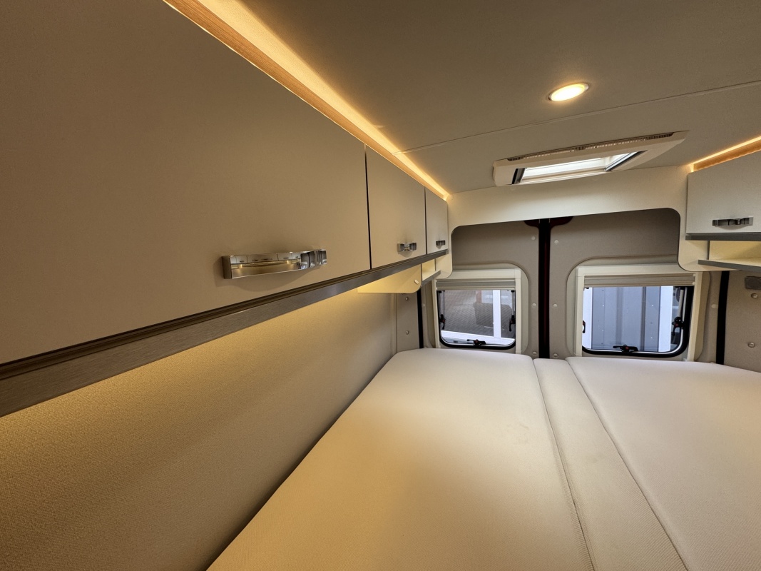Achter twee royale enkele bedden met een gemakkelijke instap en een enorme opbergruimte eronder. Het bed is ook omhoog te klappen voor meer transportruimte.