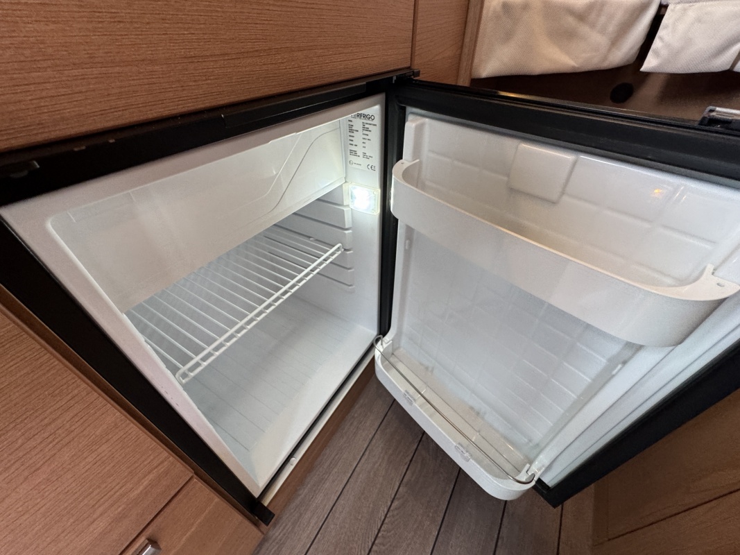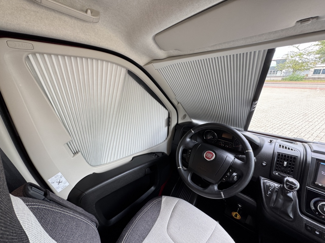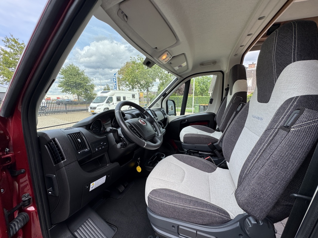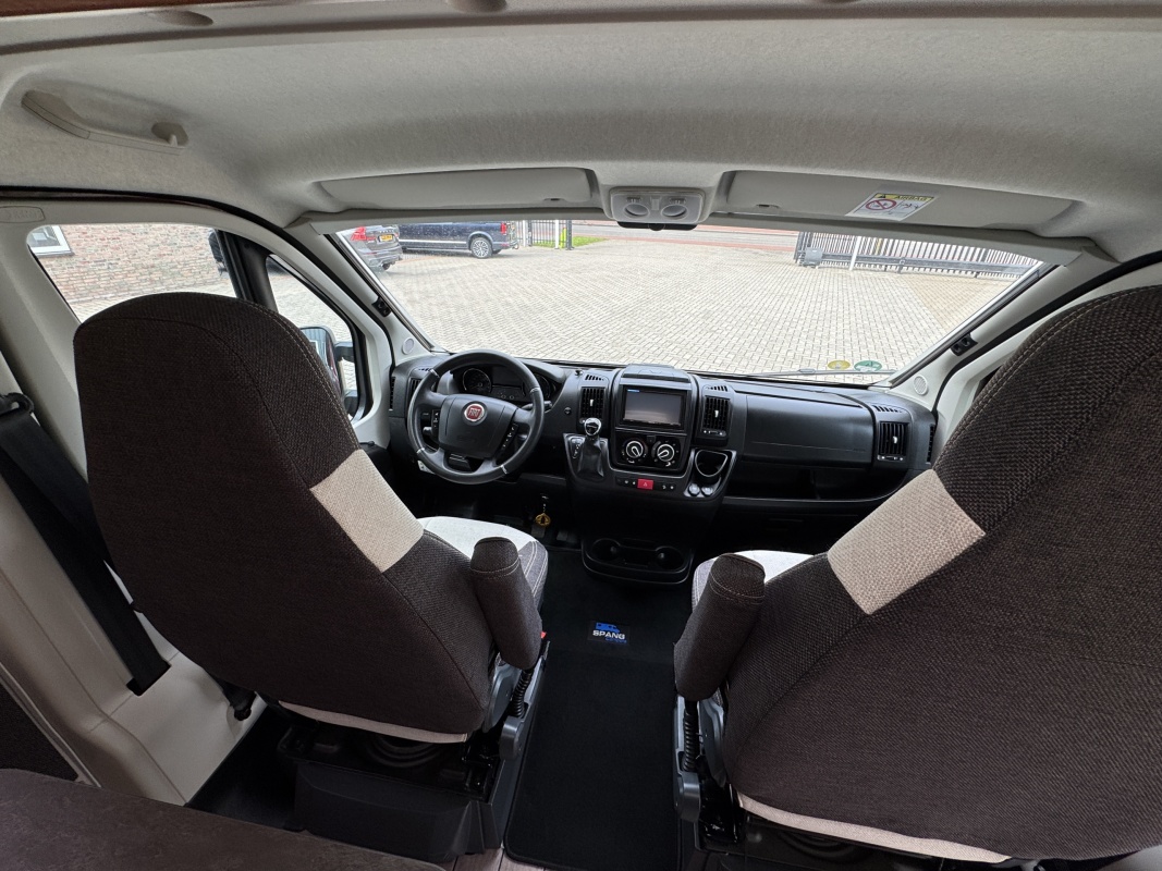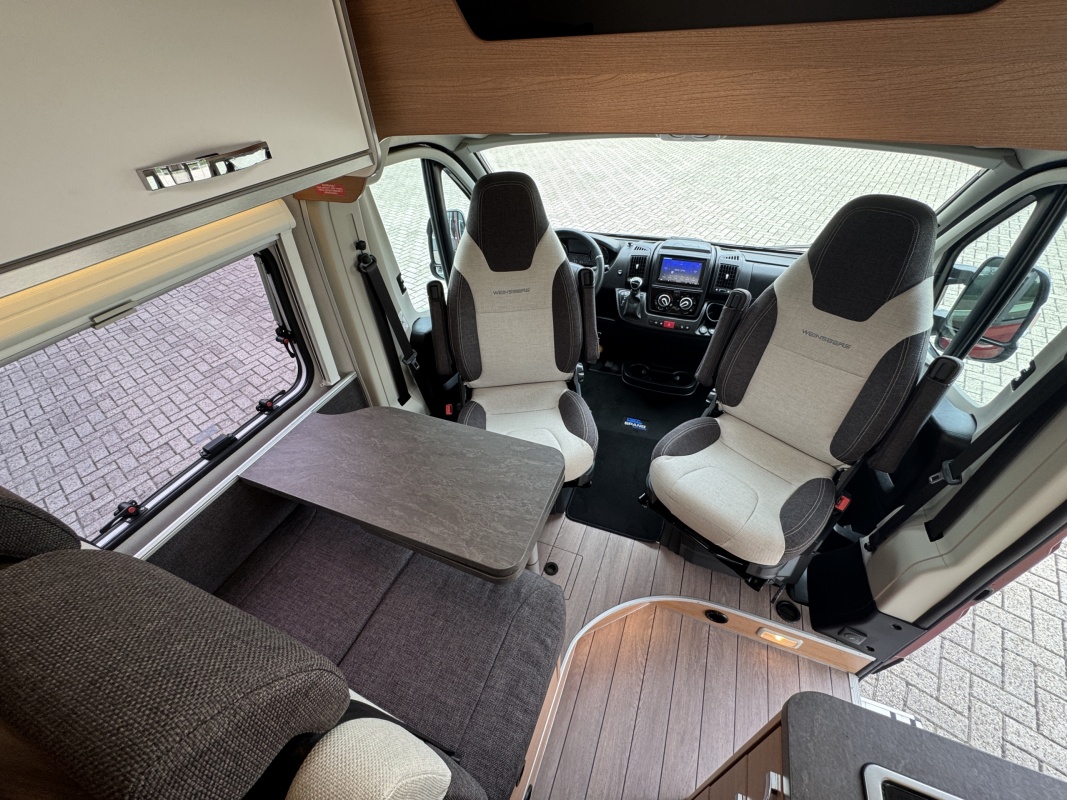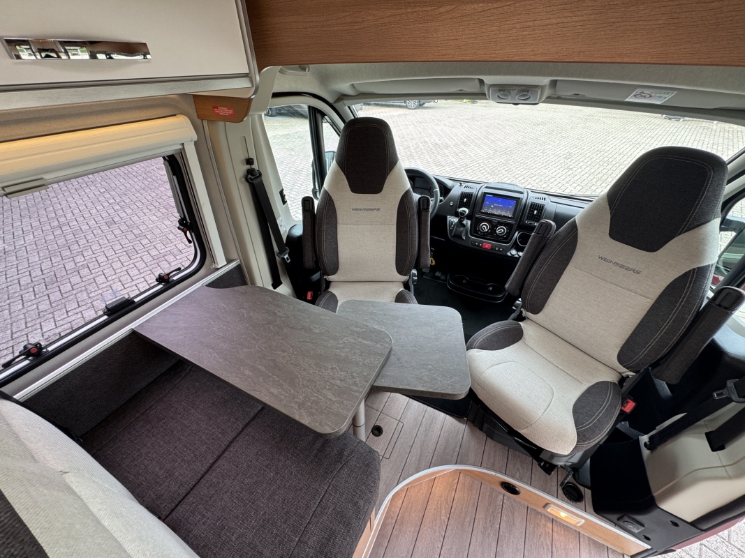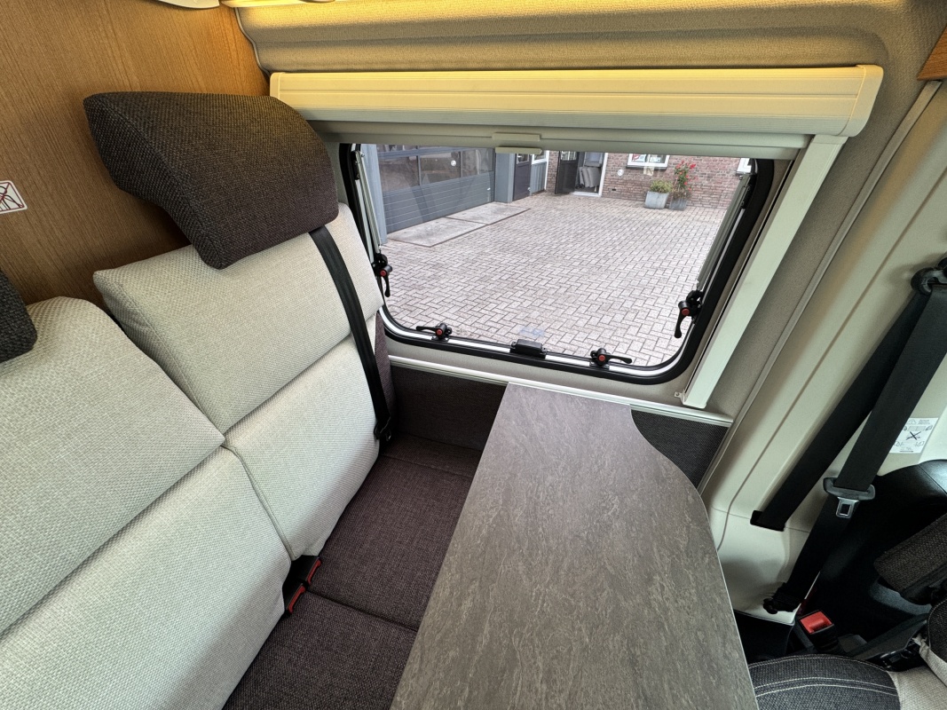 Voorin de cabine staan twee draai- en verstelbare comfortstoelen met armleuningen. Daarachter een halve dinette bank met tafel waarvan er een extra deel kan worden uitgedraaid naar de bijrijdersstoel wanneer de voorstoelen zijn gedraaid.