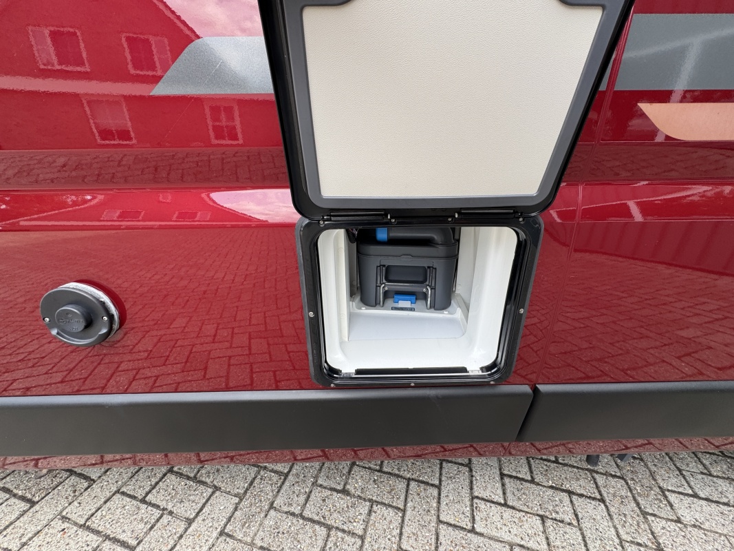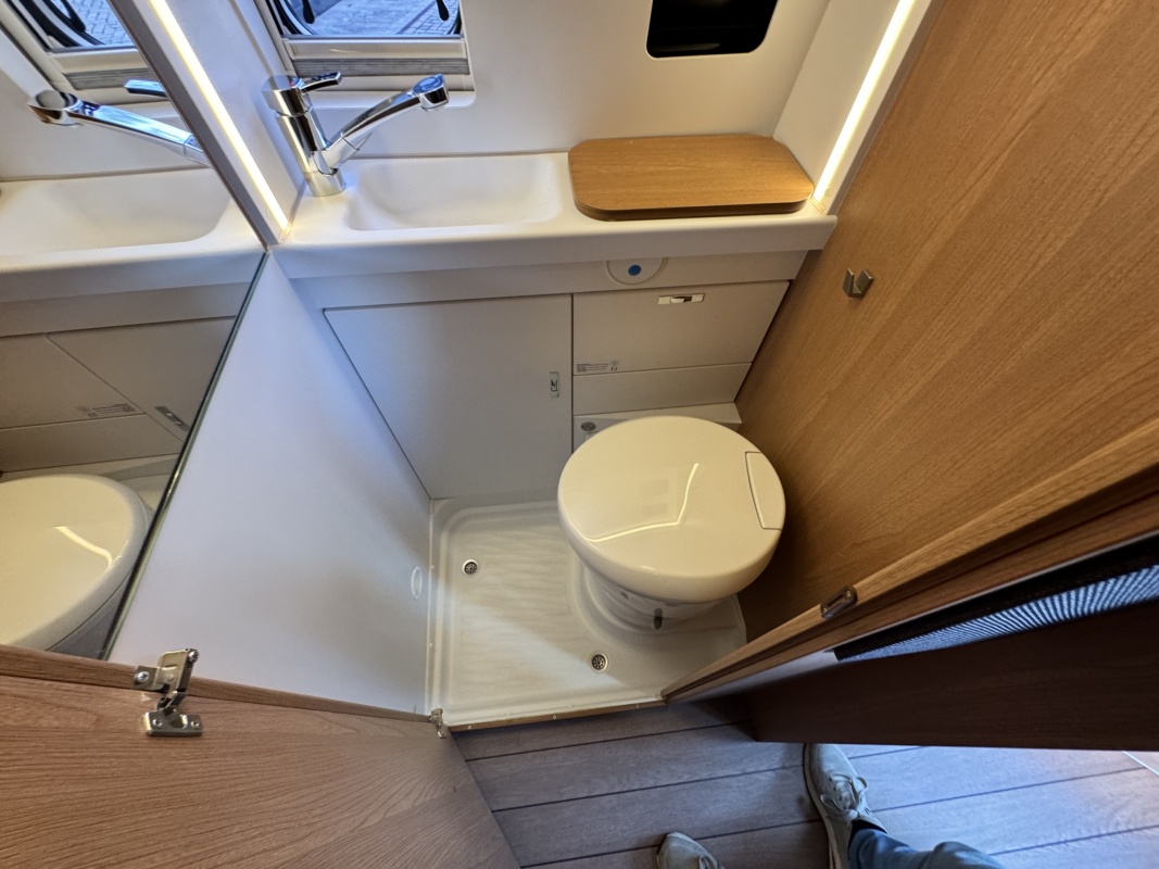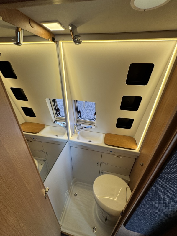 Tegenover de keuken is de natte cel met een Thetford cassettetoilet, een wastafel en douchemogelijkheid. De wastafelkraan is uittrekbaar zodat deze ook als douche dient. De toiletruimte beschikt over een raam, door het raam open te zetten is het ook heel eenvoudig om u buiten even af te douchen, een buitendouche.