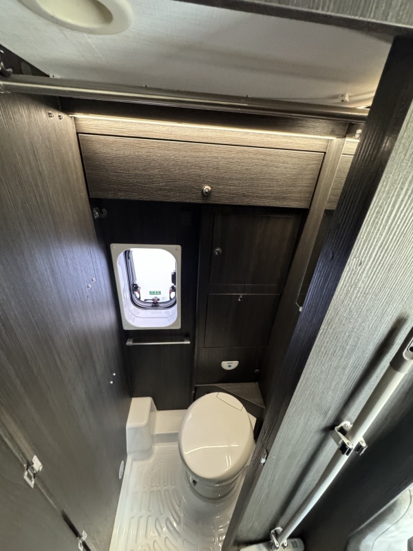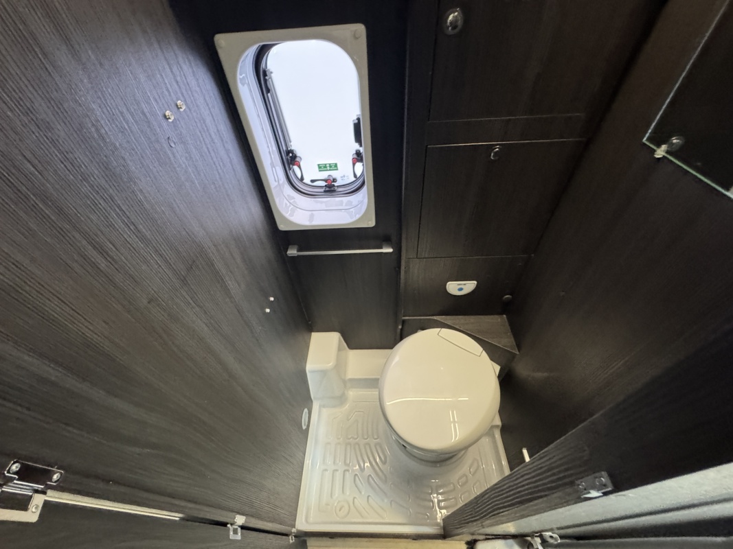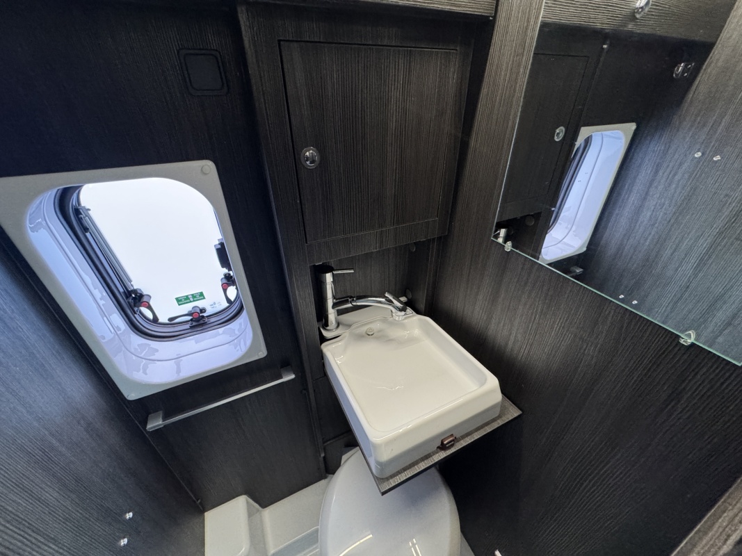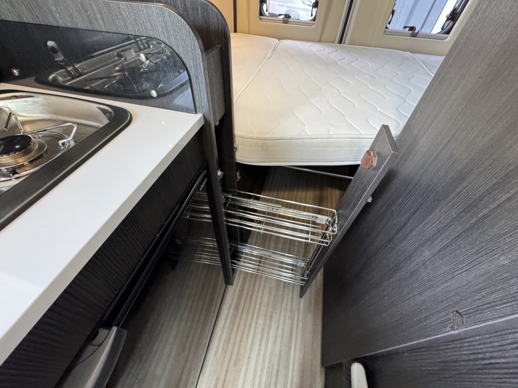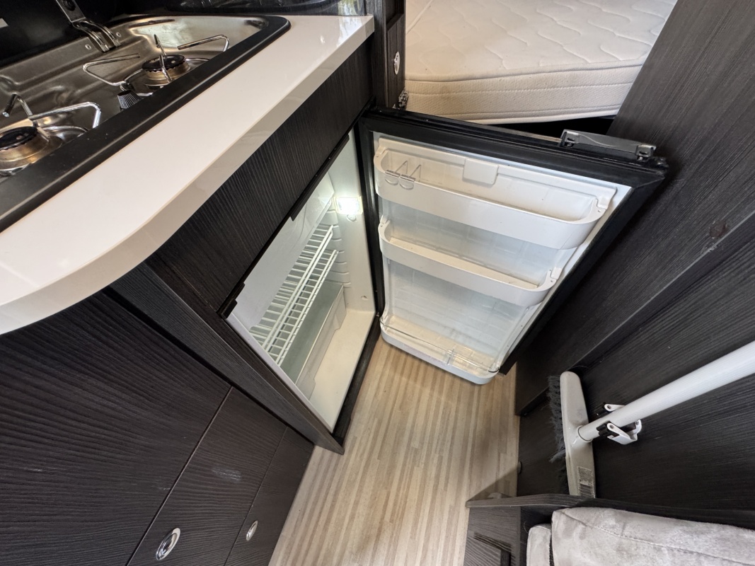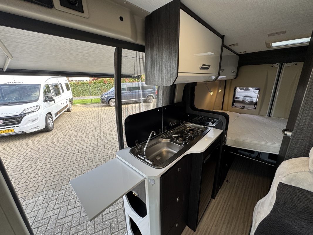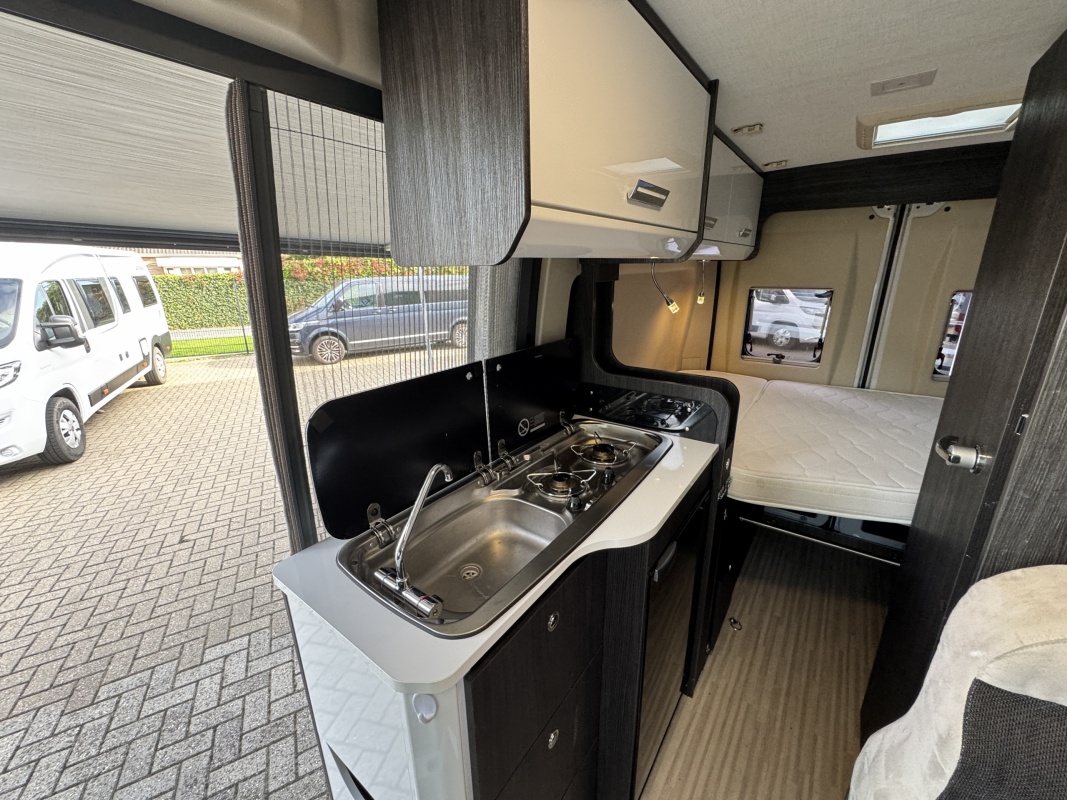 In het midden zit de keuken welke is uitgerust met een spoelbassin met mengkraan, een kooktoestel met glasafdekking, een koelkast met vriesvak en veel kast en opbergruimte. Tegenover de keuken is de natte cel met een Thetford cassettetoilet, een wastafel en de mogelijkheid om te douchen.