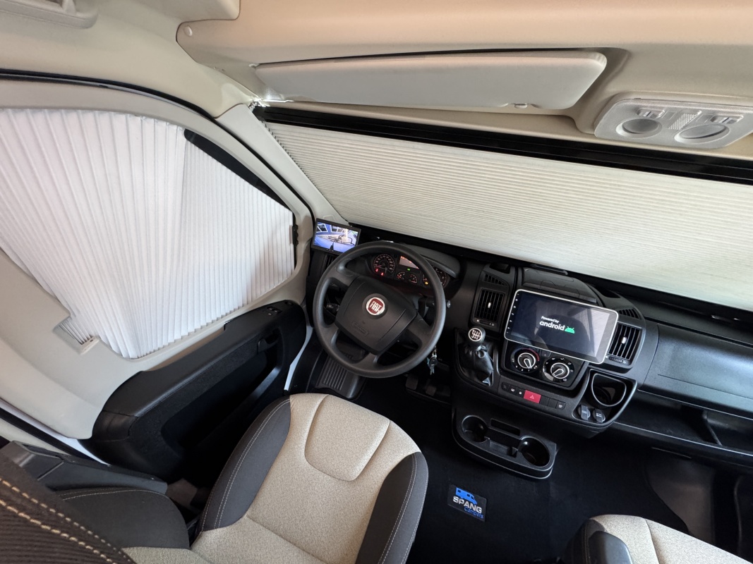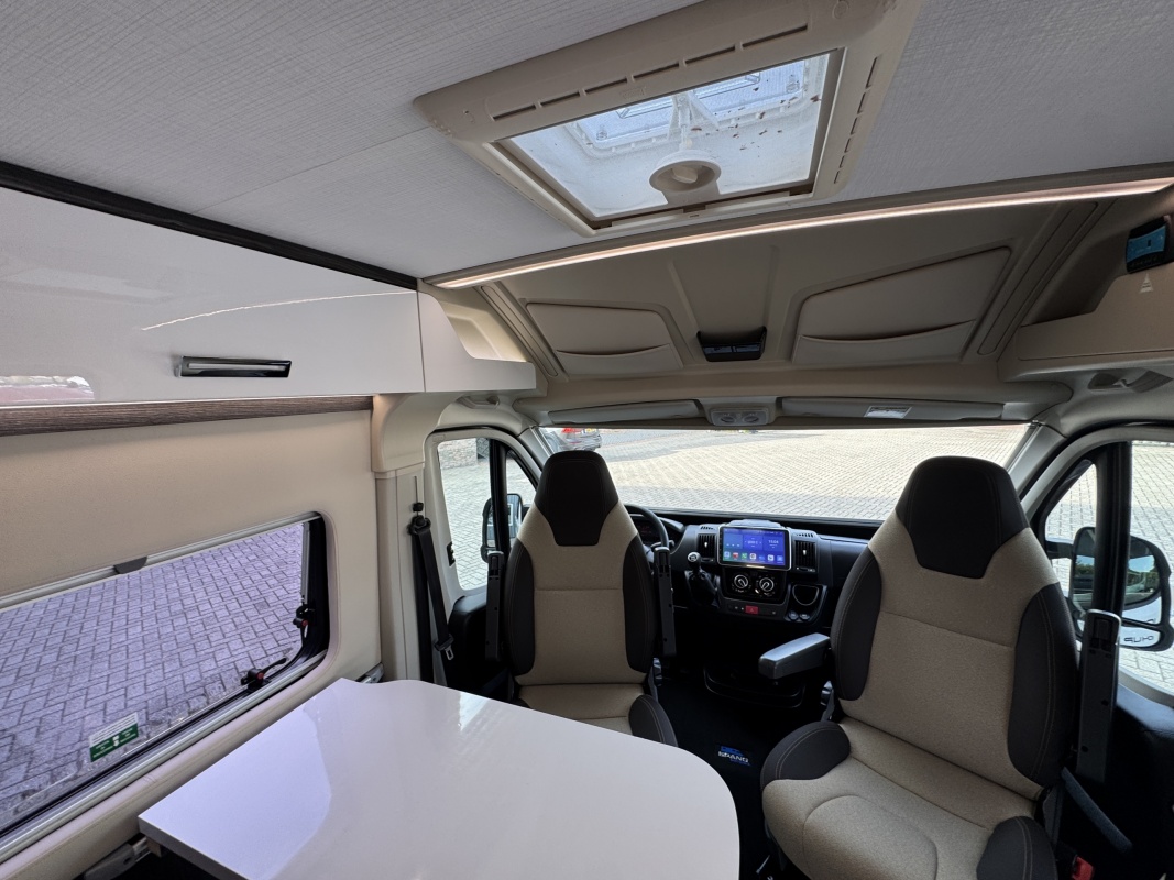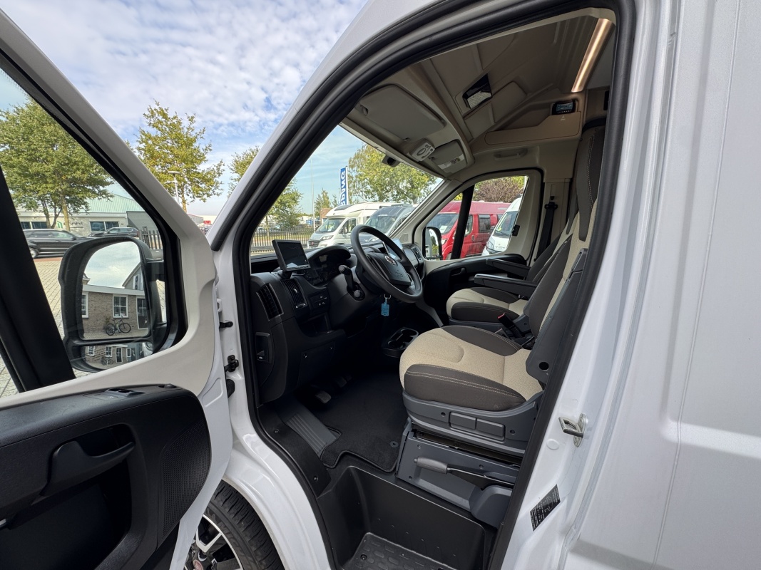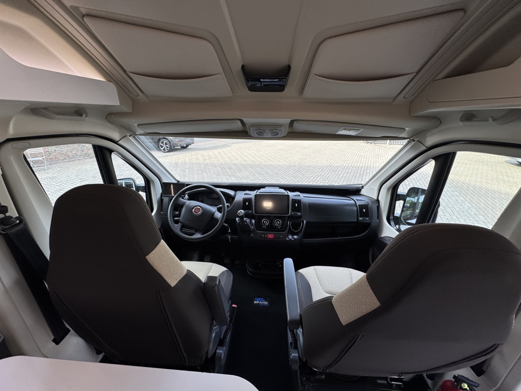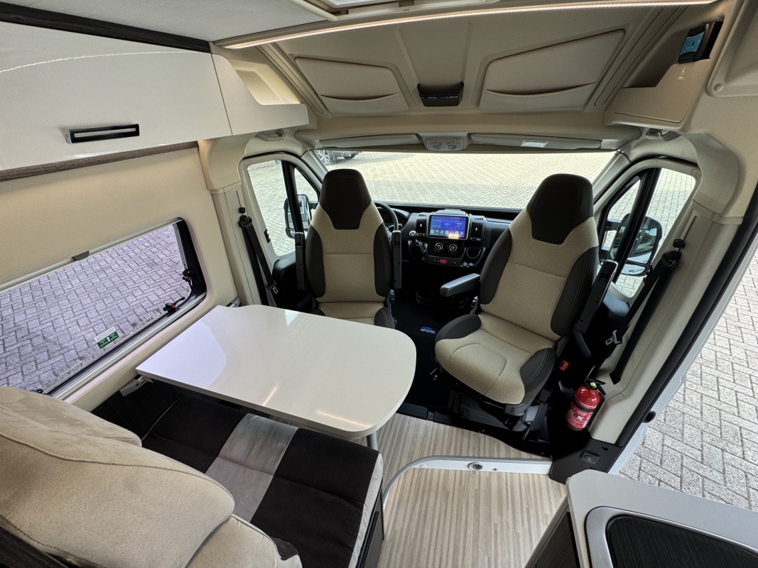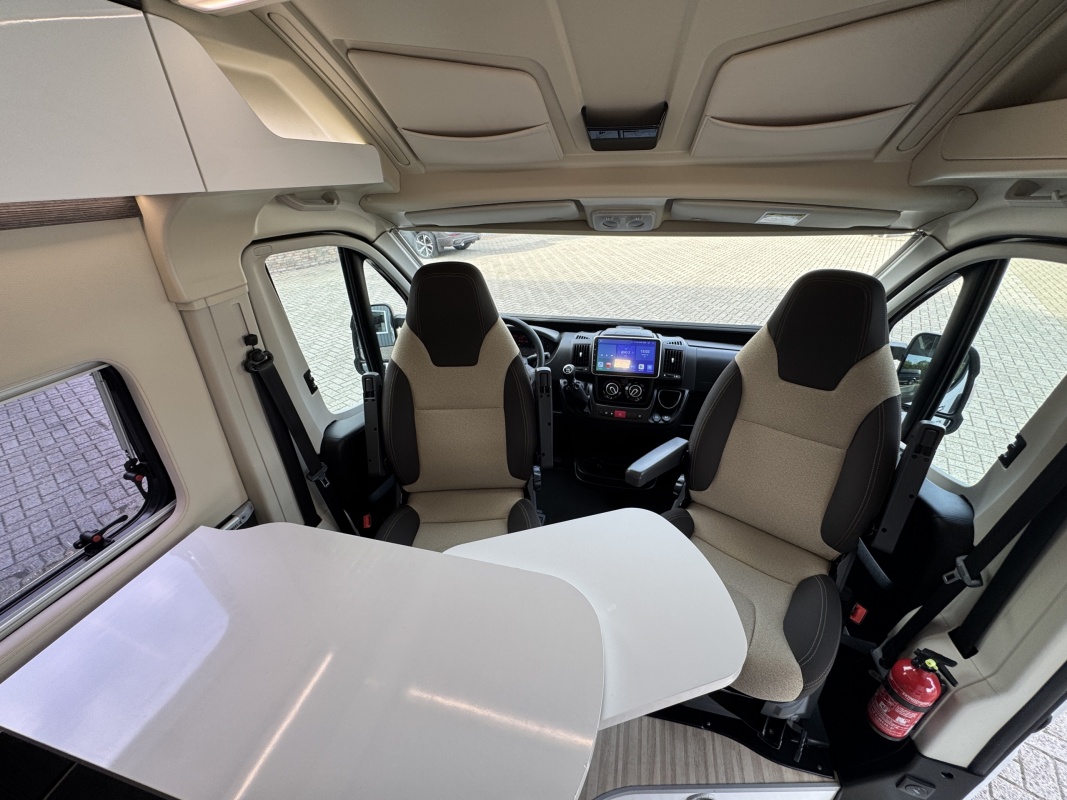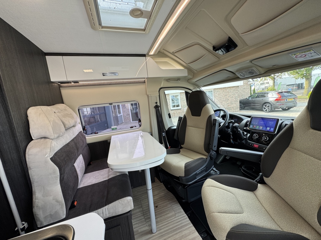 Voorin de cabine staan twee draai-, verstel- en kantelbare comfortstoelen, daarachter een dinettebank met een tafel waarvan een verborgen deel te draaien is naar de bijrijdersstoel.