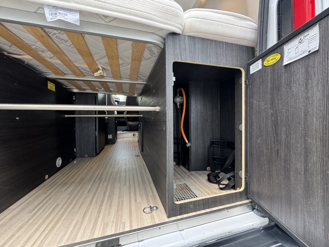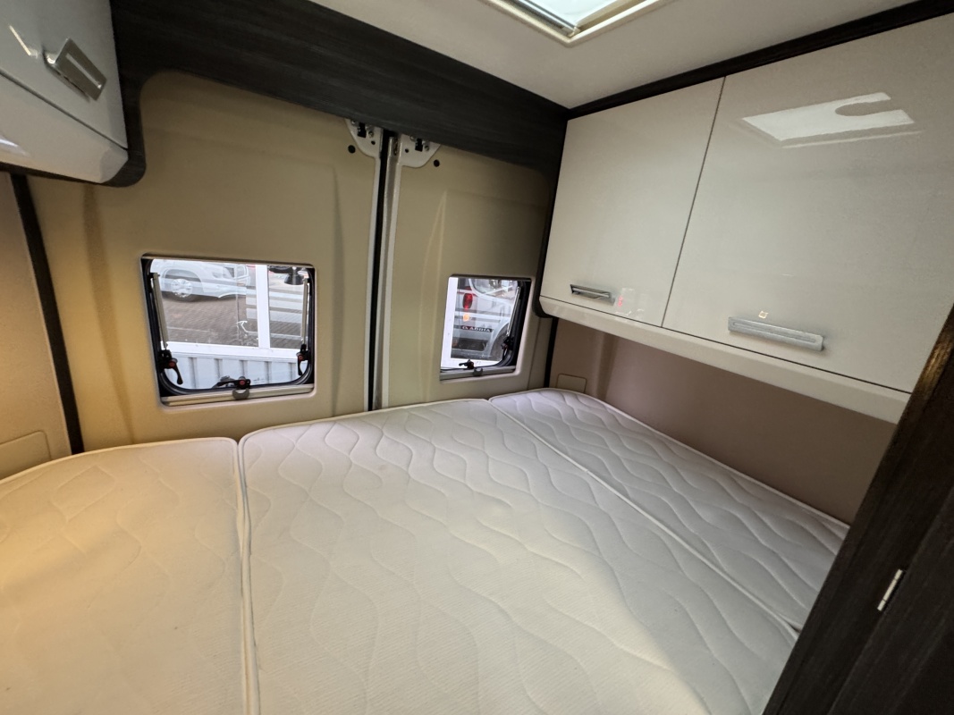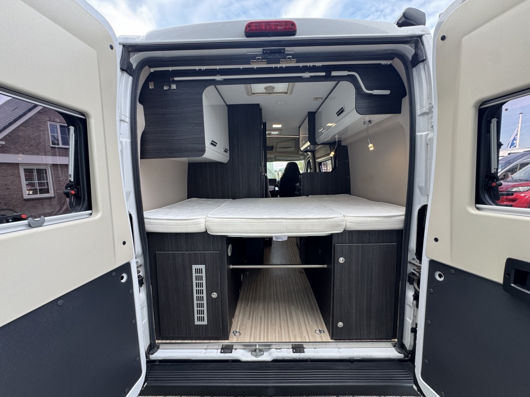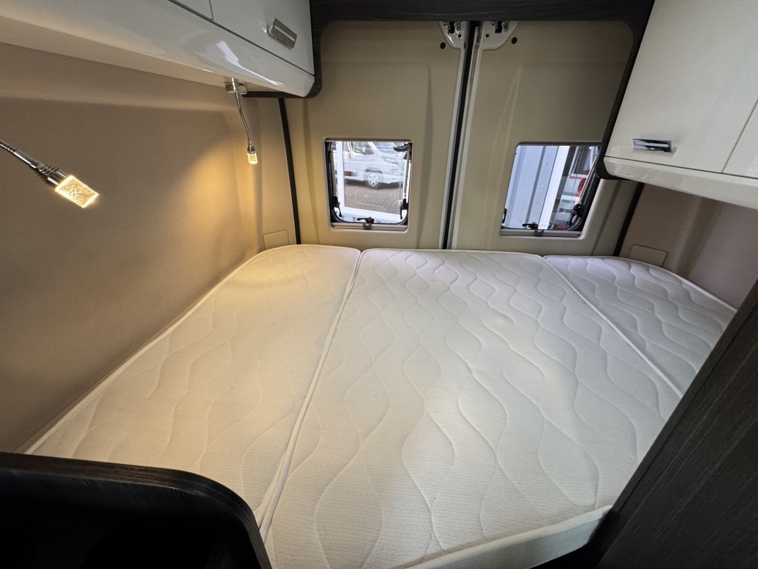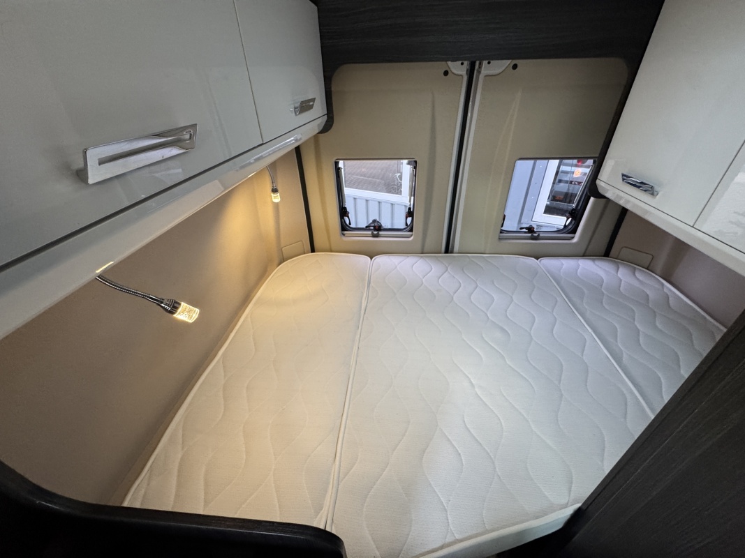 Achterin een groot twee persoons dwarsbed met een gemakkelijke instap en een grote garage / opbergruimte onder het bed.