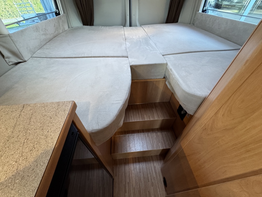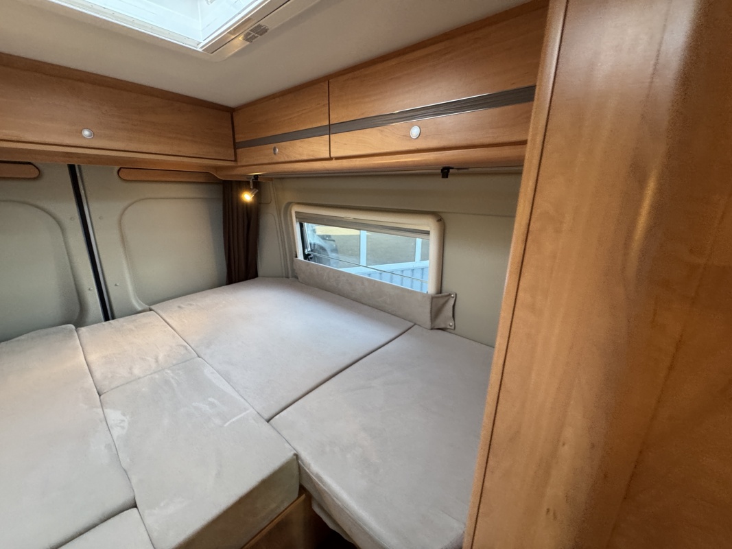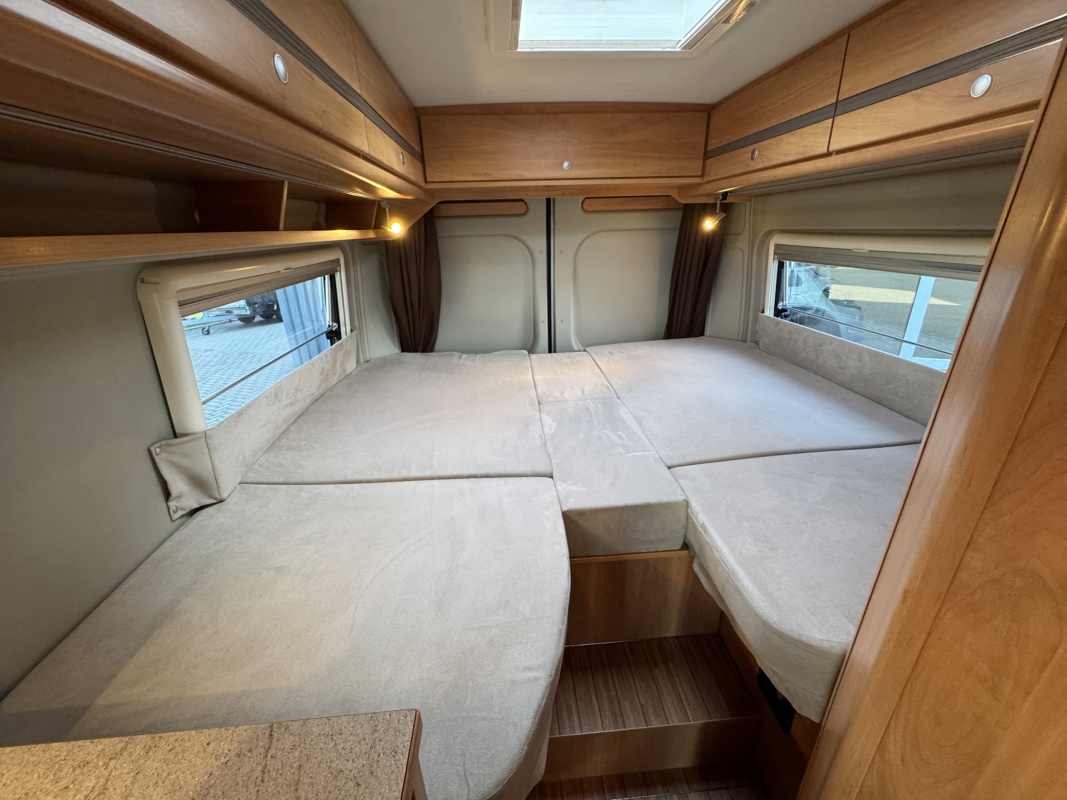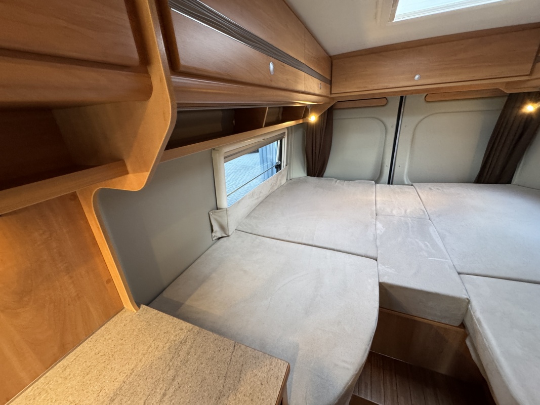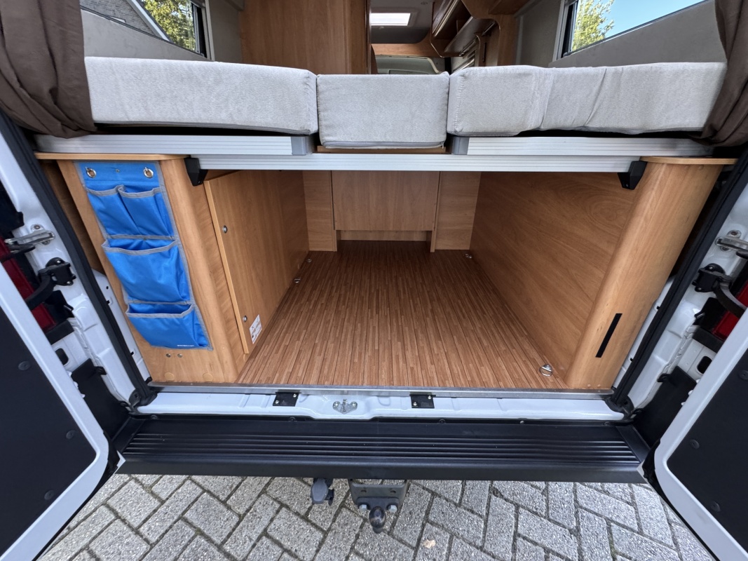 Achterin twee royale enkele bedden met een comfortabele matras en gemakkelijke instap! Onder de bedden is een grote garage / opbergruimte.
