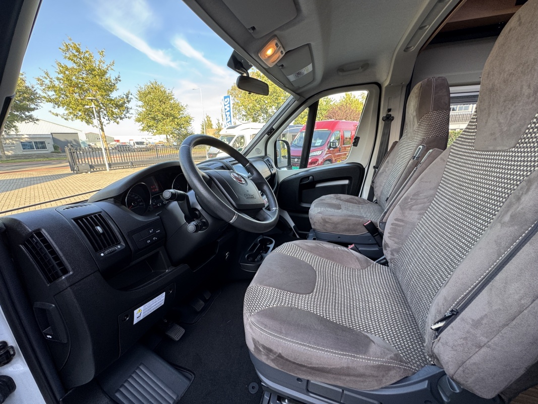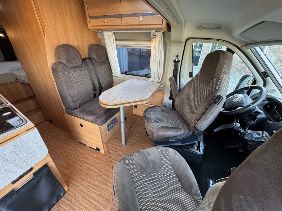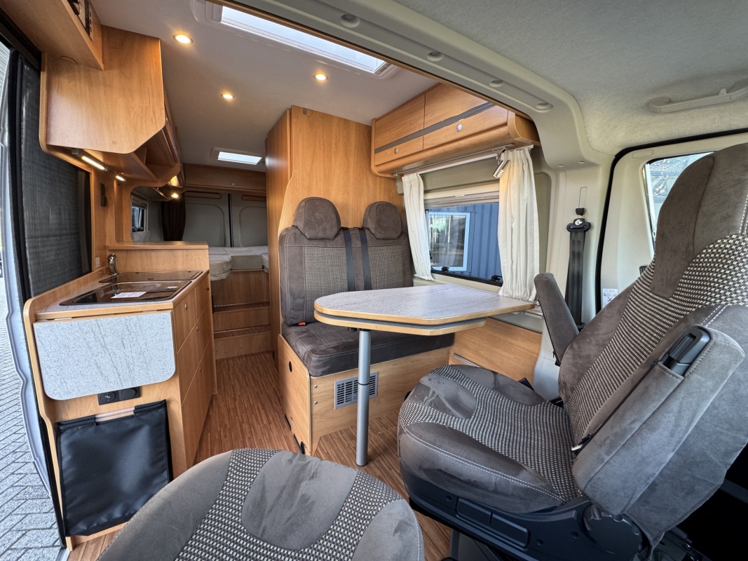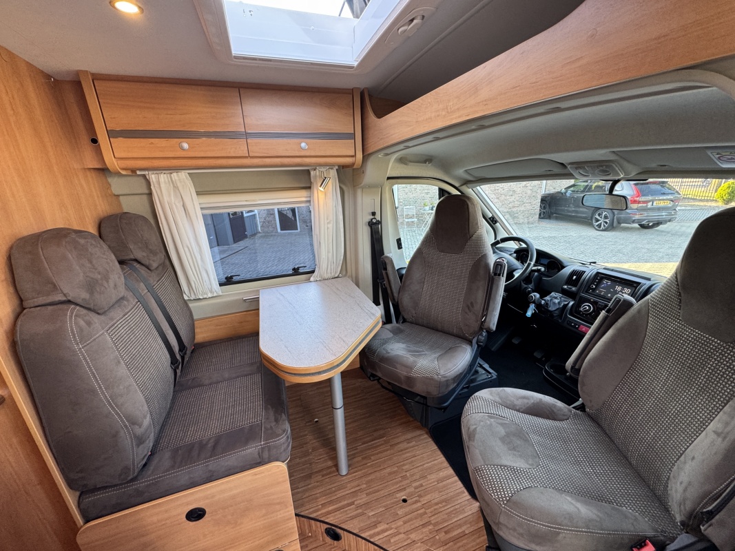 Voorin de cabine beschikt deze Possl Roadcruiser over 2 draai-, verstel-, kantelbare comfortstoelen met armleuning, daarachter een ruime dinette bank. Eventueel is de zitgroep om te leggen tot een extra bed(je).