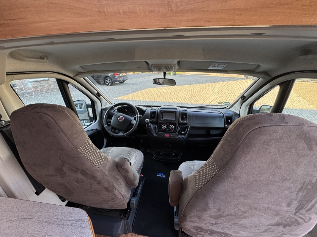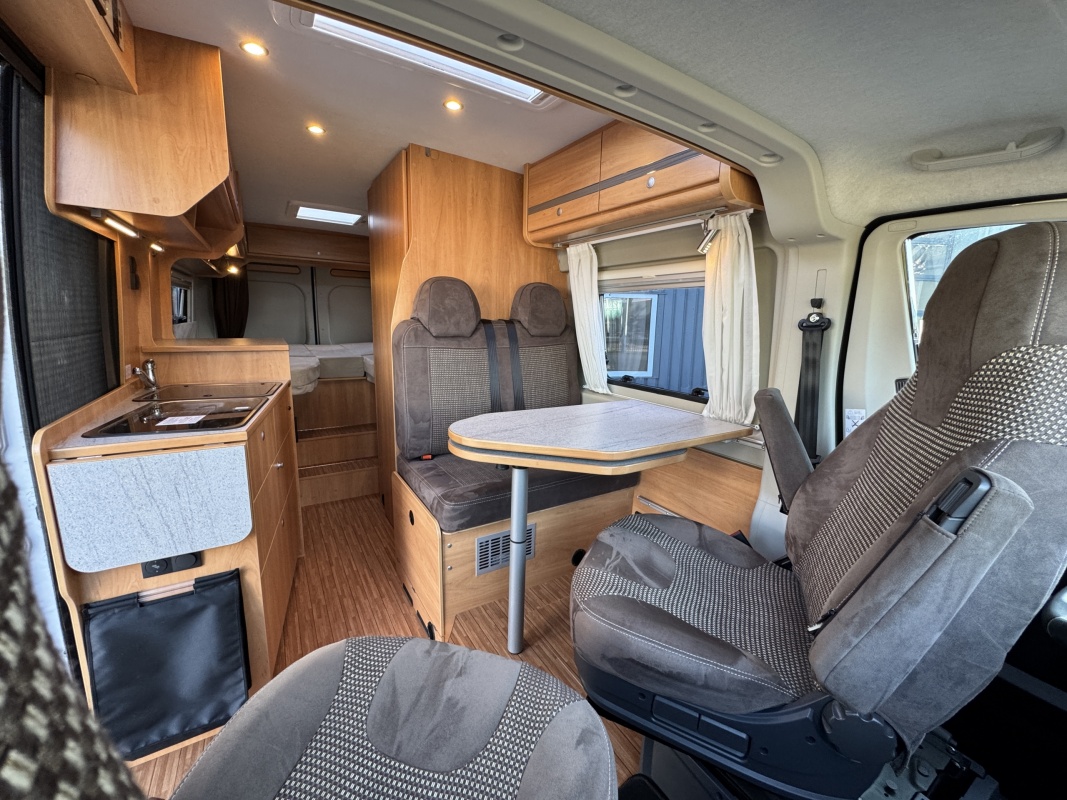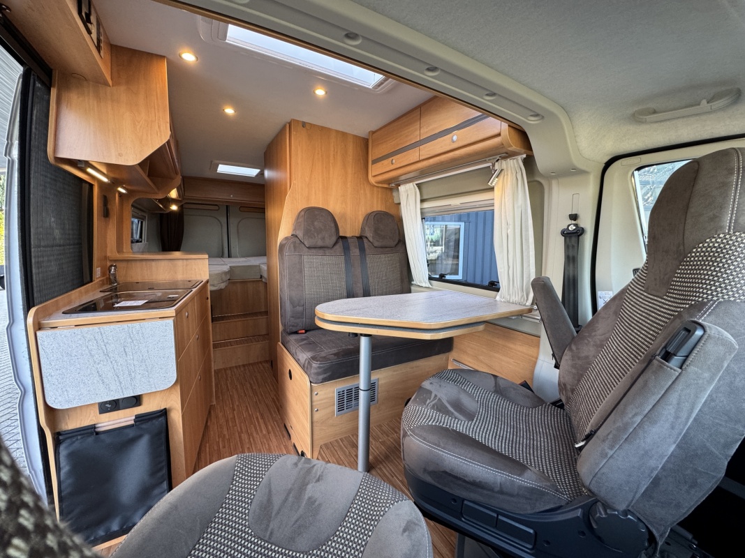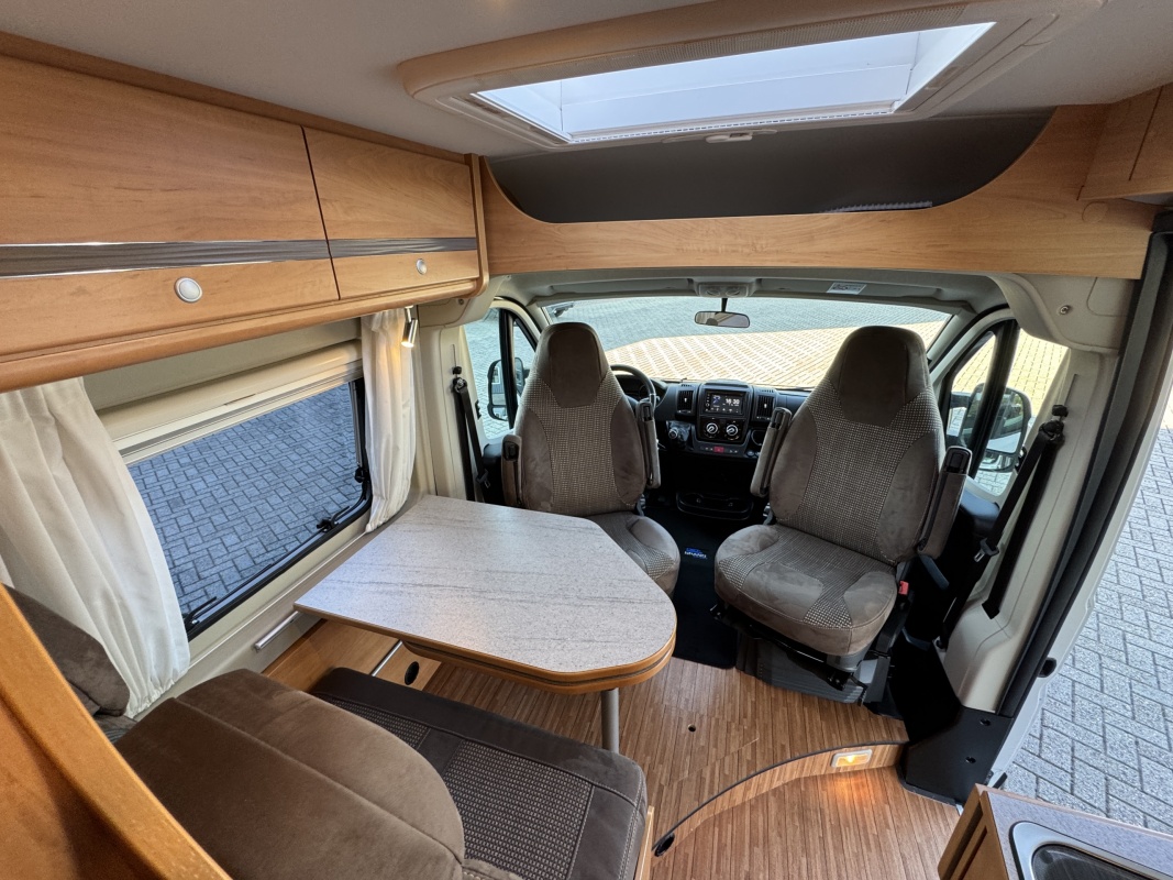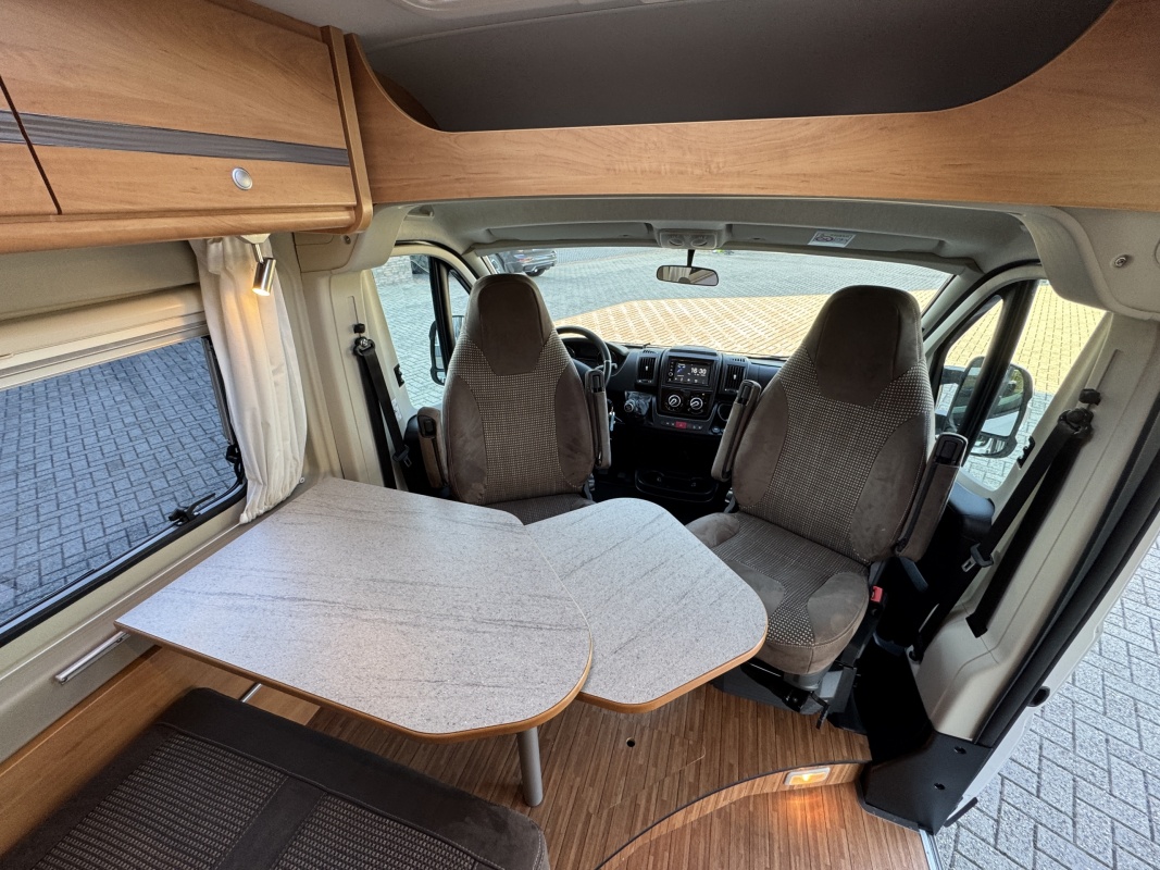 Voorin de cabine beschikt deze Possl Roadcruiser over 2 draai-, verstel-, kantelbare comfortstoelen met armleuning, daarachter een ruime dinette bank. Eventueel is de zitgroep om te leggen tot een extra bed(je).