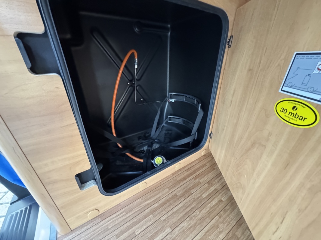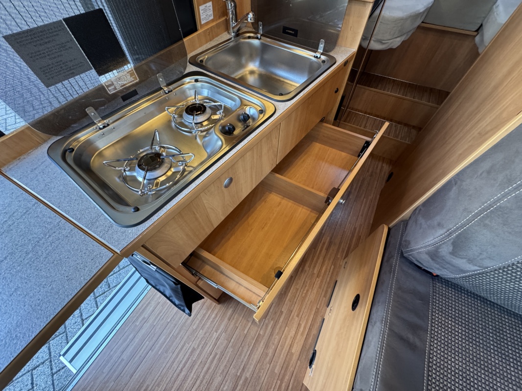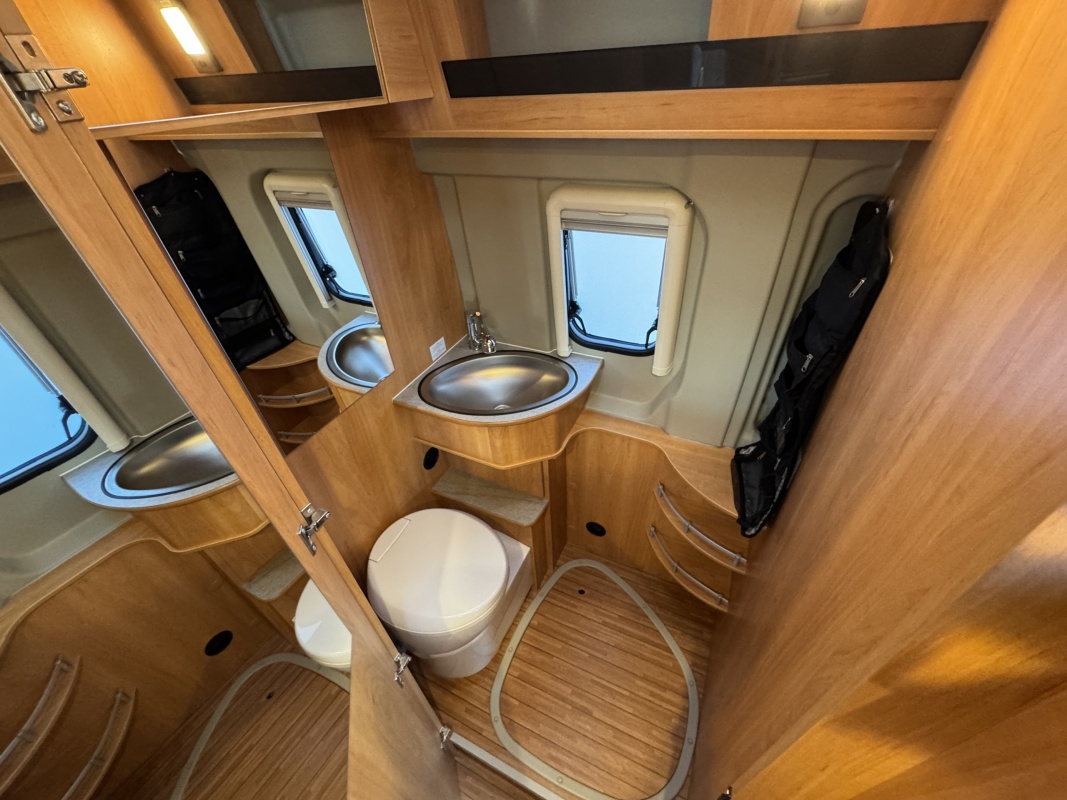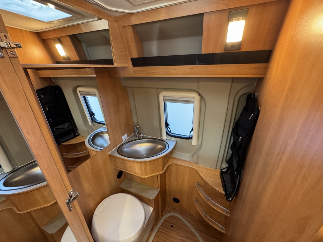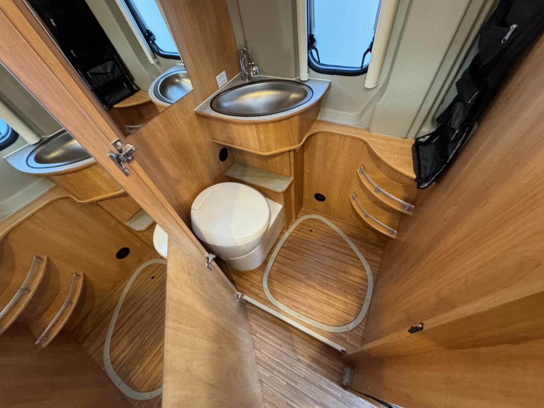 Tegenover de keuken is de natte cel met een Thetford cassettetoilet, een wastafel met toiletkast en door ingenieuze draaibare wastafel wand een volwaardige douche cabine!!!