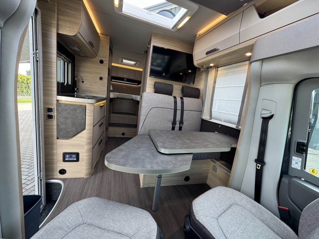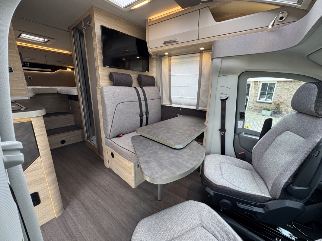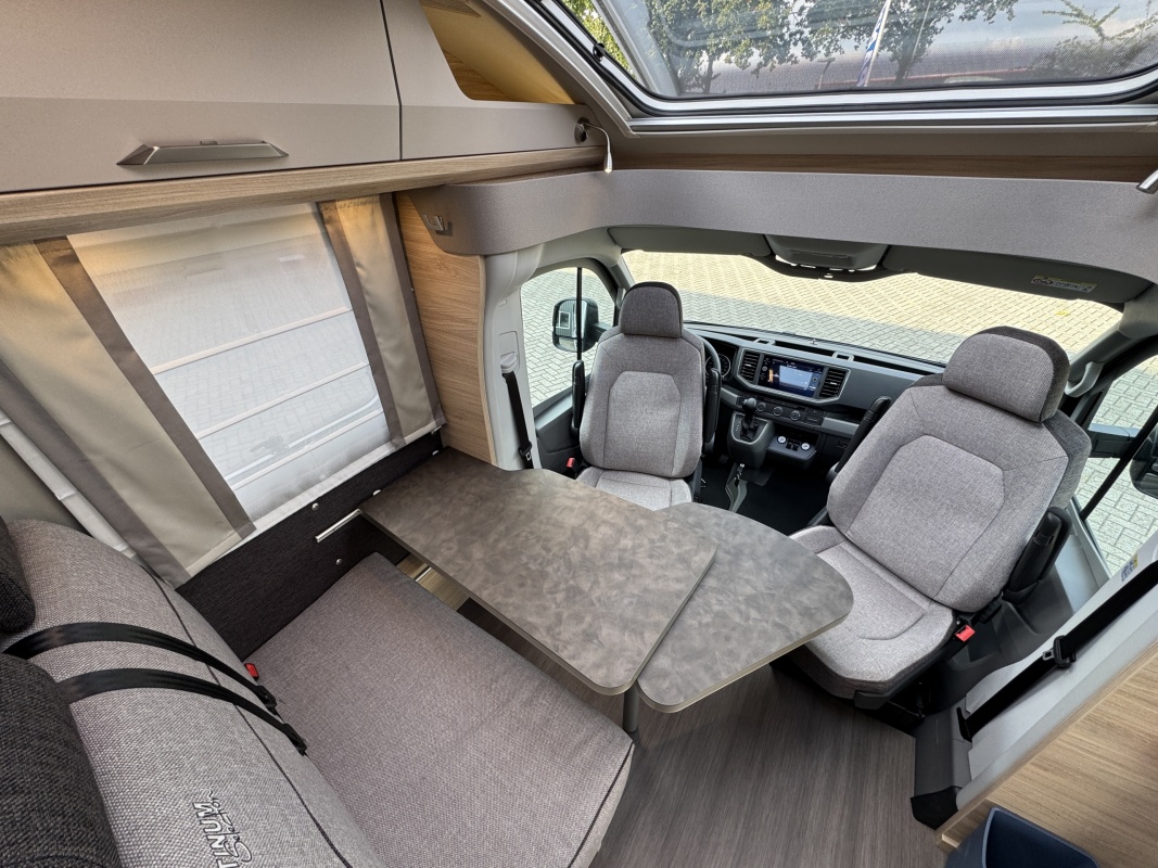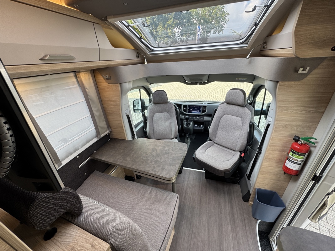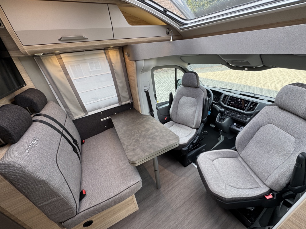 Voorin de cabine staan twee luxe draai-, kantel en verstelbare comfortstoelen. Door voorstoelen te draaien naar de dinettebank erachter biedt de camper een ruime en gezellige zitgroep! Het onderste deel van de tafel kan worden gedraaid naar de bijrijdersstoel.