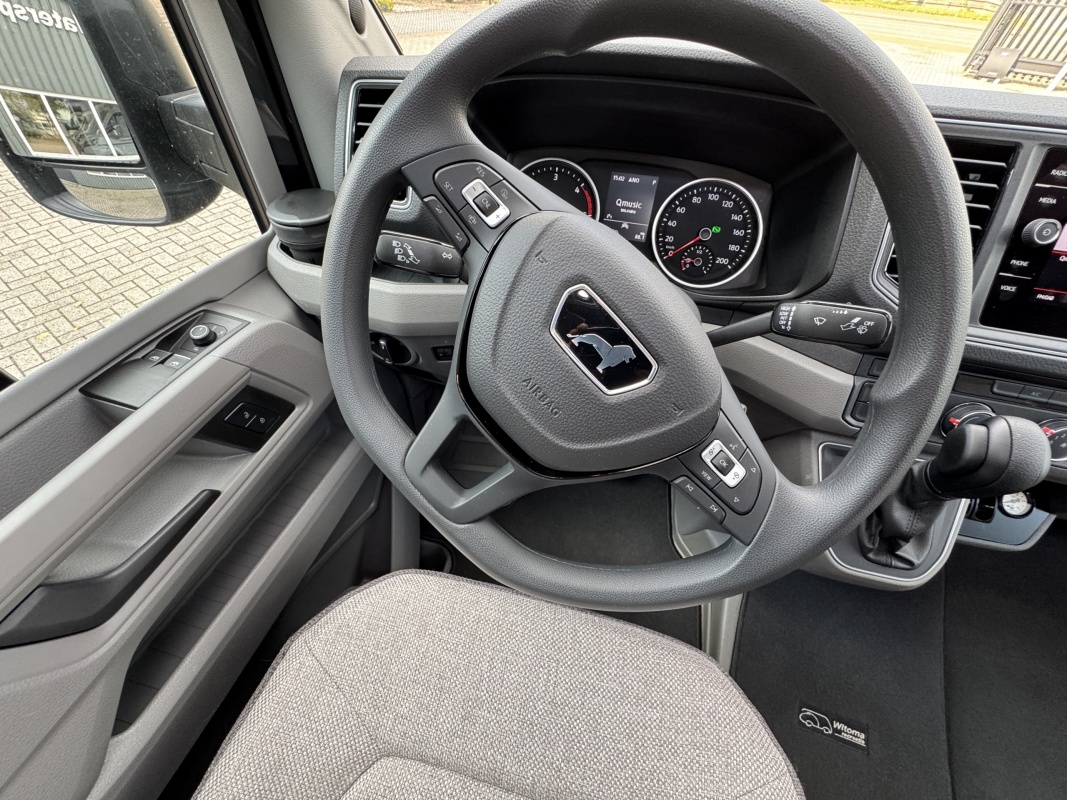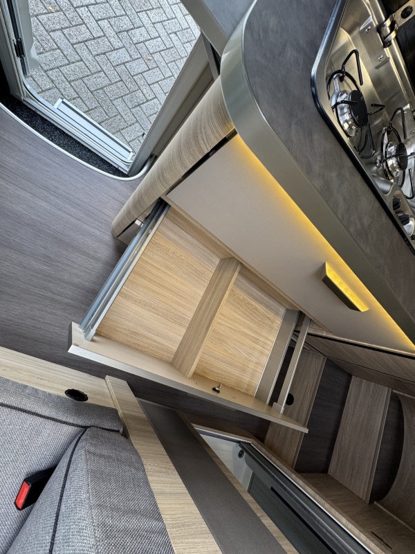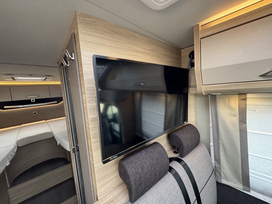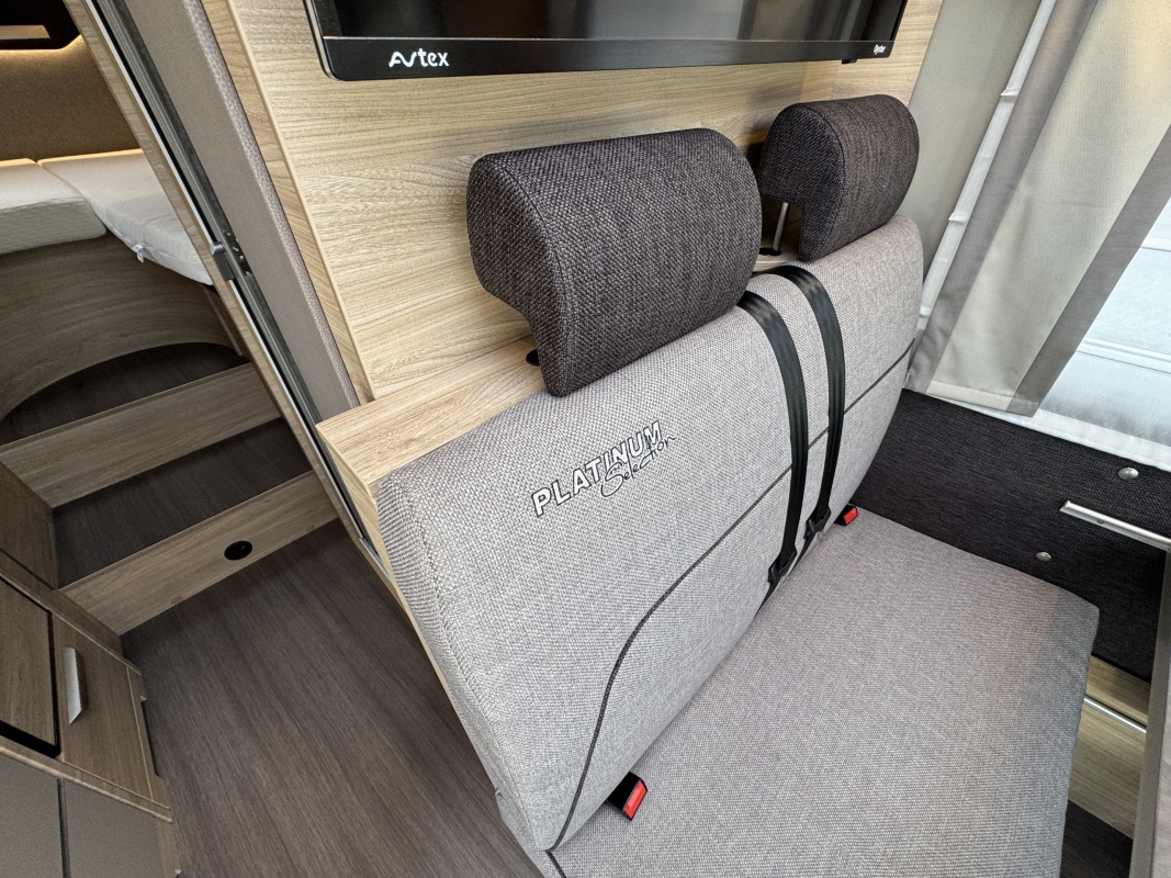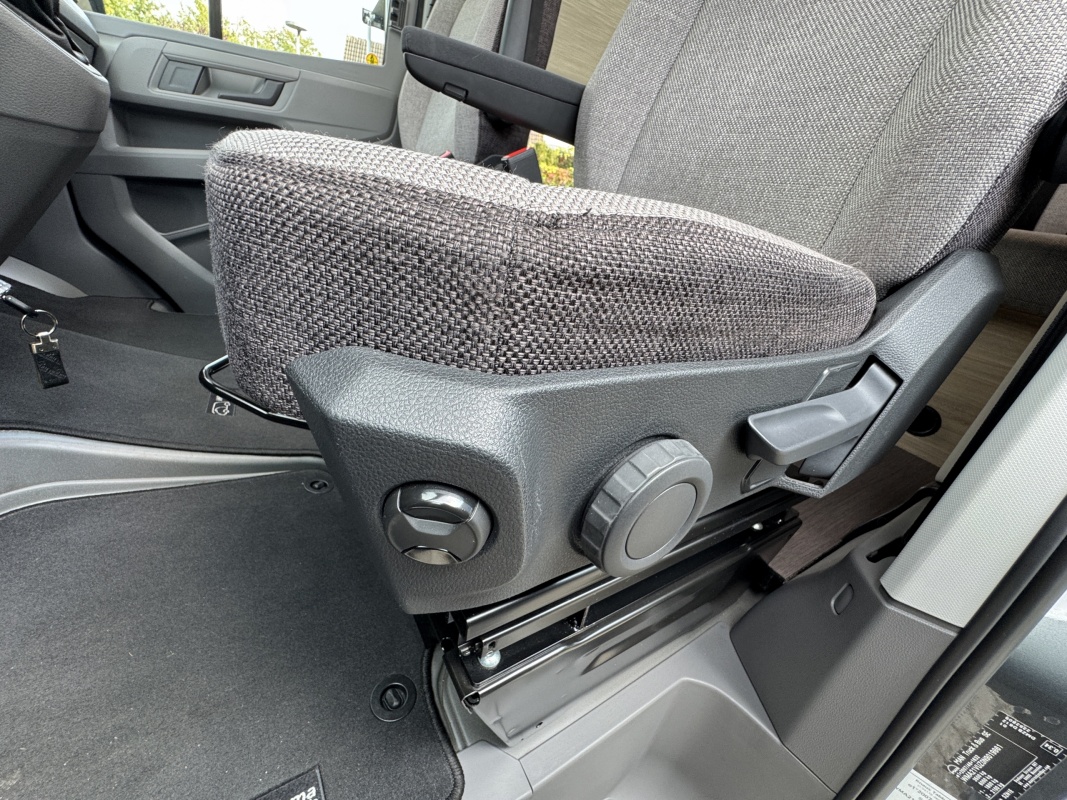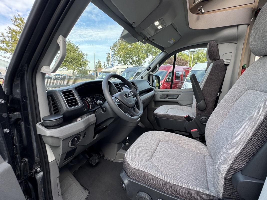 Voorin de cabine staan twee luxe draai-, kantel en verstelbare comfortstoelen. Door voorstoelen te draaien naar de dinettebank erachter biedt de camper een ruime en gezellige zitgroep! Het onderste deel van de tafel kan worden gedraaid naar de bijrijdersstoel.