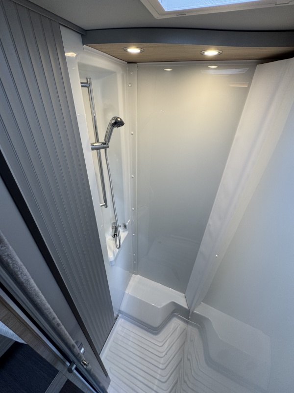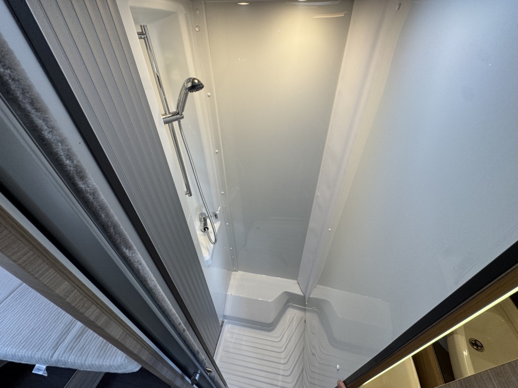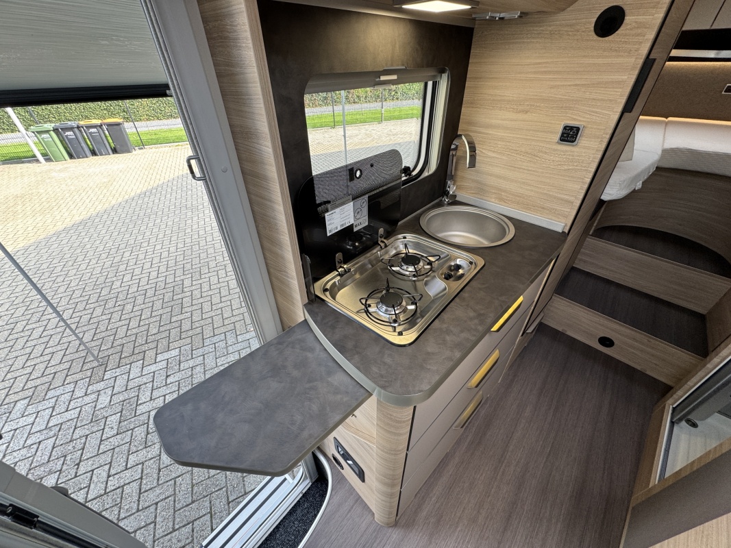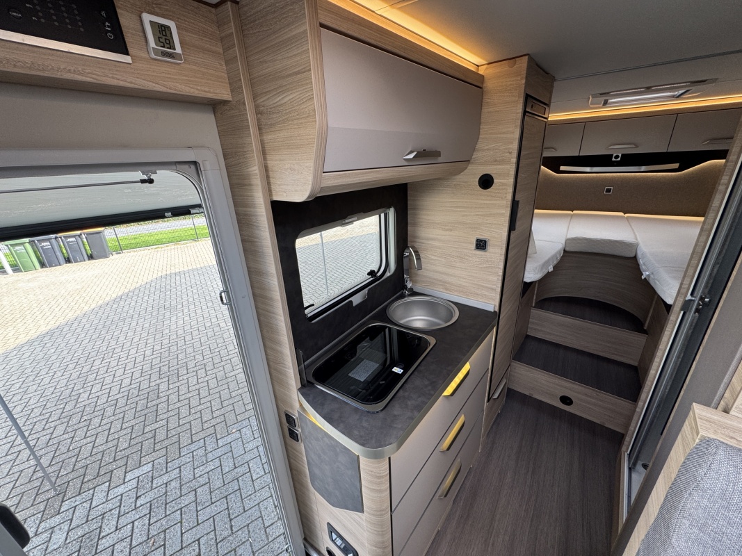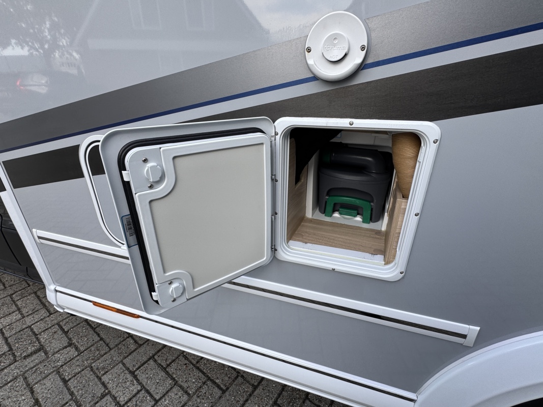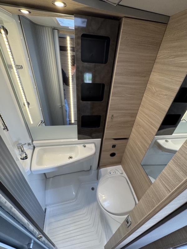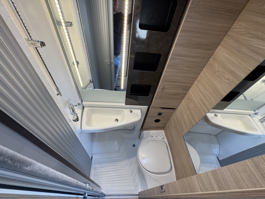 Tegenover de keuken is de natte cel met een Thetford cassettetoilet, een wastafel met spiegel en toiletkast en de wand waarop de wastafel gemonteerd zit is draaibaar. Met een gedraaide wand creëert u een volwaardige douchecabine!