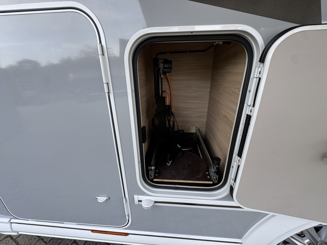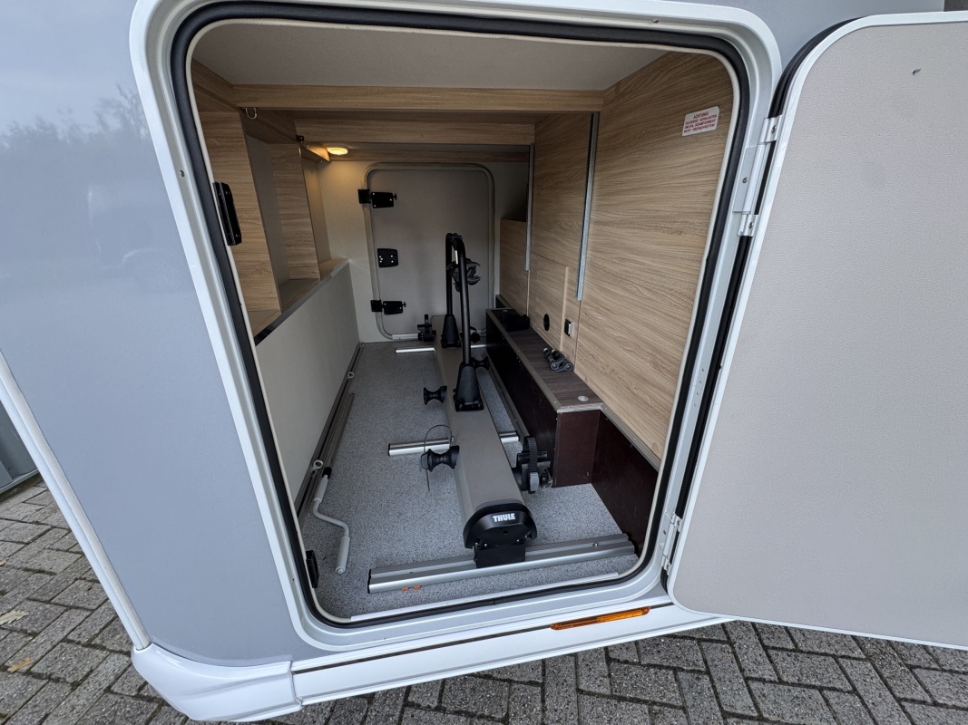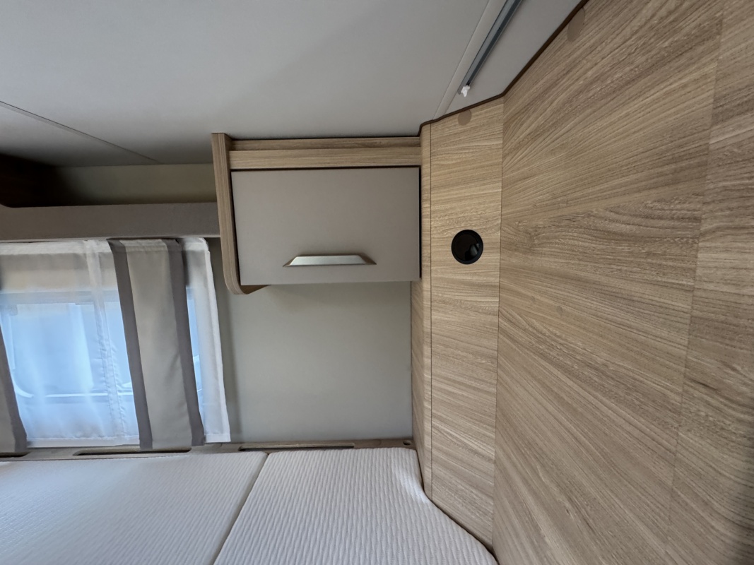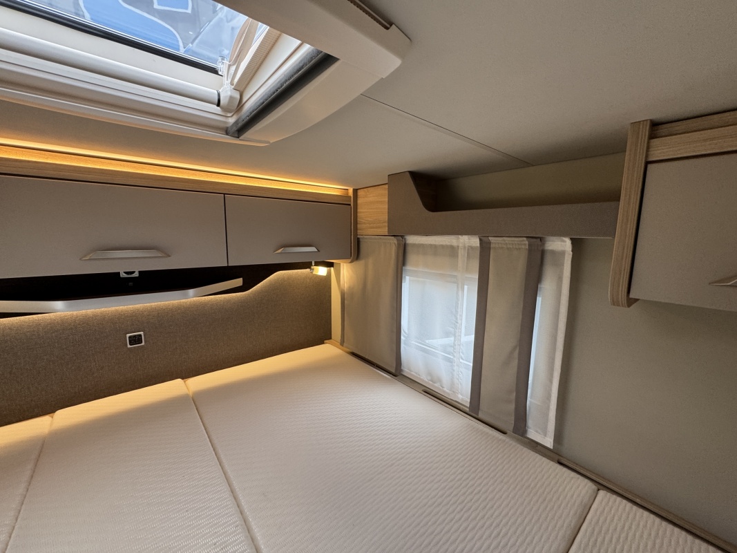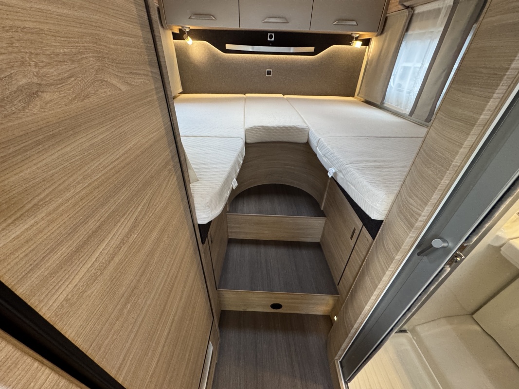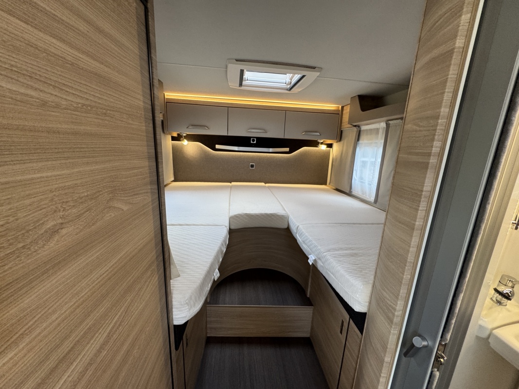 Achterin twee royale enkele bedden voorzien van een comfortabele matras en een gemakkelijke instap! Het bed is middels een tussenstuk ook om te leggen tot een XXL bed. Onder de bedden is veel kastruimt en een grote garage!