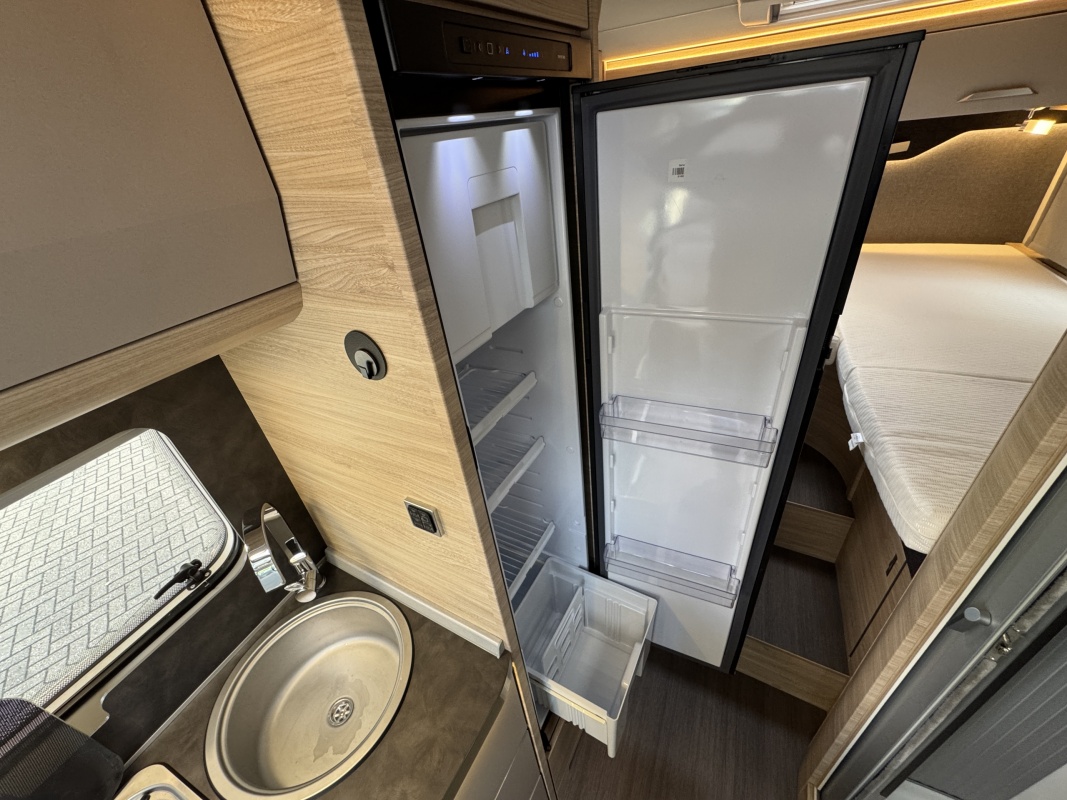 In het midden de keuken welke is uitgerust met een kooktoestel met glasafdekking, een spoelbassin met mengkraan (warm en koud water), een grote koelkast met groot vriesvak en lade, veel kast en opbergruimte met diepe lades en een uitklapbaar extra werkblad.