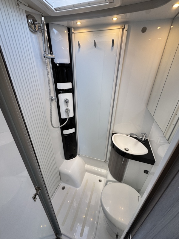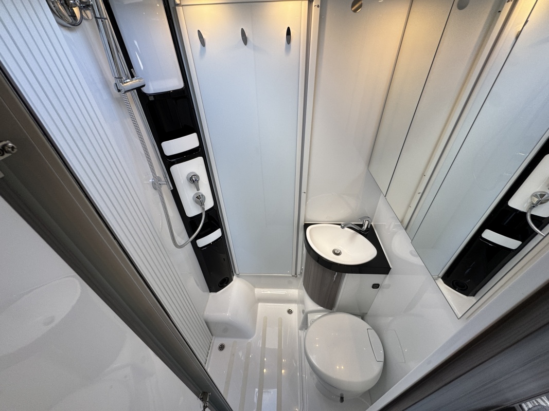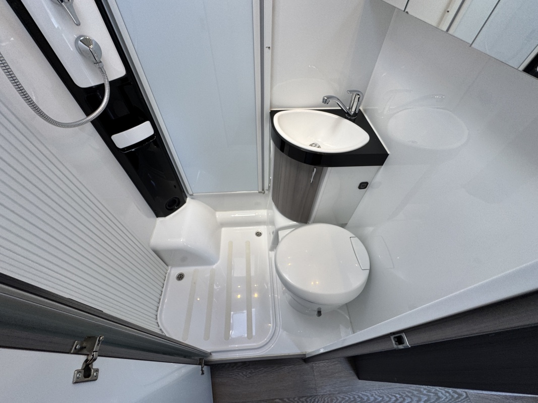 Tegenover de keuken is de natte cel met een cassettetoilet, een wastafel en douche!
