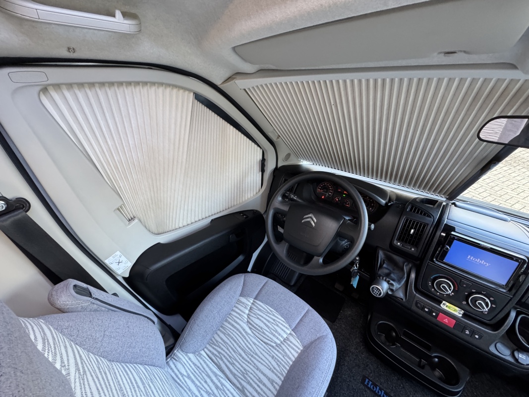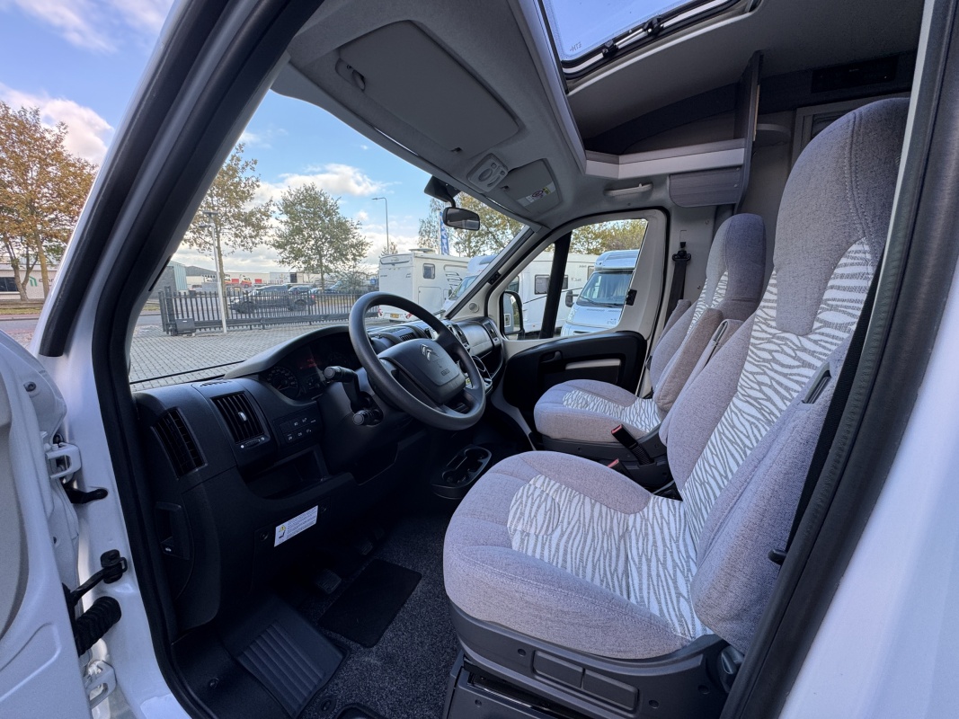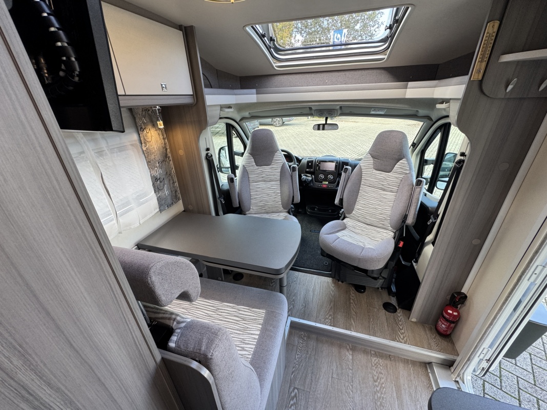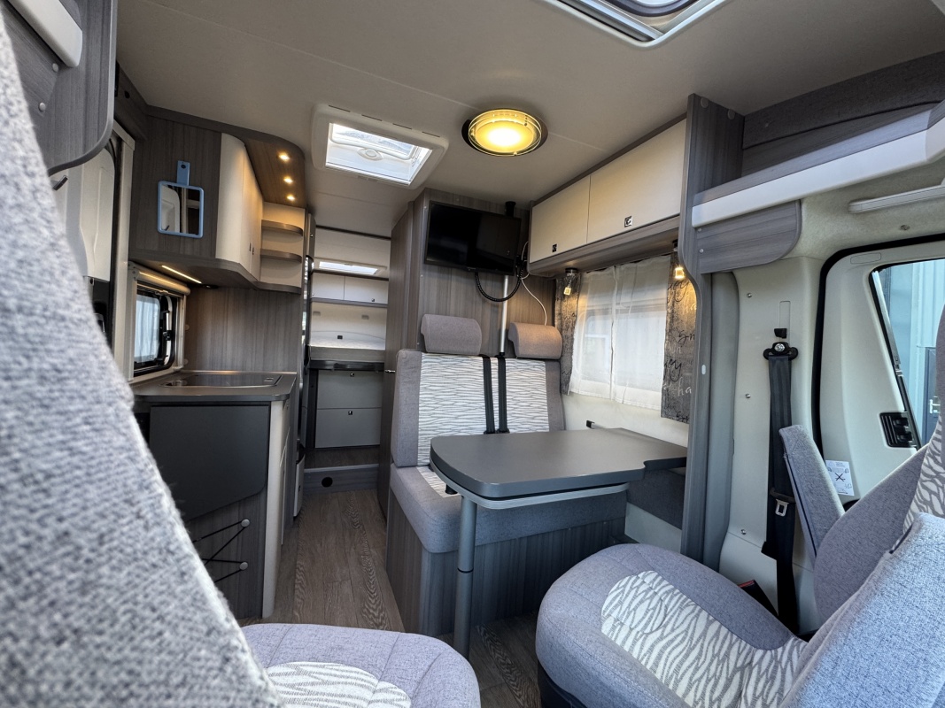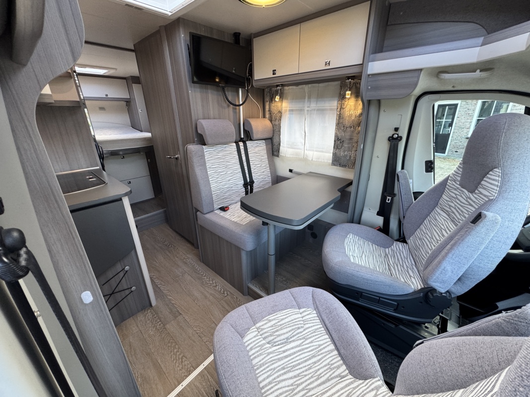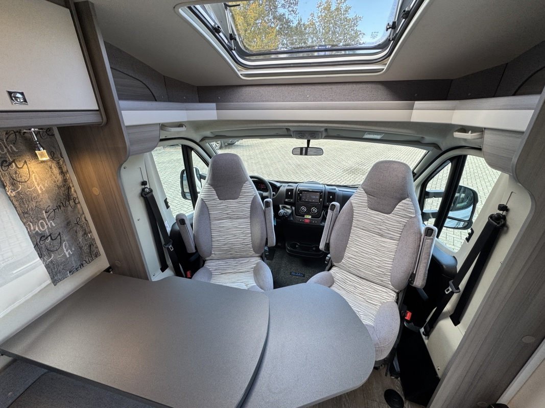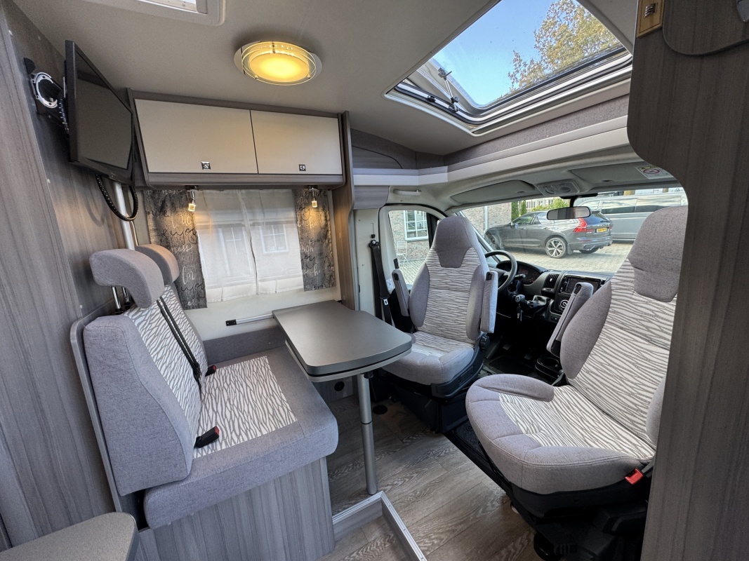 Voorin de cabine staan twee verstel-, kantel- en draaibare comfortstoelen met armleuning. Door de voorstoelen te draaien naar de dinette erachter biedt hij ruim plaats aan 4 personen en kan de zitgroep omgelegd worden tot een extra bedje.