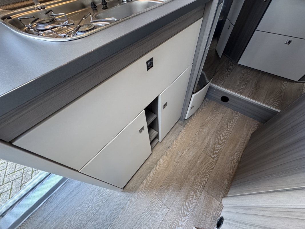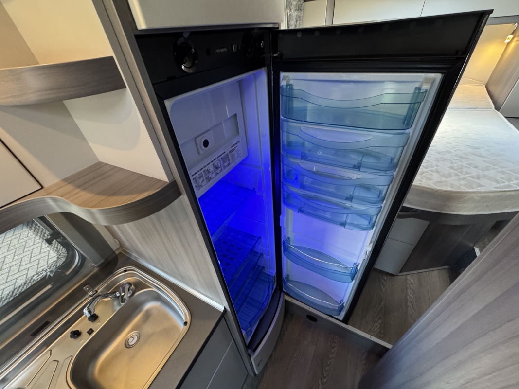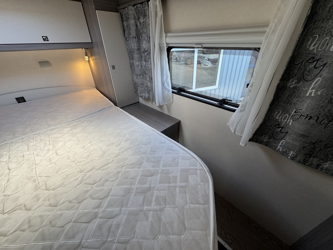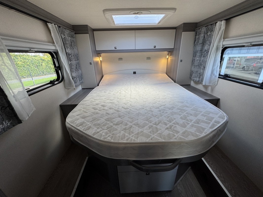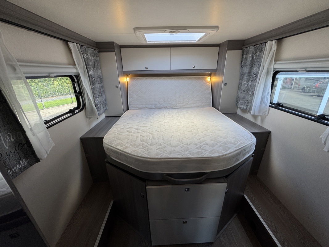 Achterin een groot en lang twee persoons queensbed met een gemakkelijke instap en veel ruimte om het het bed. Onder het bed is een enorme opbergruimte.