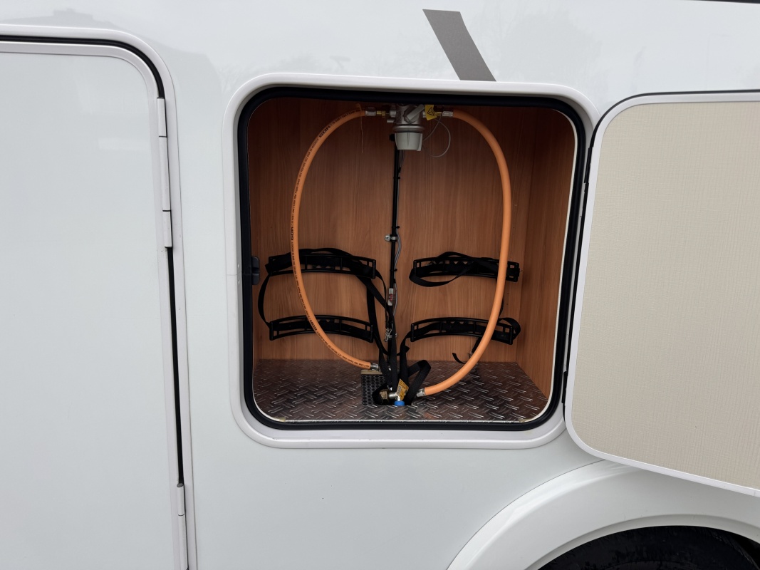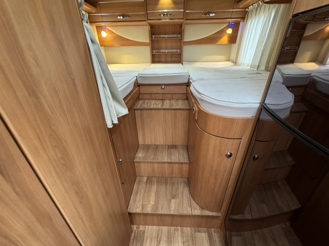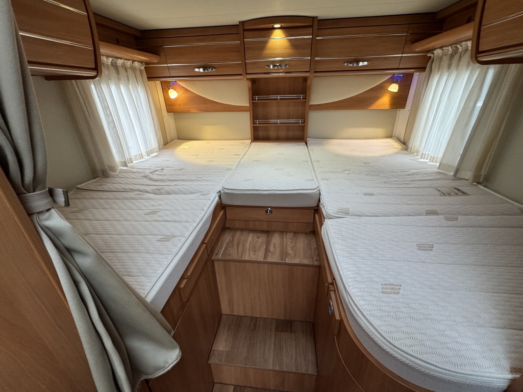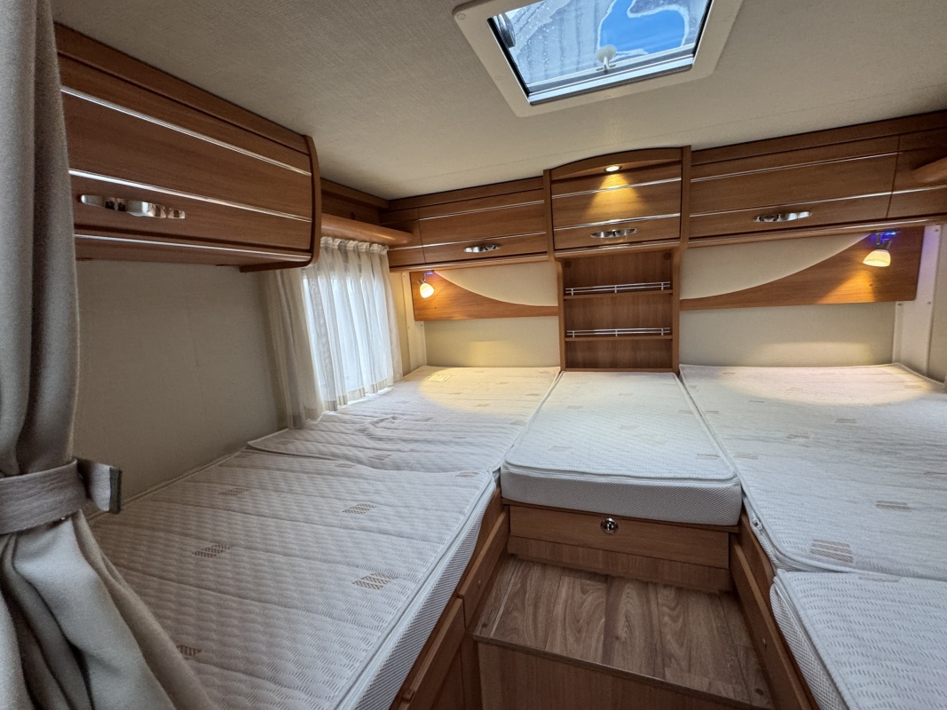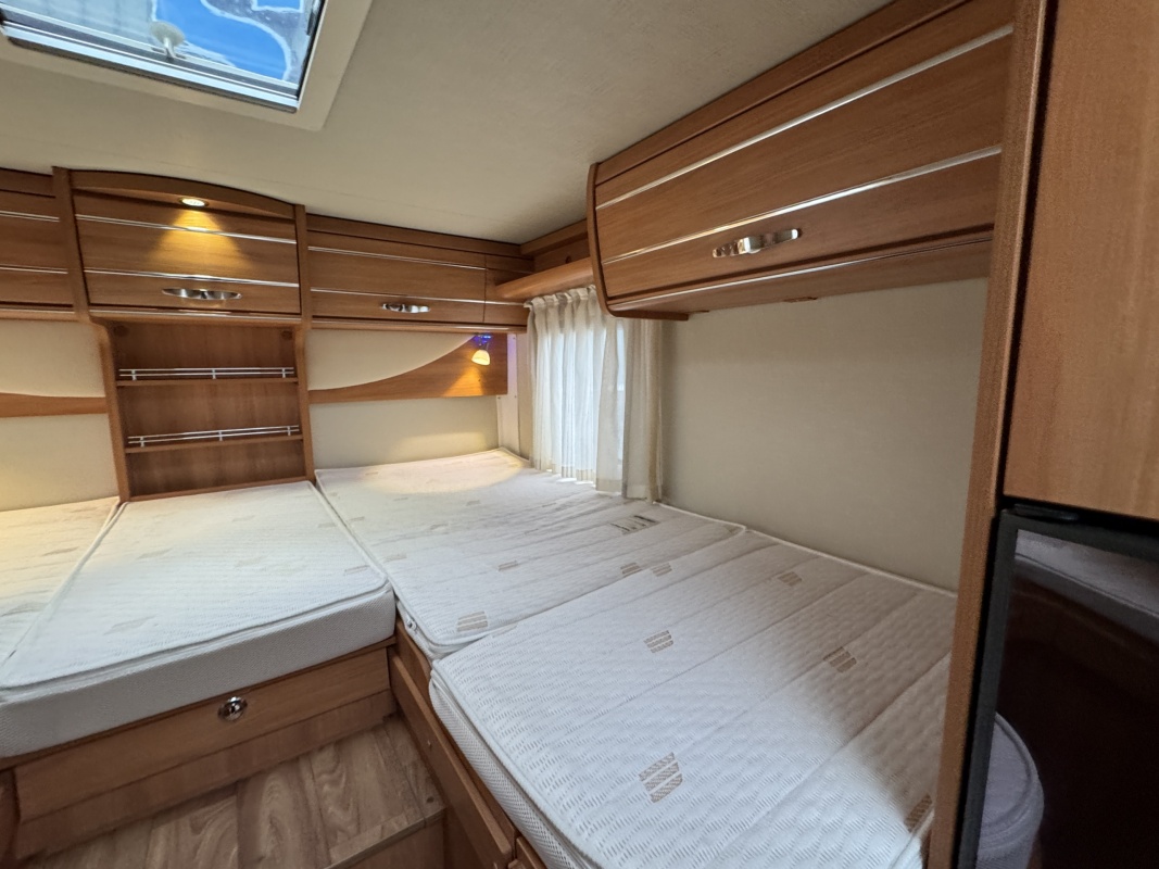 Achterin twee royale lengte bedden met een dikke comfortabele matras en een gemakkelijke instap! De bedden zijn ook samen te voegen tot één groot bed. Onder de bedden is veel kastruimte en een XXL garage!