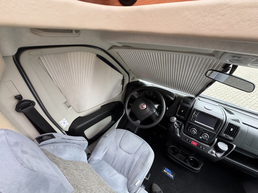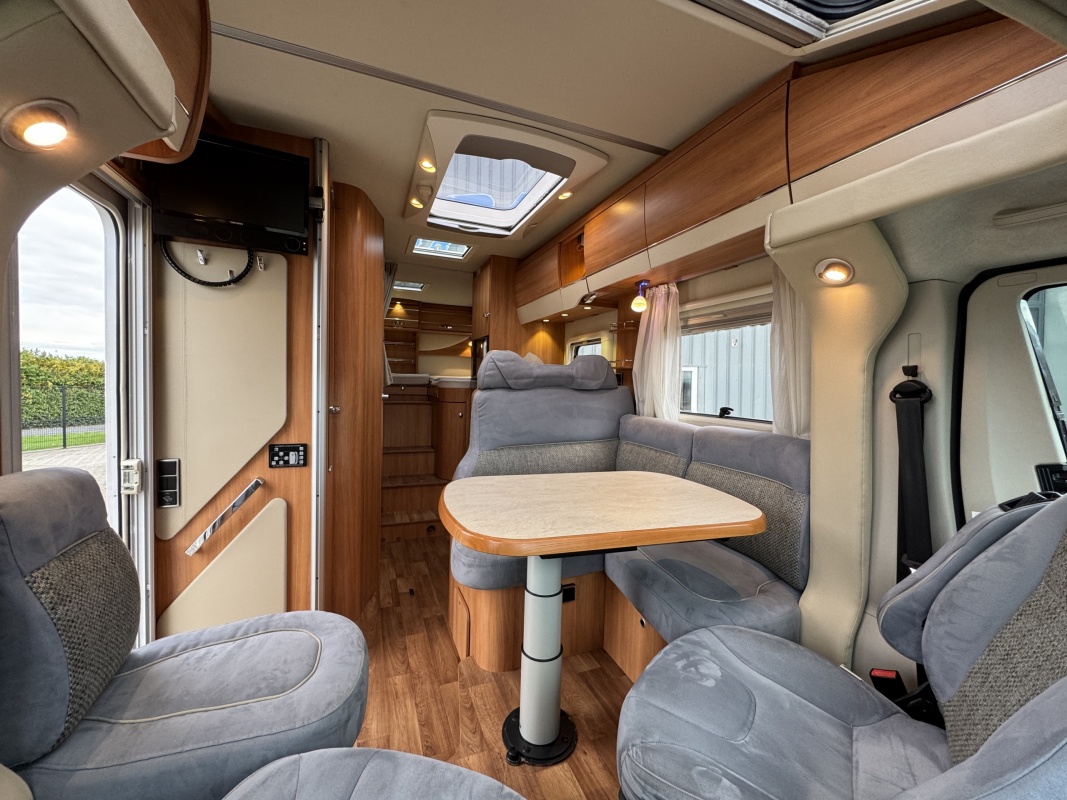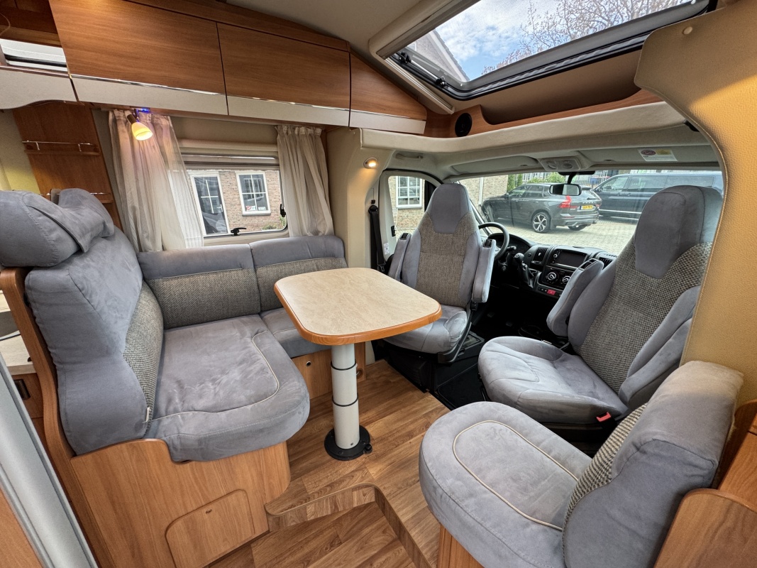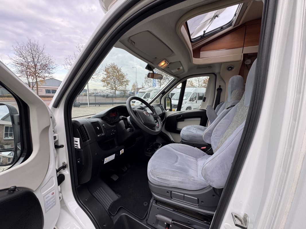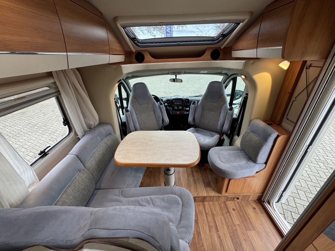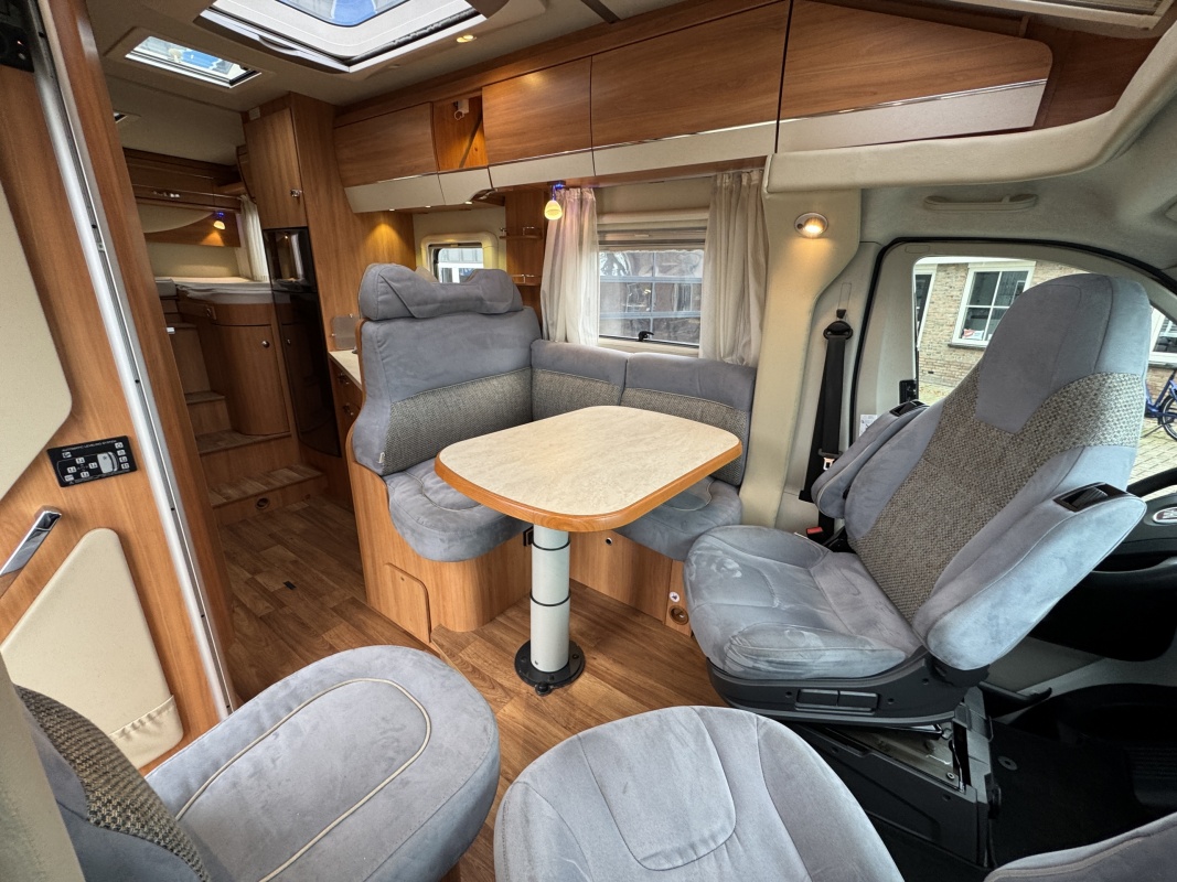 Voorin twee draai- en verstelbare comfortstoelen met daarachter een L-zit en langsbank! Door de voorstoelen te draaien creëert u een ruime en gezellige zitgroep! Eventueel is de zitgroep ook om te leggen tot een extra bed.