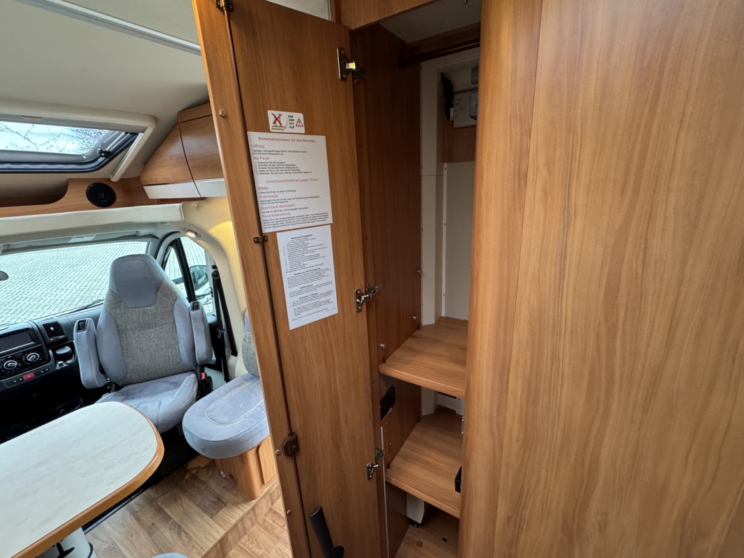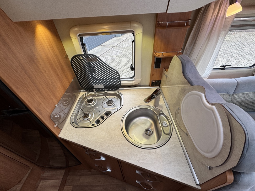 In het midden een L-keuken voorzien van vele gemakken zoals een grote Thetford koelkast met vriezer, een spoelbassin met mengkraan (warm en koud water), veel kastruimte, diepe lades met softclose en een kooktoestel met glasafdekking.