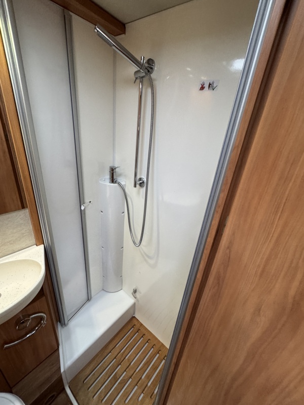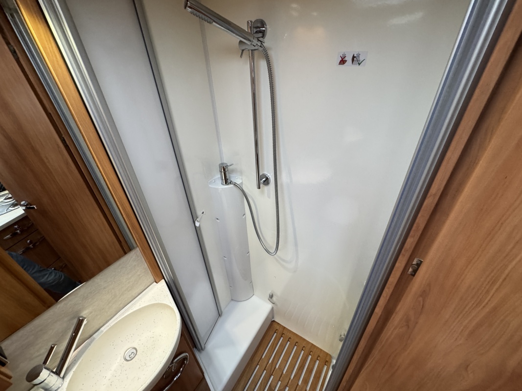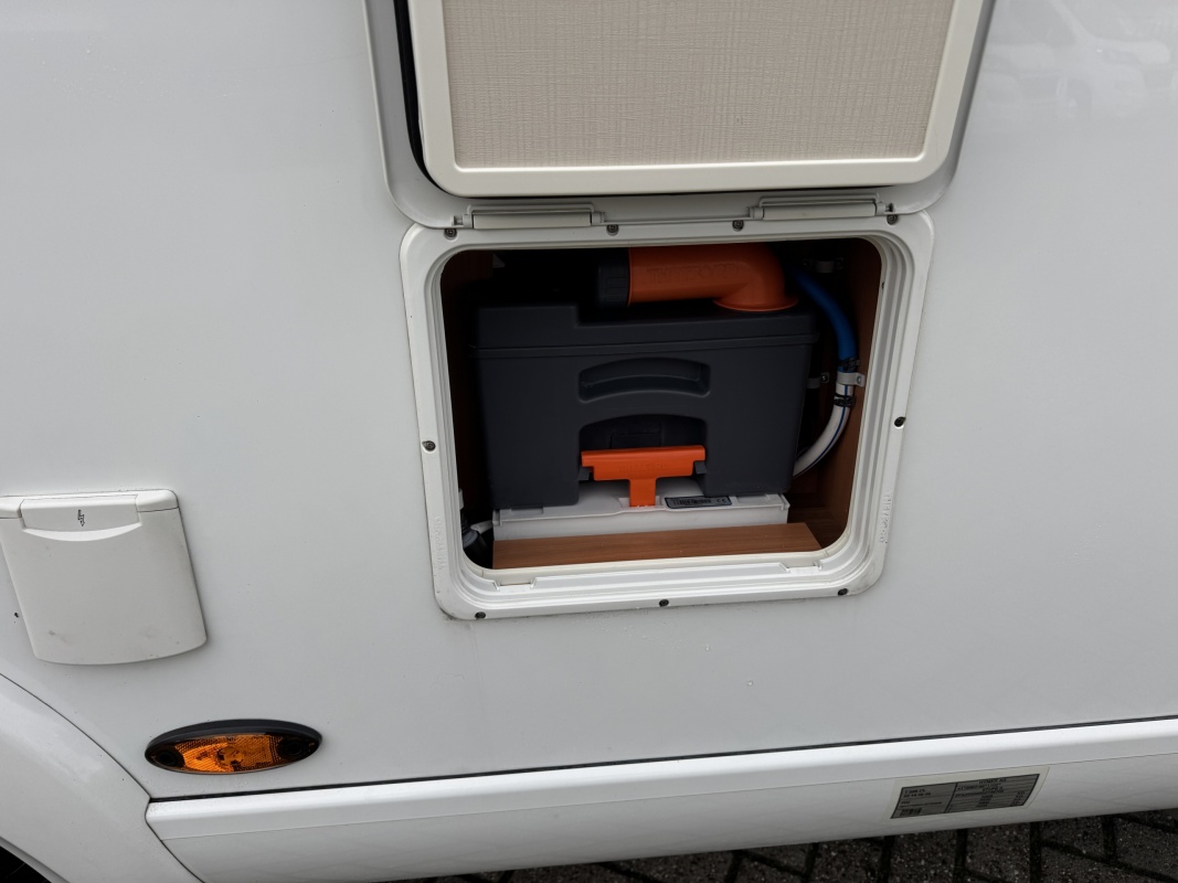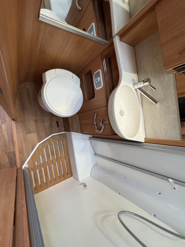 Tegenover de keuken is de toiletruimte met cassettetoilet, wastafel en douche gesitueerd! Uniek hieraan is de draaibare wand waarop de wastafel is geplaatst, door deze wand te draaien creëert u een volwaardige douchecabine zonder de gehele badkamer nat te maken!
