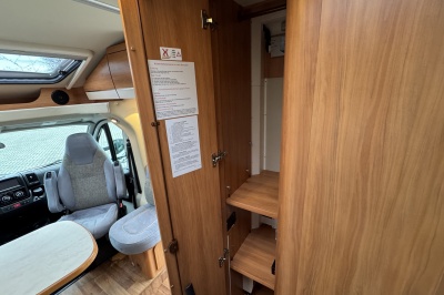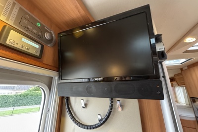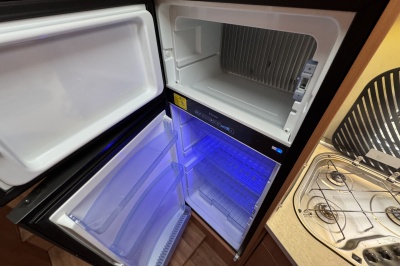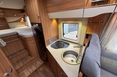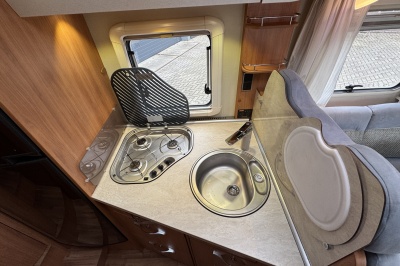 In het midden een L-keuken voorzien van vele gemakken zoals een grote Thetford koelkast met vriezer, een spoelbassin met mengkraan (warm en koud water), veel kastruimte, diepe lades met softclose en een kooktoestel met glasafdekking.