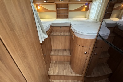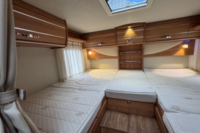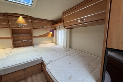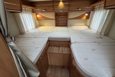 Achterin twee royale lengte bedden met een dikke comfortabele matras en een gemakkelijke instap! De bedden zijn ook samen te voegen tot één groot bed. Onder de bedden is veel kastruimte en een XXL garage!