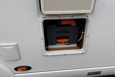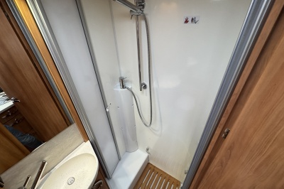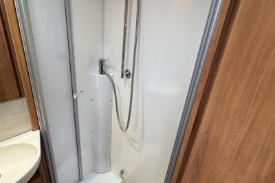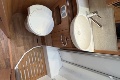 Tegenover de keuken is de toiletruimte met cassettetoilet, wastafel en douche gesitueerd! Uniek hieraan is de draaibare wand waarop de wastafel is geplaatst, door deze wand te draaien creëert u een volwaardige douchecabine zonder de gehele badkamer nat te maken!