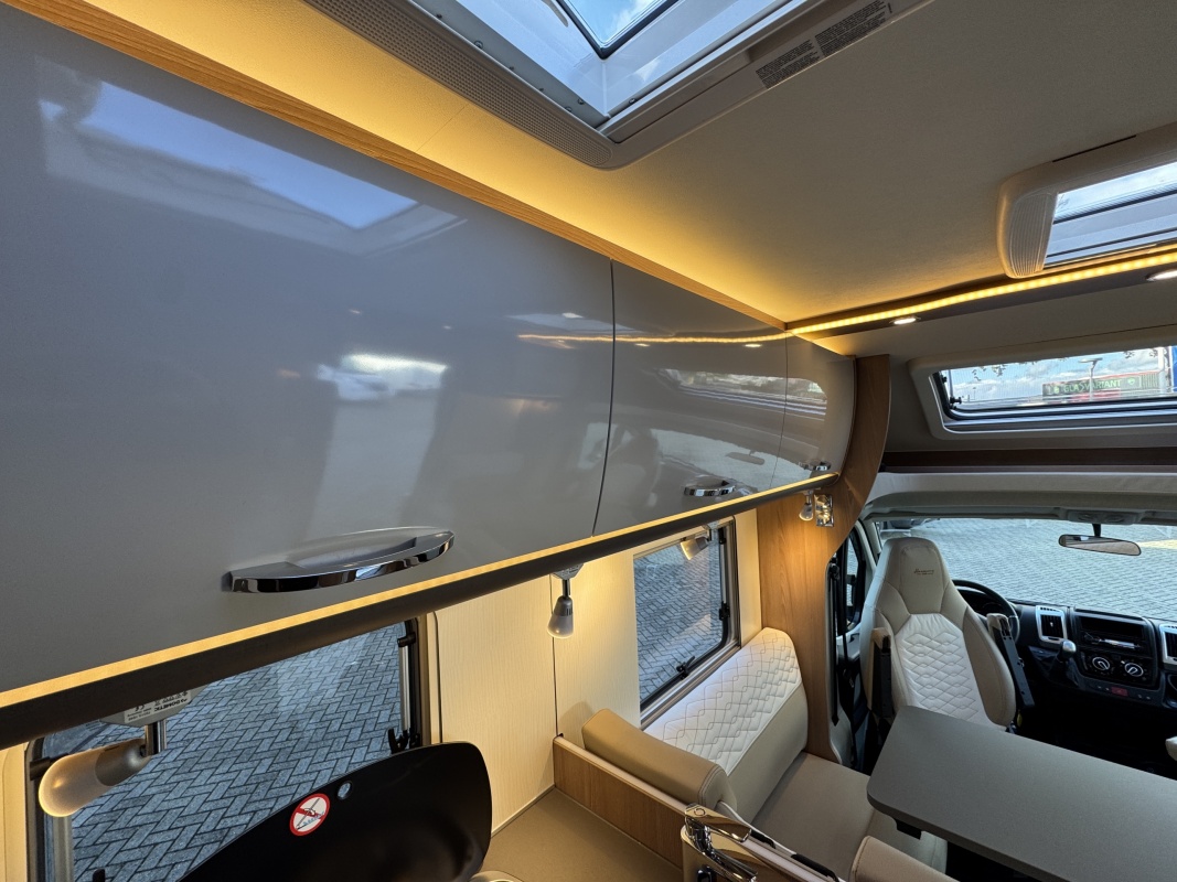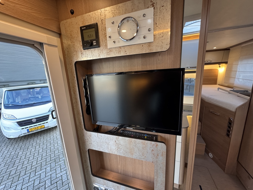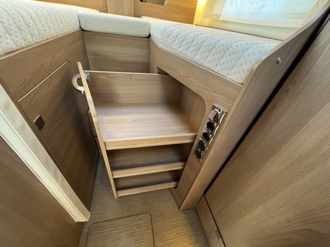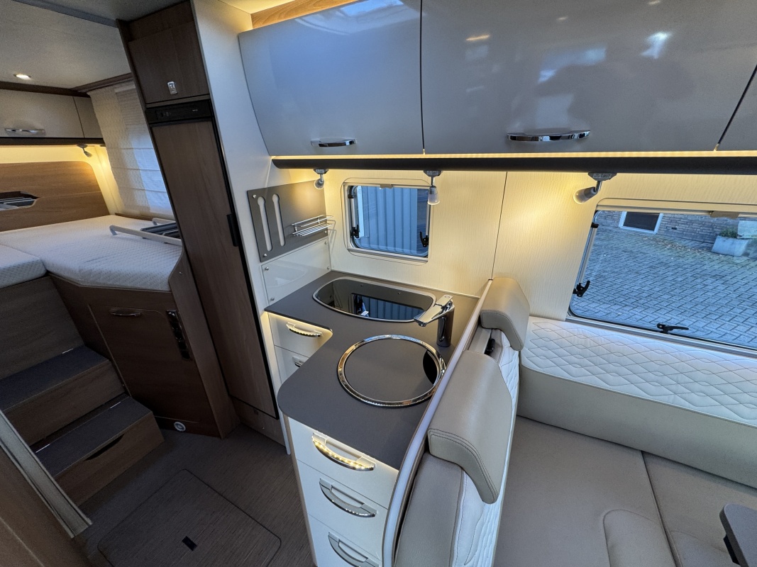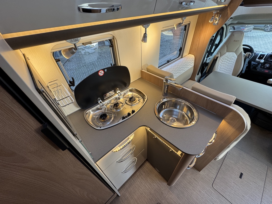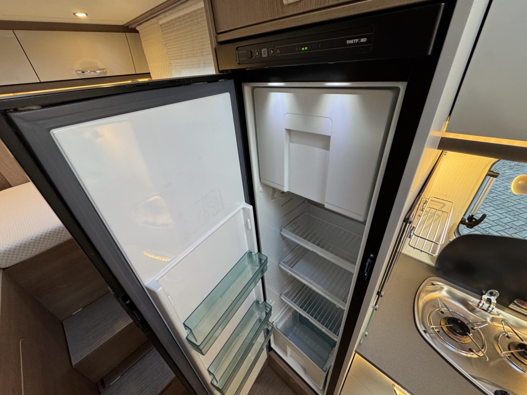 In het midden een L-keuken voorzien van vele gemakken zoals een grote Thetford koelkast met vriezer, een spoelbassin met mengkraan (warm en koud water), veel kastruimte, diepe lades met softclose en een kooktoestel met glasafdekking.