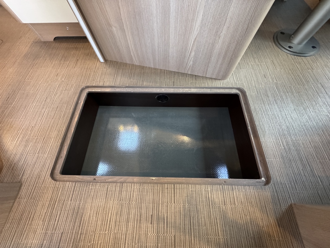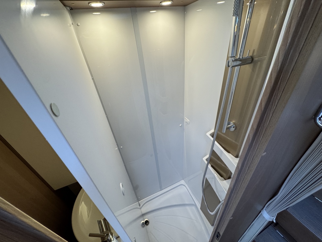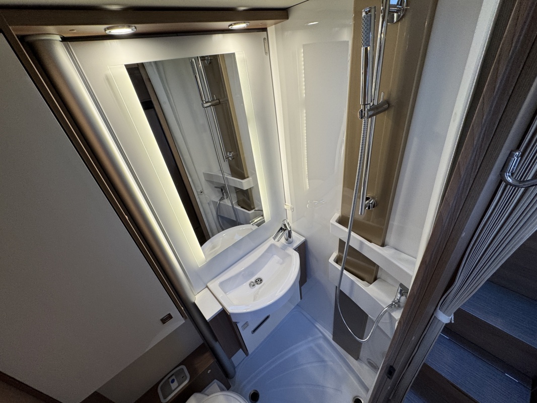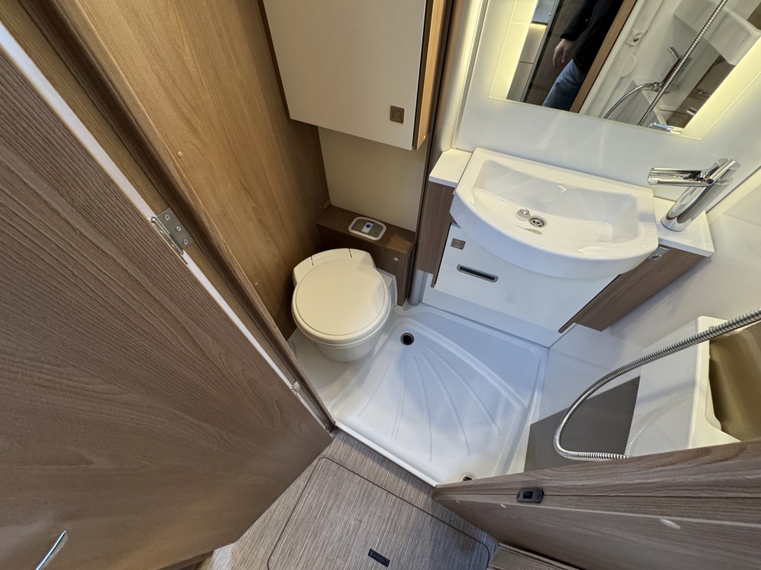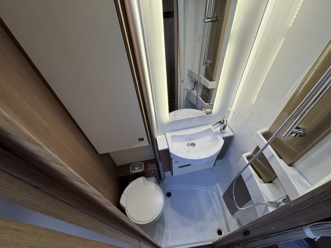Tegenover de keuken is een ruime badkamer met een cassettetoilet, een wastafel met toiletkast en een volwaardige douchecabine. De wastafel is gemonteerd op een draaibare wand waardoor een volwaardige douchecabine word verkregen door het draaien van deze wand! Hierdoor blijft de rest van de ook niet nat door douchewater
