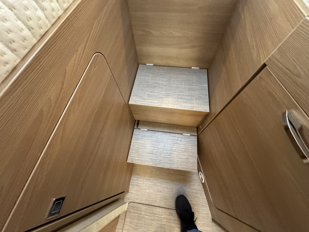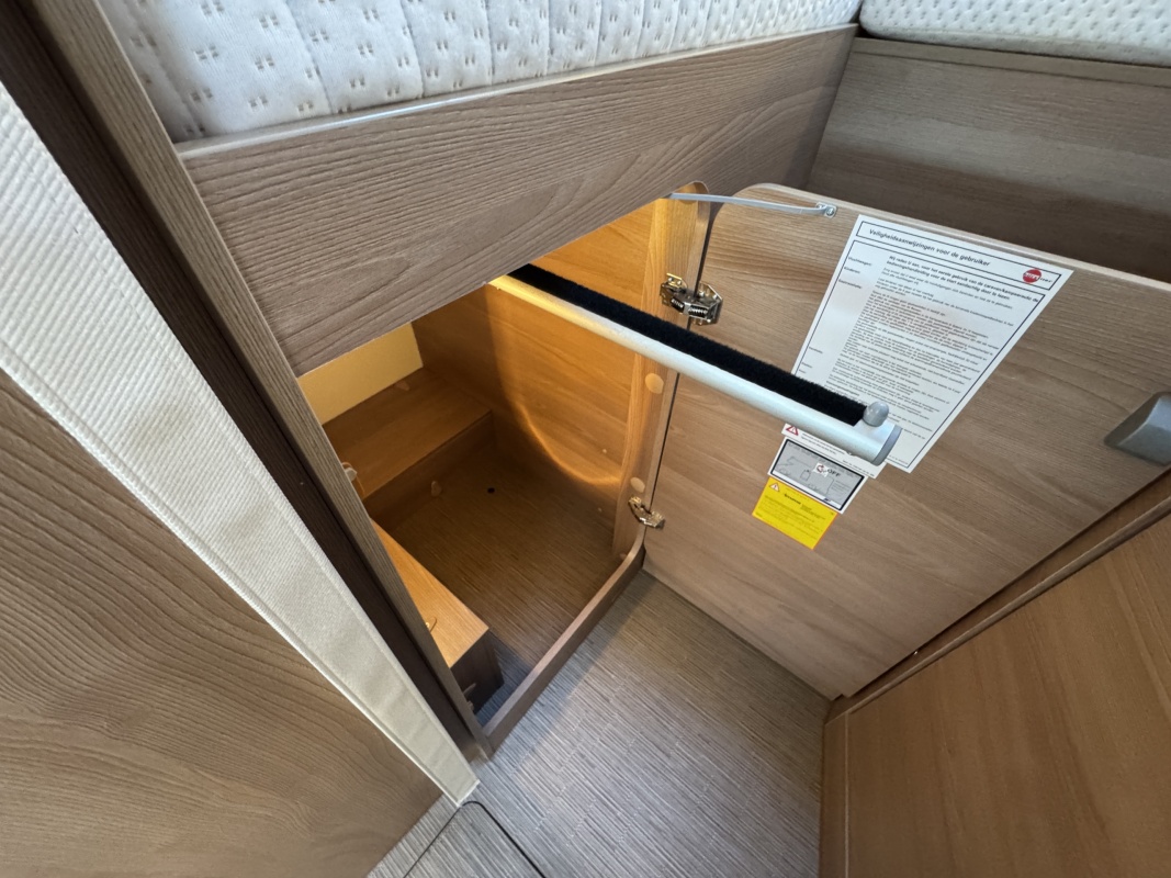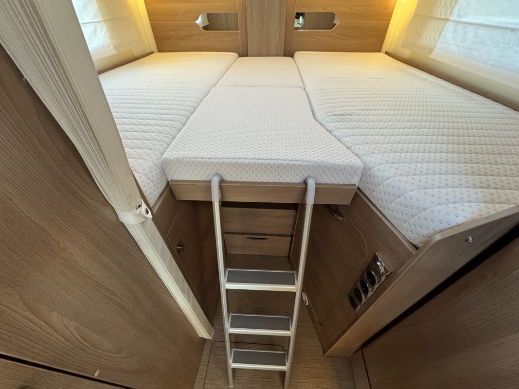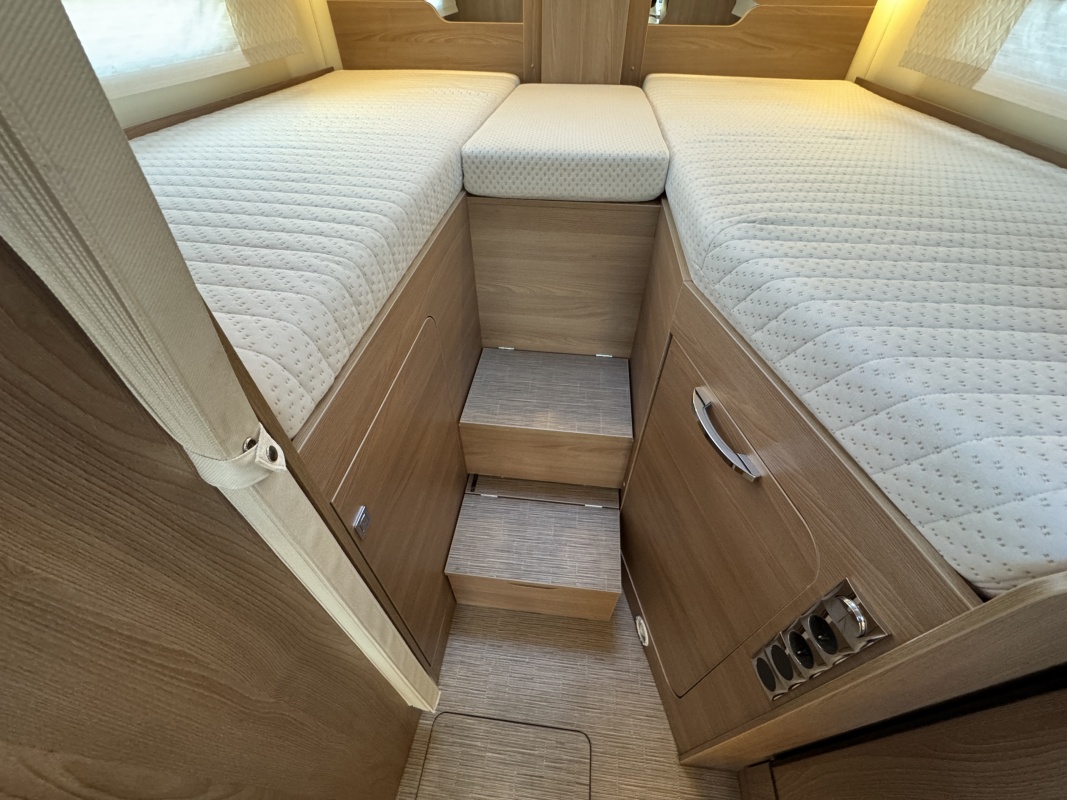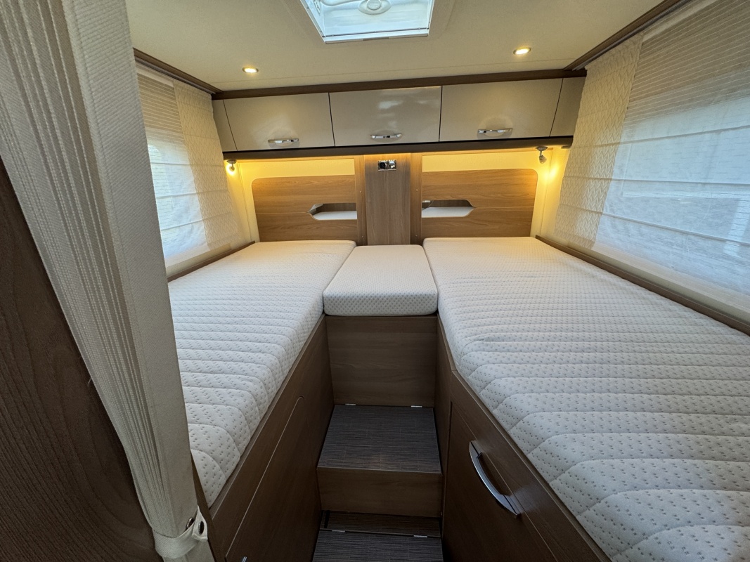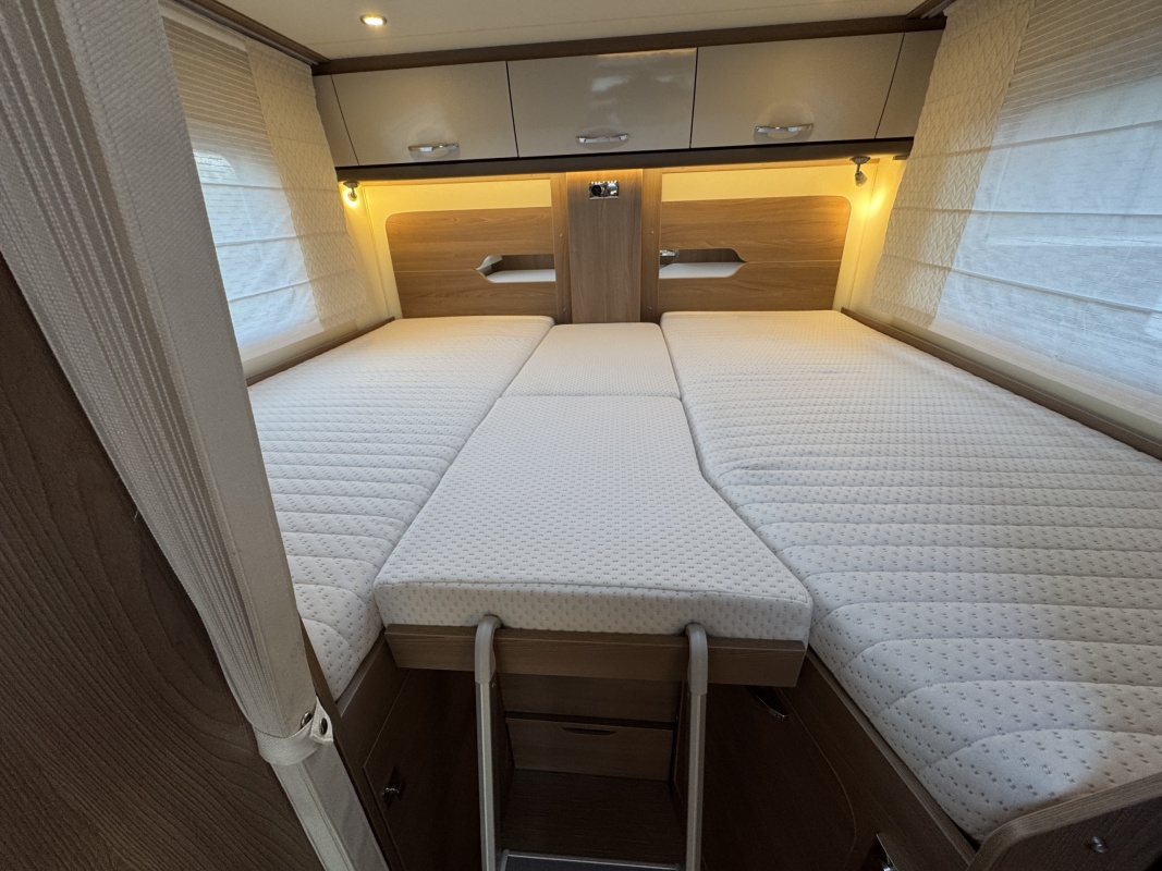 Achterin twee royale lengte bedden met een dikke comfortabele matras en een gemakkelijke instap! De bedden zijn ook samen te voegen tot één groot bed. Onder de bedden is veel kastruimte en een XXL garage!