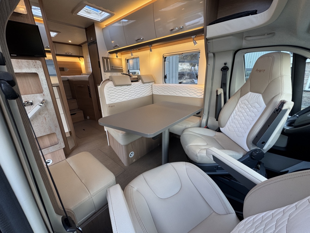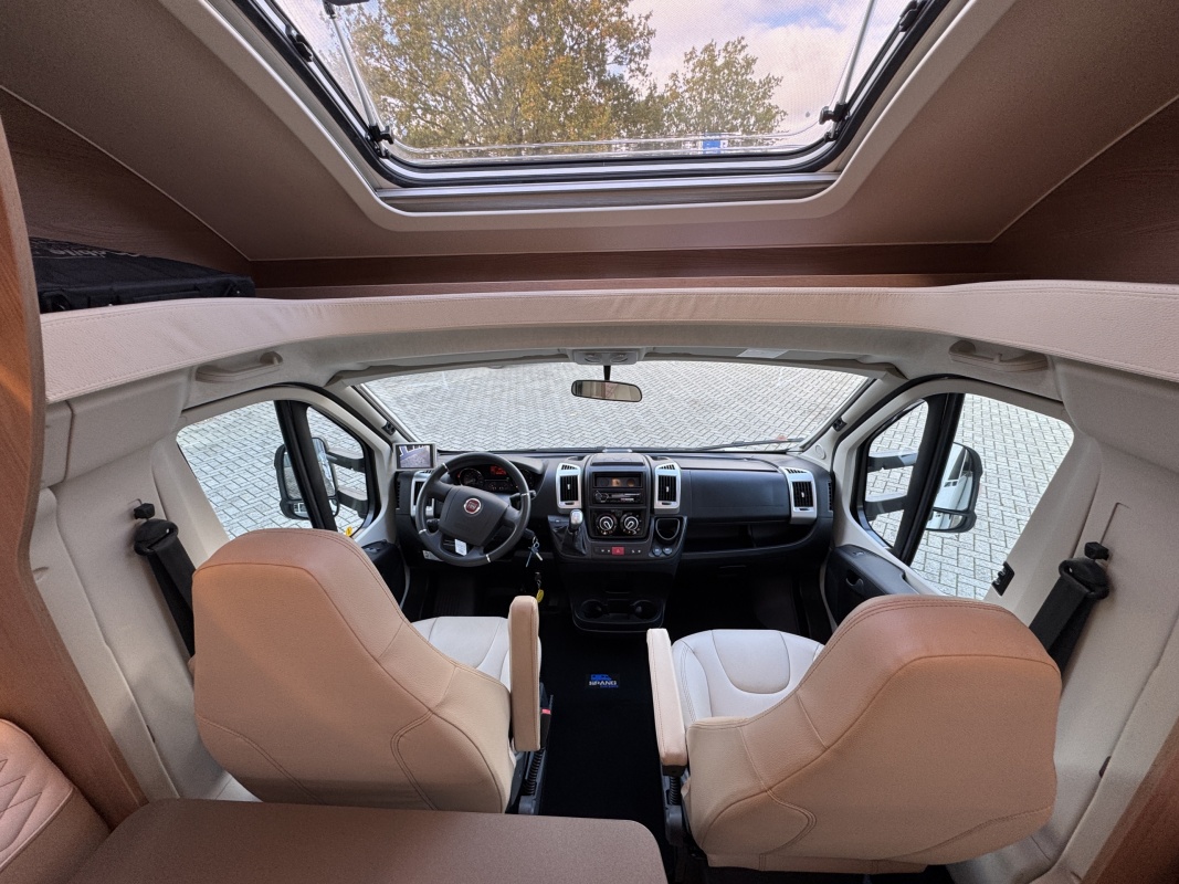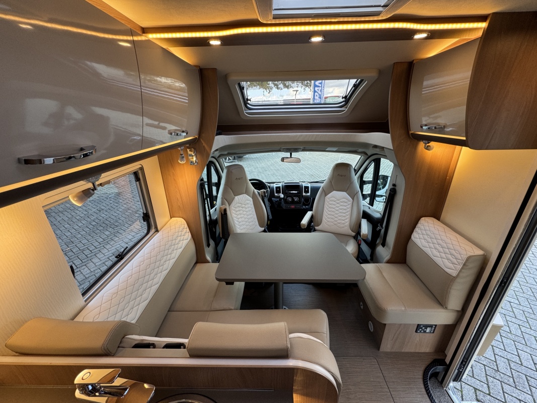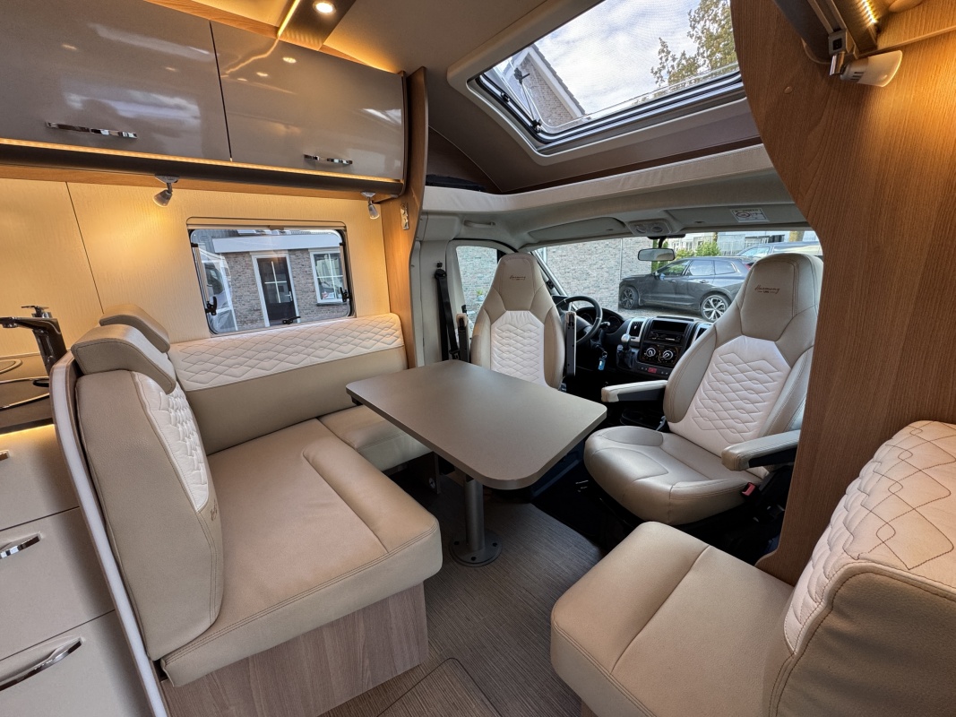 Voorin twee draai- en verstelbare comfortstoelen met daarachter een L-zit en langsbank! Door de voorstoelen te draaien creëert u een ruime en gezellige zitgroep!