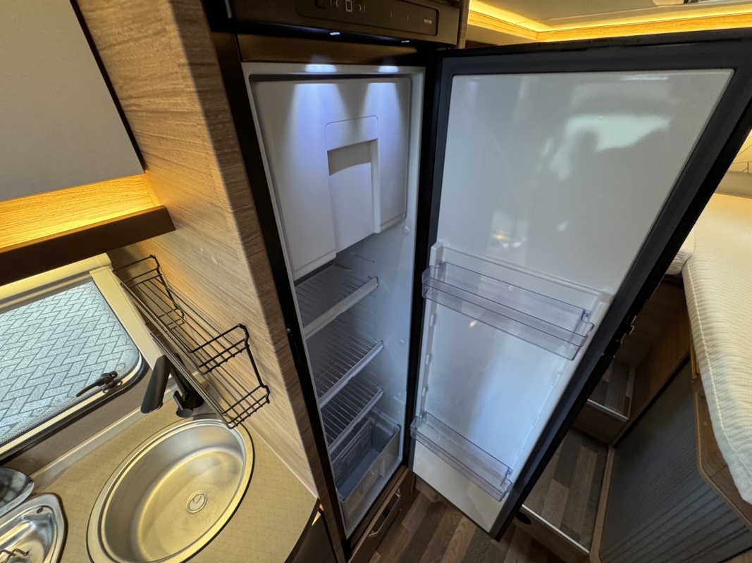 In het midden de keuken welke is uitgerust met een 3 pits kookstoestel, een spoelbassin met mengkraan (warm en koud water), veel kast en opbergruimte en een grote koelkast met grote vriezer.
