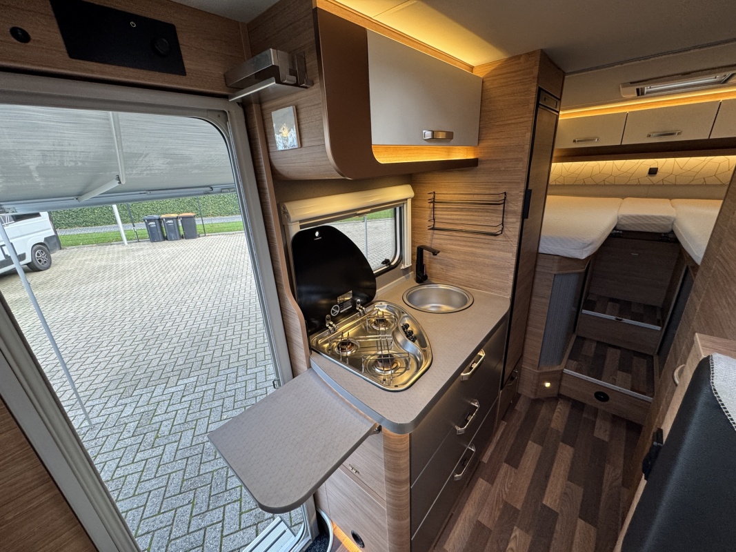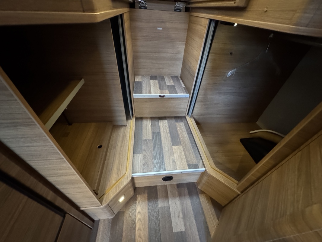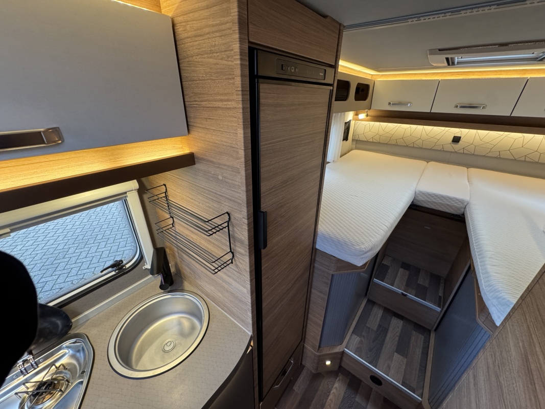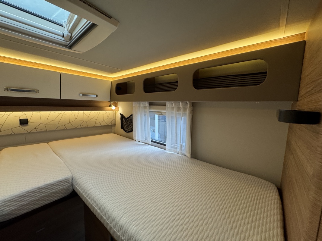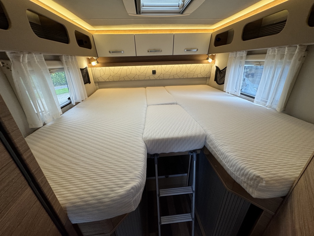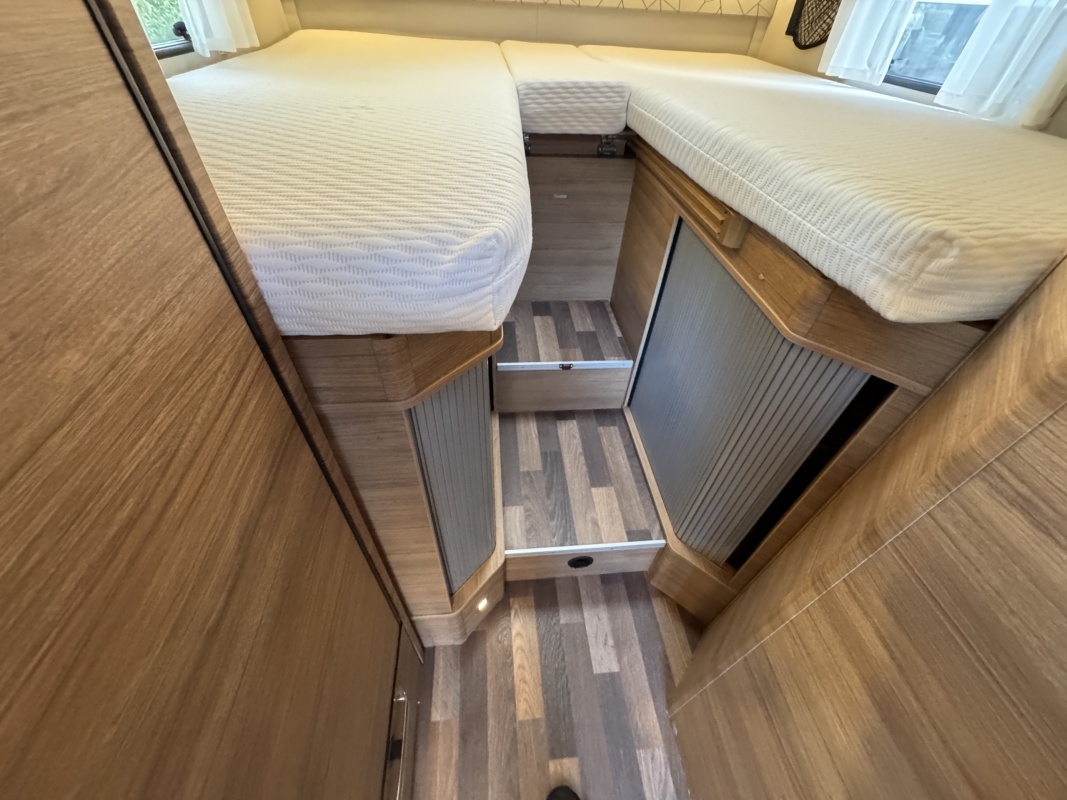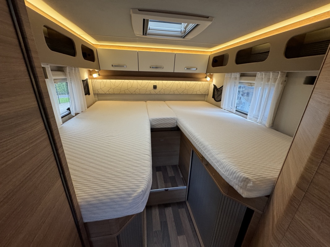 Achterin twee royale enkele bedden met een gemakkelijke instap! De bedden zijn ook samen te voegen tot één groot bed. Onder de bedden is een grote XL garage en veel kastruimte.