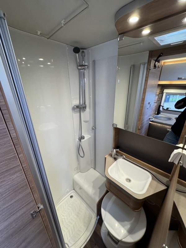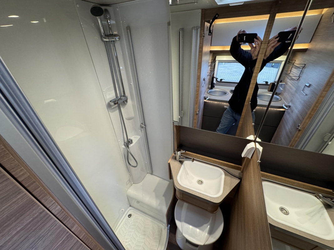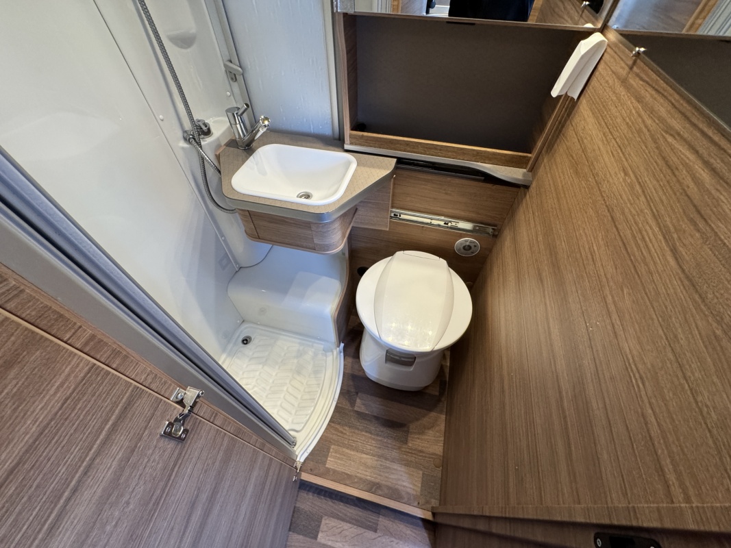 Tegenover de keuken is de natte cel met een Thetford cassettetoilet, een wastafel en een volwaardige douche!