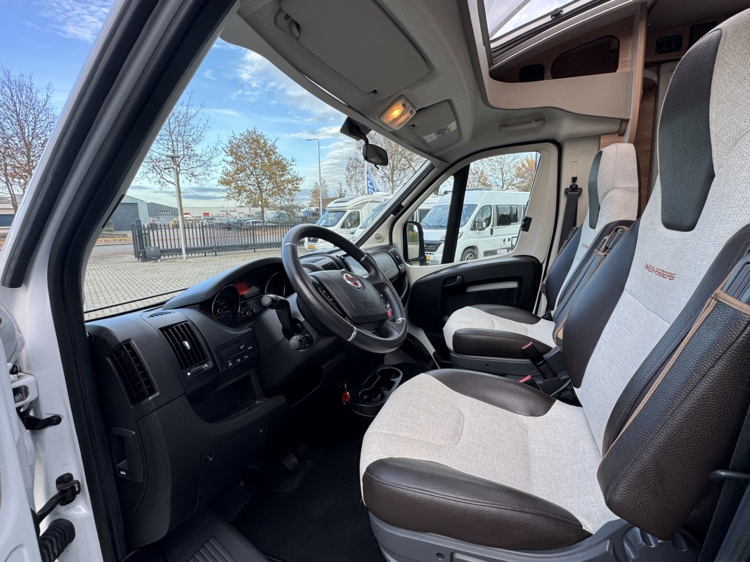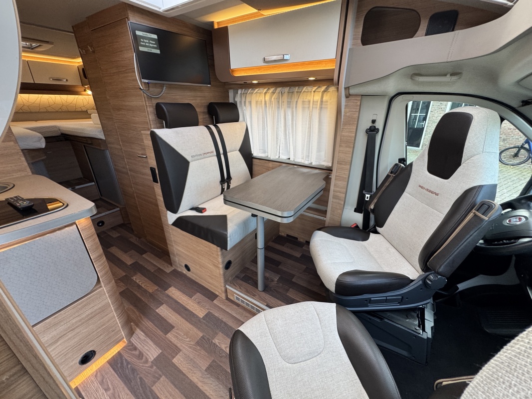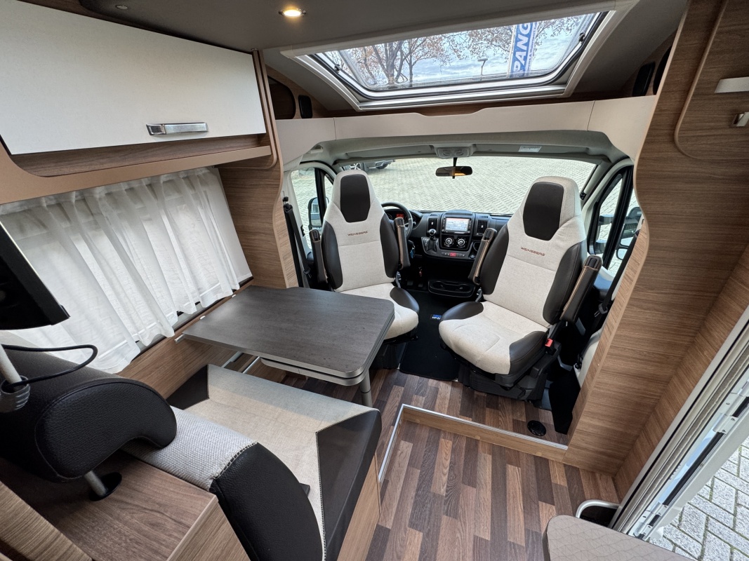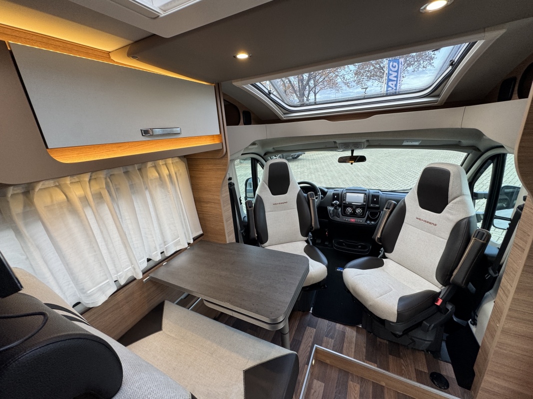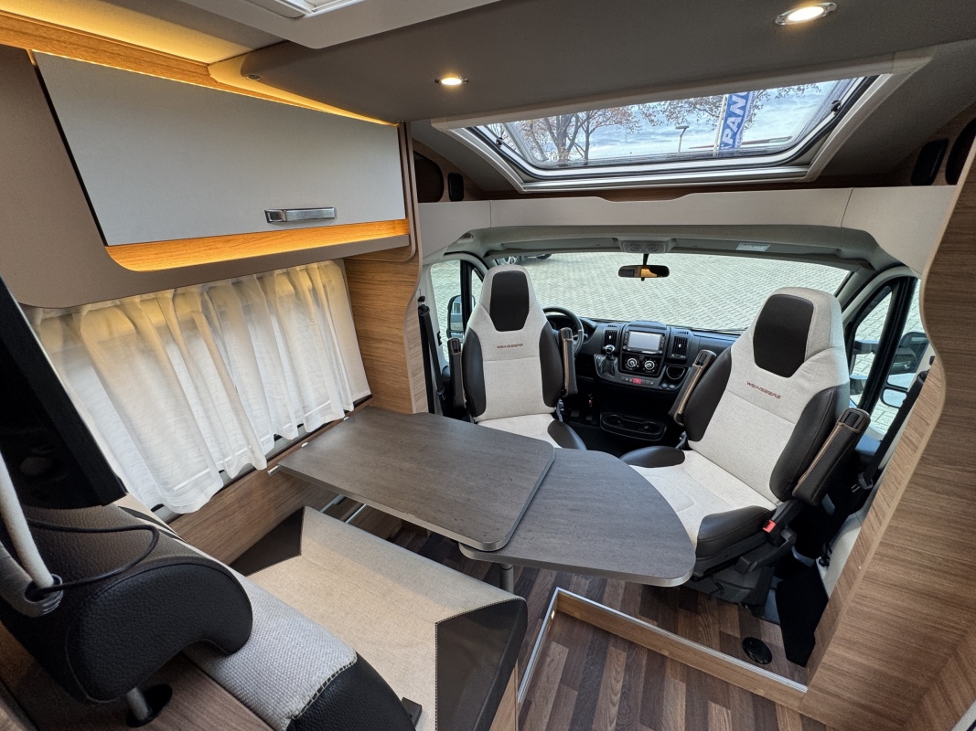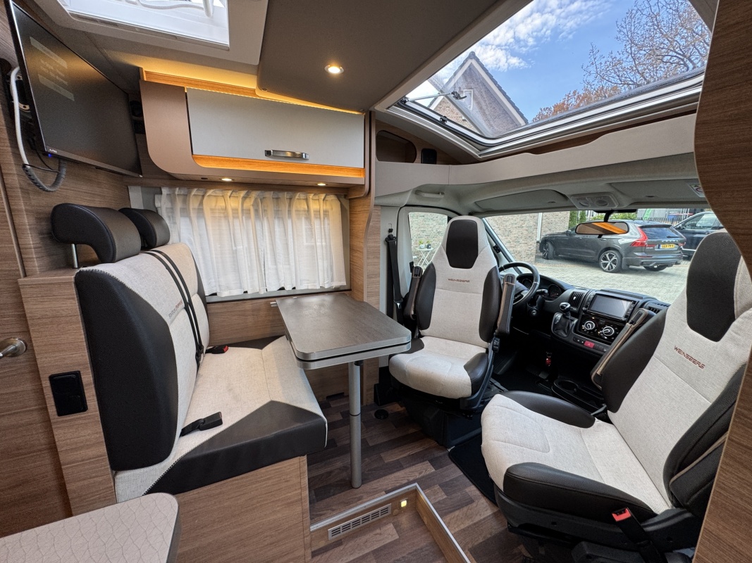 Voorin de cabine staan twee volledig draai-, verstel- en kantelbare comfortstoelen met daarachter een halve dinette met 2 gordelplaatsen. De zitgroep is ook om te leggen tot een extre bed(je)