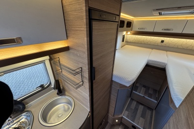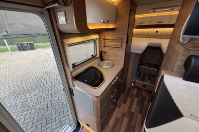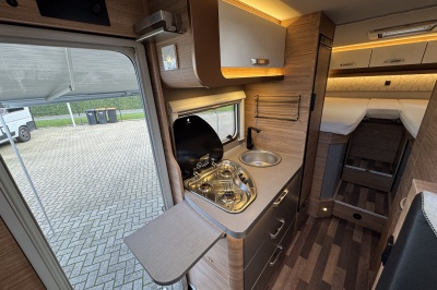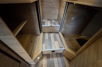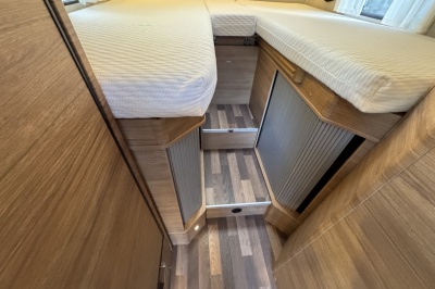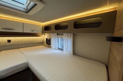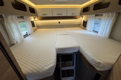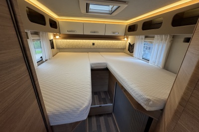 Achterin twee royale enkele bedden met een gemakkelijke instap! De bedden zijn ook samen te voegen tot één groot bed. Onder de bedden is een grote XL garage en veel kastruimte.