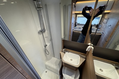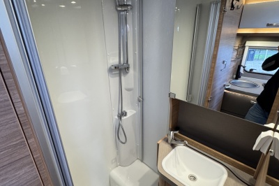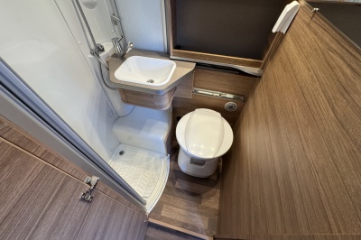 Tegenover de keuken is de natte cel met een Thetford cassettetoilet, een wastafel en een volwaardige douche!