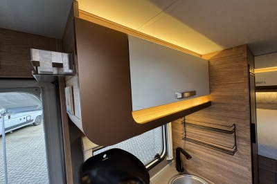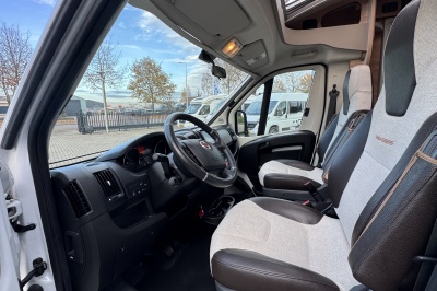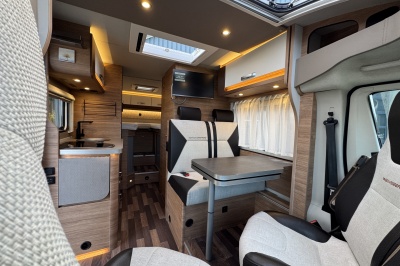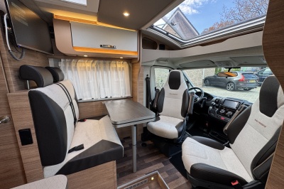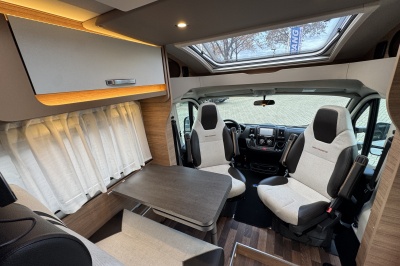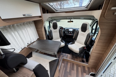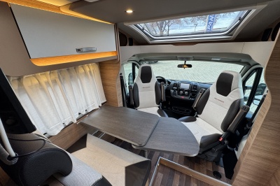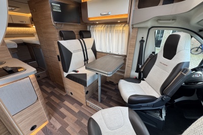 Voorin de cabine staan twee volledig draai-, verstel- en kantelbare comfortstoelen met daarachter een halve dinette met 2 gordelplaatsen. De zitgroep is ook om te leggen tot een extre bed(je)
