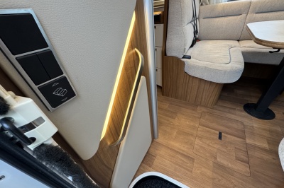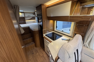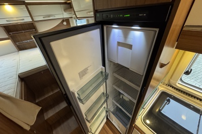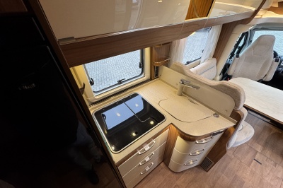 In het midden een L-keuken voorzien van vele gemakken zoals een grote Thetford koelkast met vriezer, een spoelbassin met mengkraan (warm en koud water), veel kastruimte, diepe lades met softclose en een kooktoestel met glasafdekking.