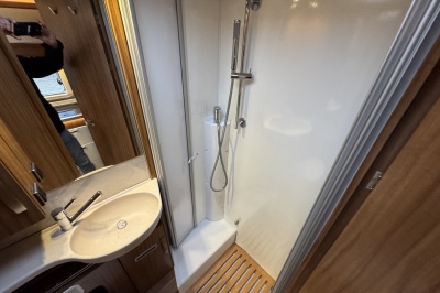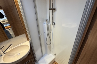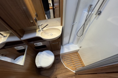 Tegenover de keuken is de toiletruimte met cassettetoilet, wastafel en douche gesitueerd! Uniek hieraan is de draaibare wand waarop de wastafel is geplaatst, door deze wand te draaien creëert u een volwaardige douchecabine zonder de gehele badkamer nat te maken!
