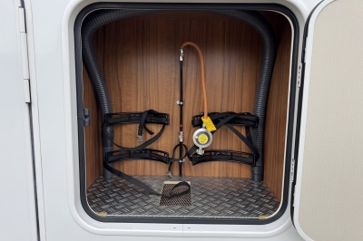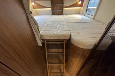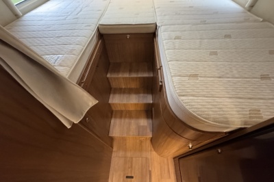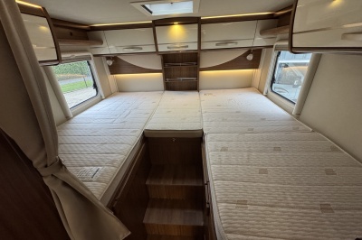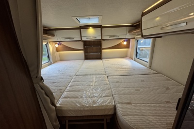Achterin twee royale lengte bedden met een dikke comfortabele matras en een gemakkelijke instap! De bedden zijn ook samen te voegen tot één groot bed. Onder de bedden is veel kastruimte en een XXL garage
