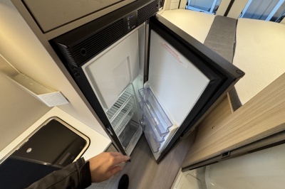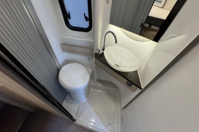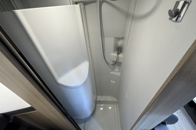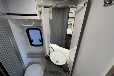 Tegenover de keuken is de natte cel met een Thetford cassettetoilet, wastafel en een volwaardige douche! De wastafel is gemonteerd op een unieke draaibare wand. Door deze te draaien wordt een prachtige douchecabine gecreëerd.