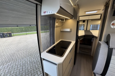 In het midden de keuken welke is uitgerust met een spoelbassin met mengkraan (warm en koud water), een koelkast met vriezer, veel kast en opbergruimte, lades met softclose en een kooktoestel spoelbassin met glasafdekking.