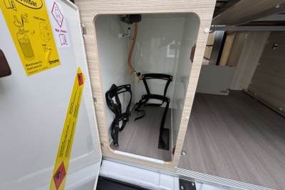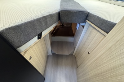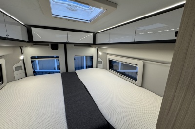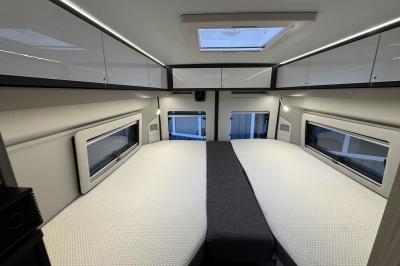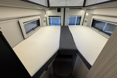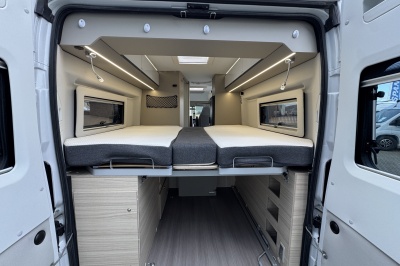 Achterin twee royale enkele bedden met een gemakkelijke instap. Boven de bedden is veel kastruimte en eronder een enorme garage en ook aparte kasten en lades. De bedden zijn eenvoudig omhoog te klappen voor een grote transportruimte.