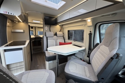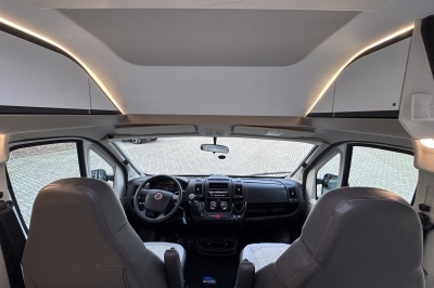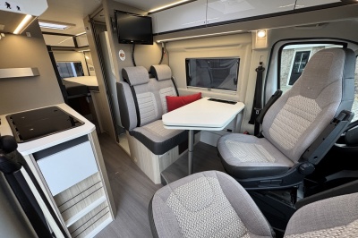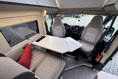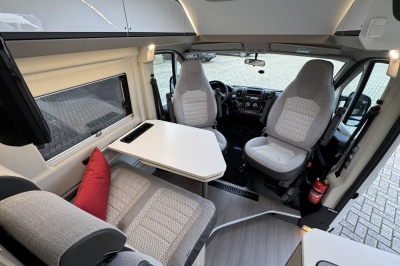Voorin de cabine twee luxe draai-, verstel- en kantelbare comfortstoelen met armleuning. Achter de voorstoelen is een brede twee persoons bank met verschuifbare tafel.