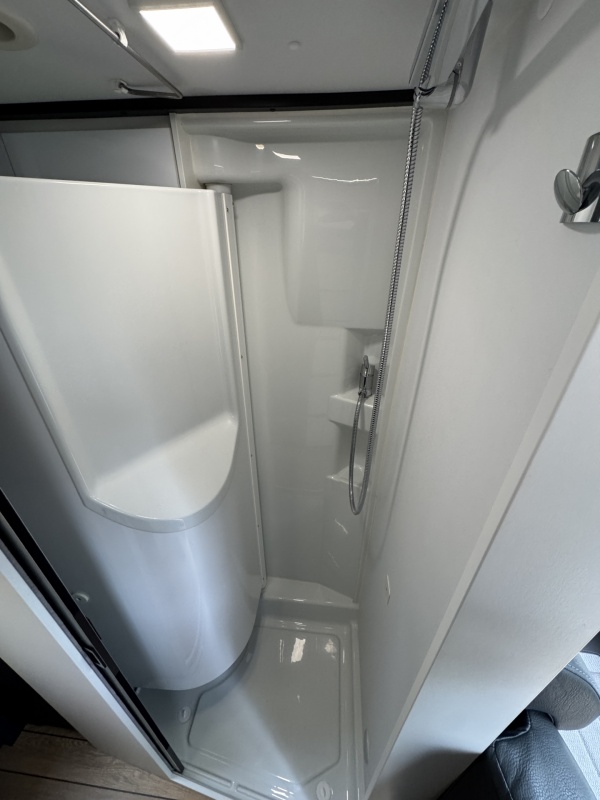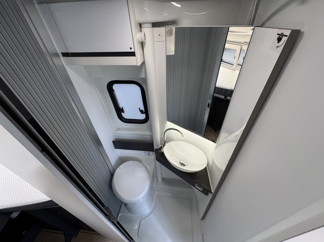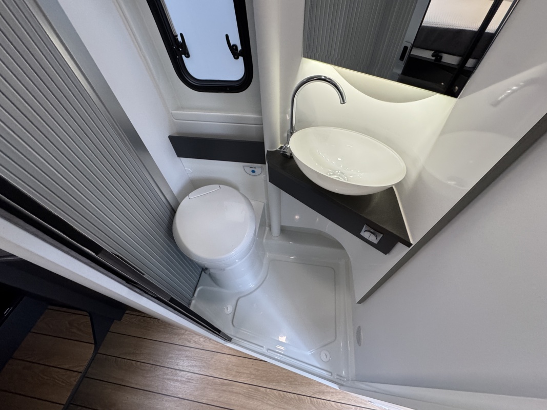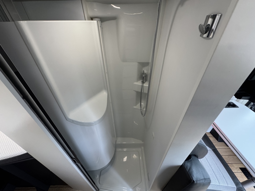 Tegenover de keuken is de natte cel met een Thetford cassettetoilet, wastafel en een volwaardige douche! De wastafel is gemonteerd op een unieke draaibare wand. Door deze te draaien wordt een prachtige douchecabine gecreëerd.