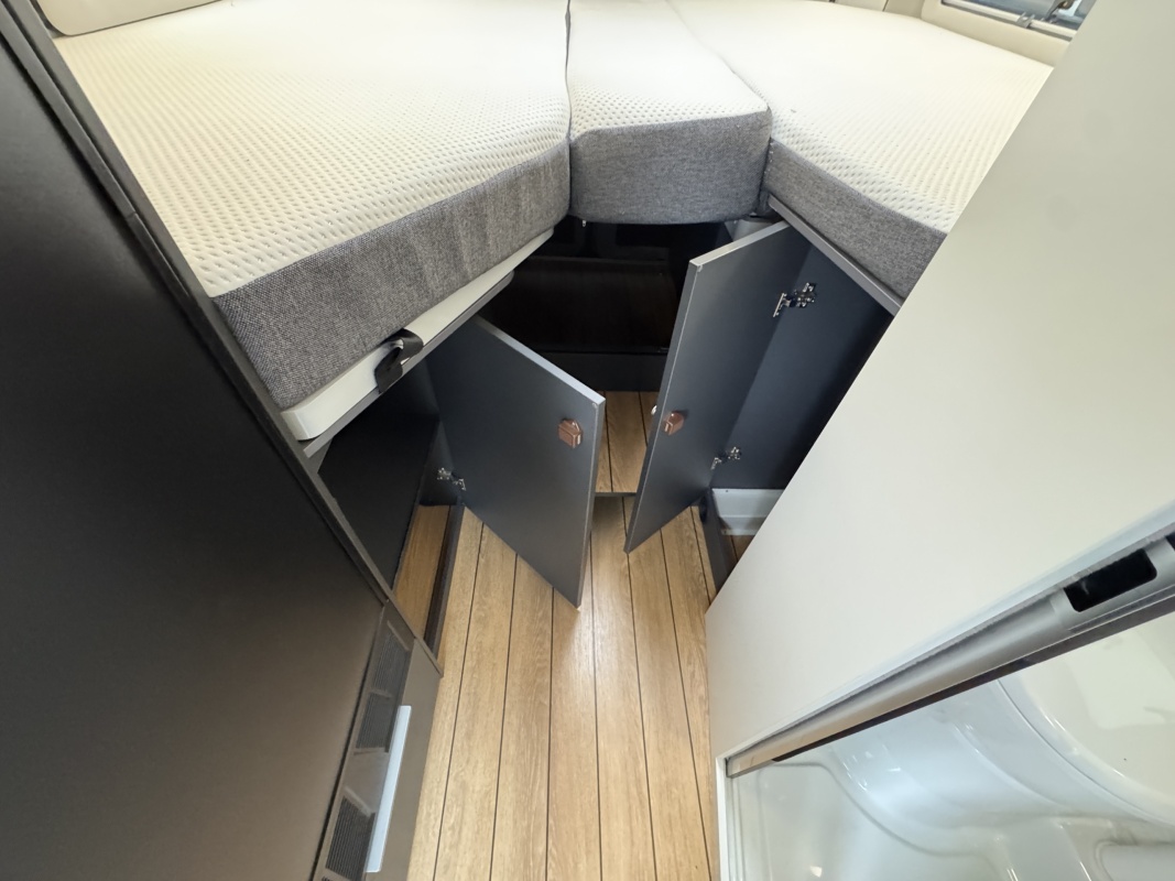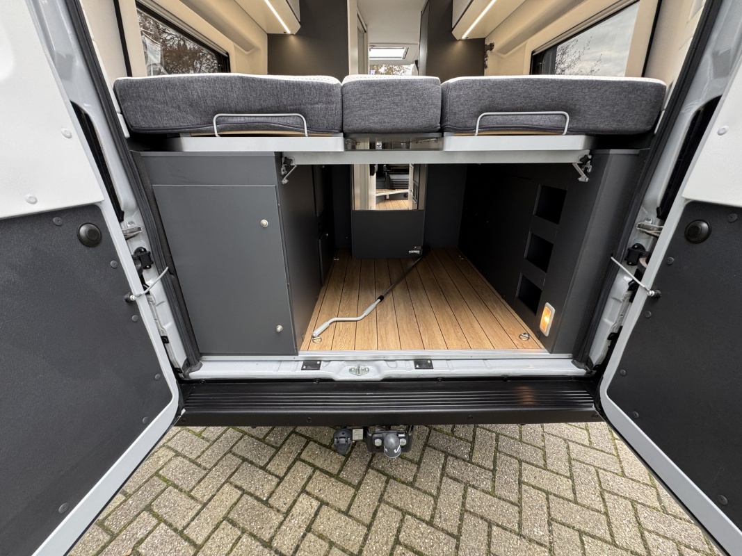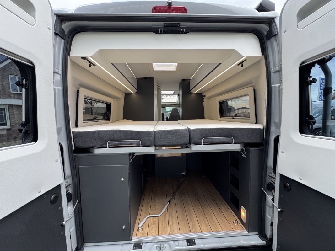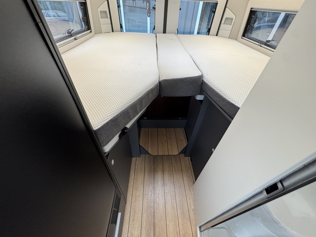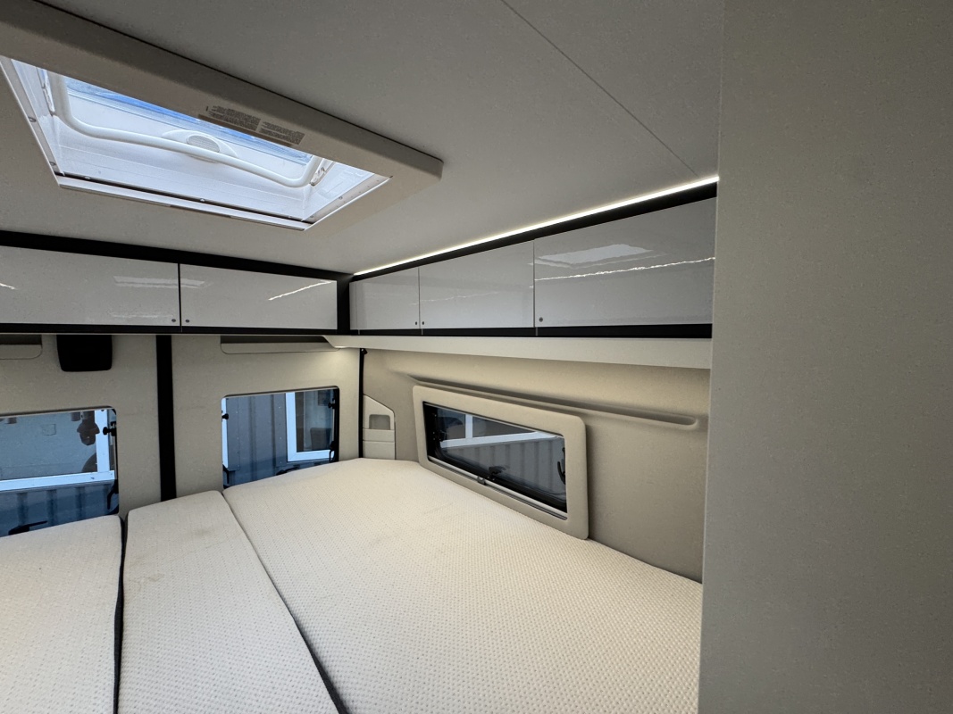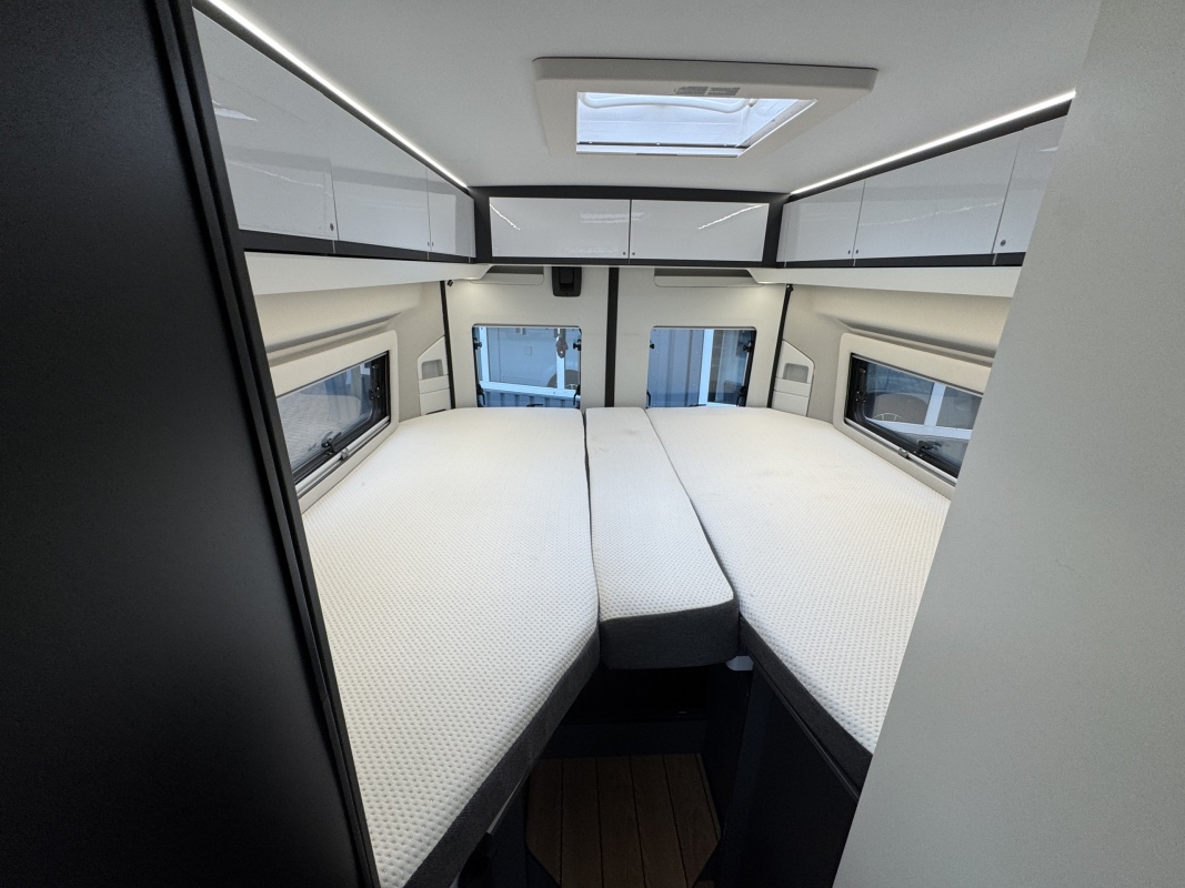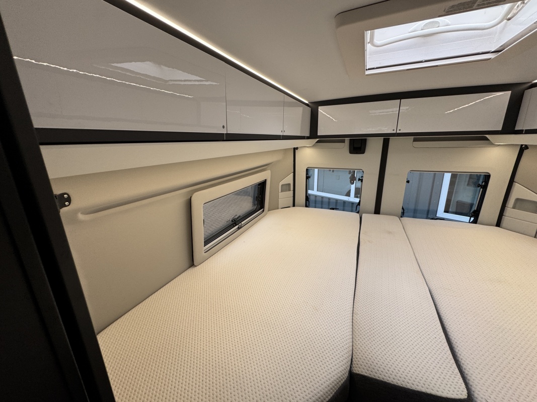 Achterin twee royale enkele bedden met een gemakkelijke instap. Boven de bedden is veel kastruimte en eronder een enorme garage en ook aparte kasten en lades. De bedden zijn eenvoudig omhoog te klappen voor een grote transportruimte.