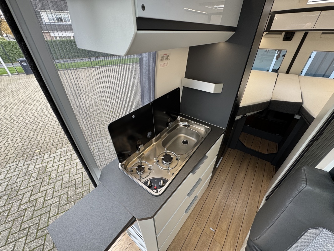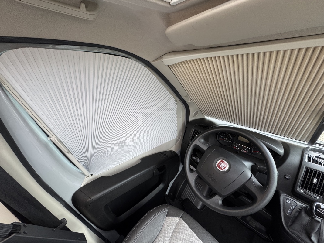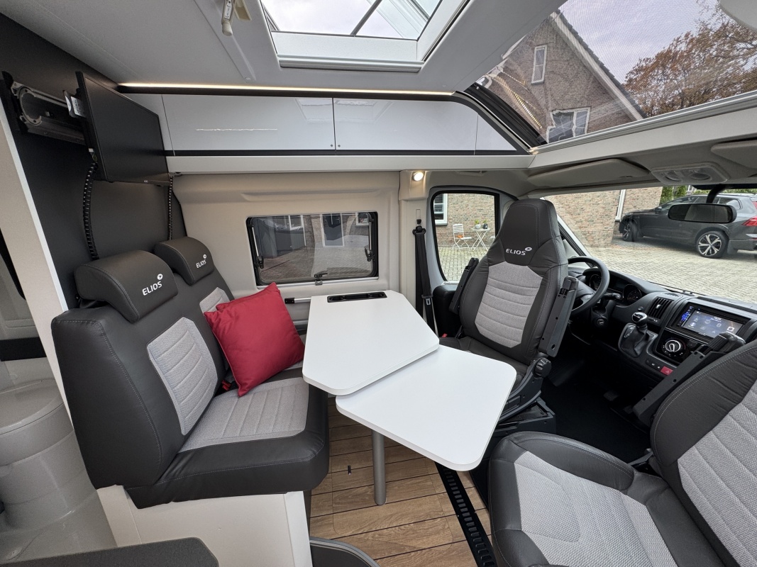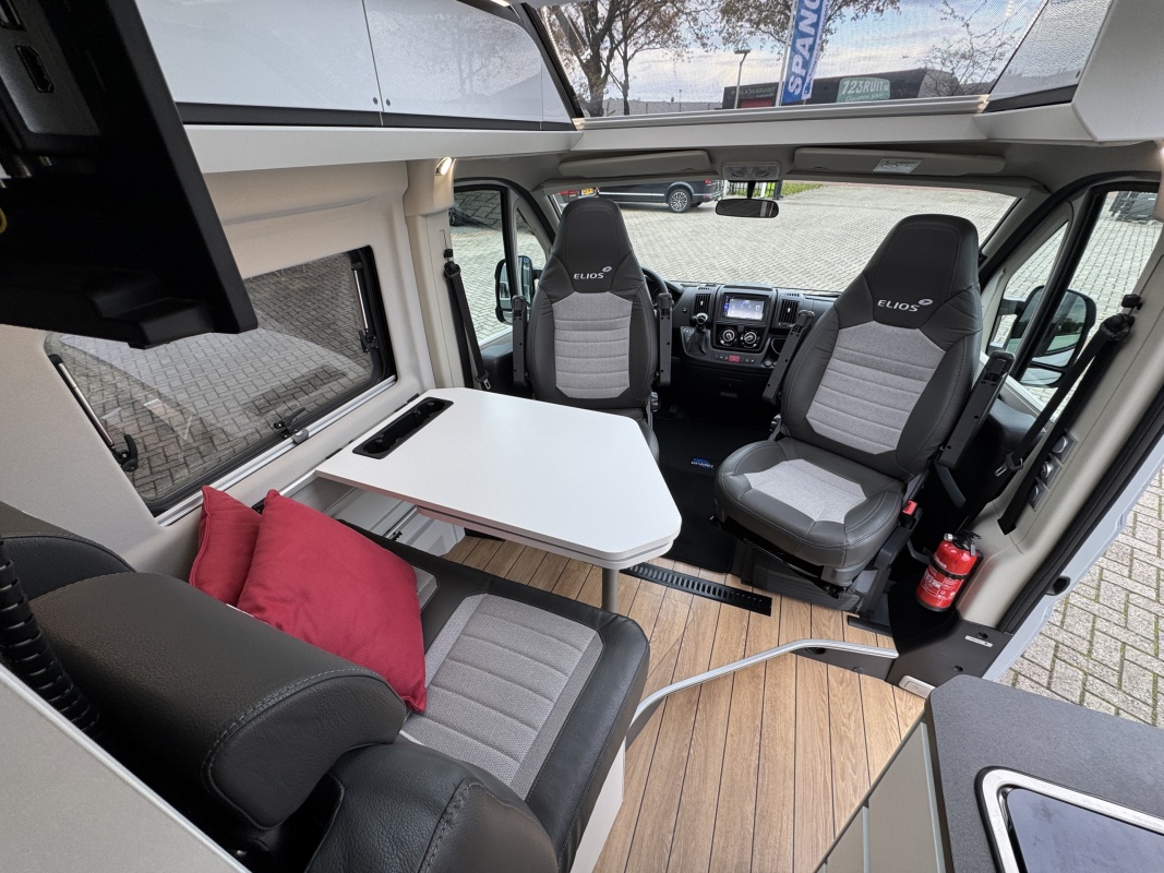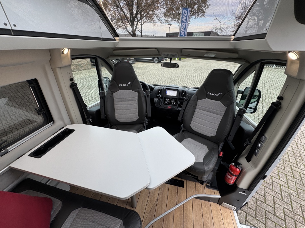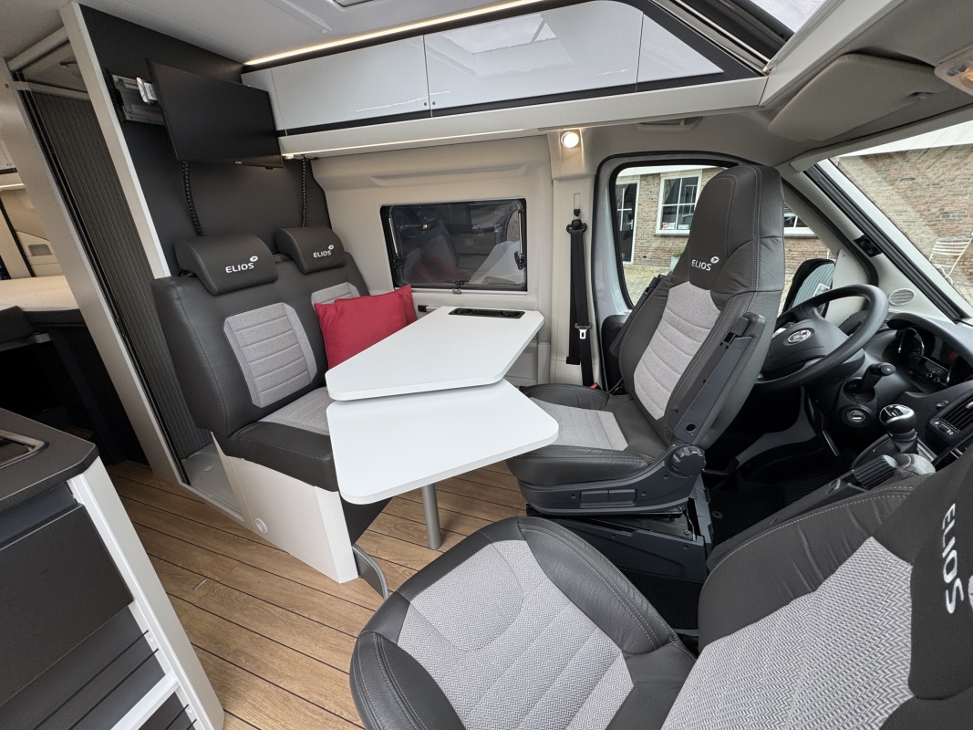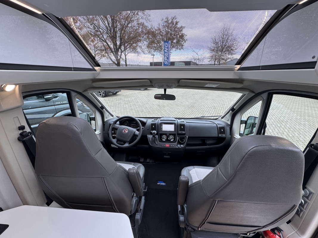 Voorin de cabine twee luxe draai-, verstel- en kantelbare comfortstoelen met armleuning. Daarboven een grote skyroof welke veel licht en ruimte gevoel in de camper geeft. Achter de voorstoelen is een brede twee persoons bank met verschuifbare tafel.