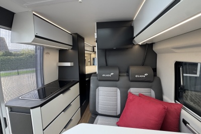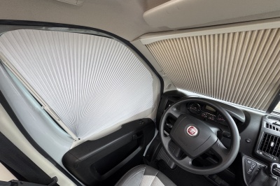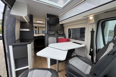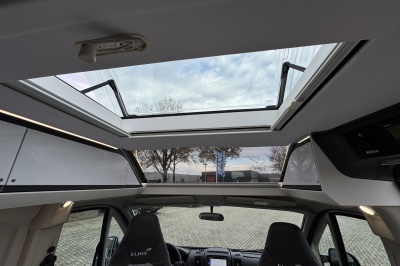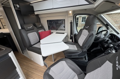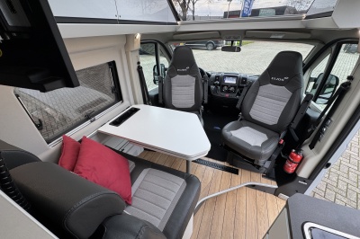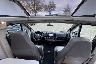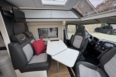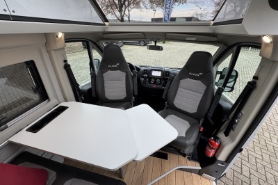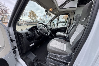 Voorin de cabine twee luxe draai-, verstel- en kantelbare comfortstoelen met armleuning. Daarboven een grote skyroof welke veel licht en ruimte gevoel in de camper geeft. Achter de voorstoelen is een brede twee persoons bank met verschuifbare tafel.